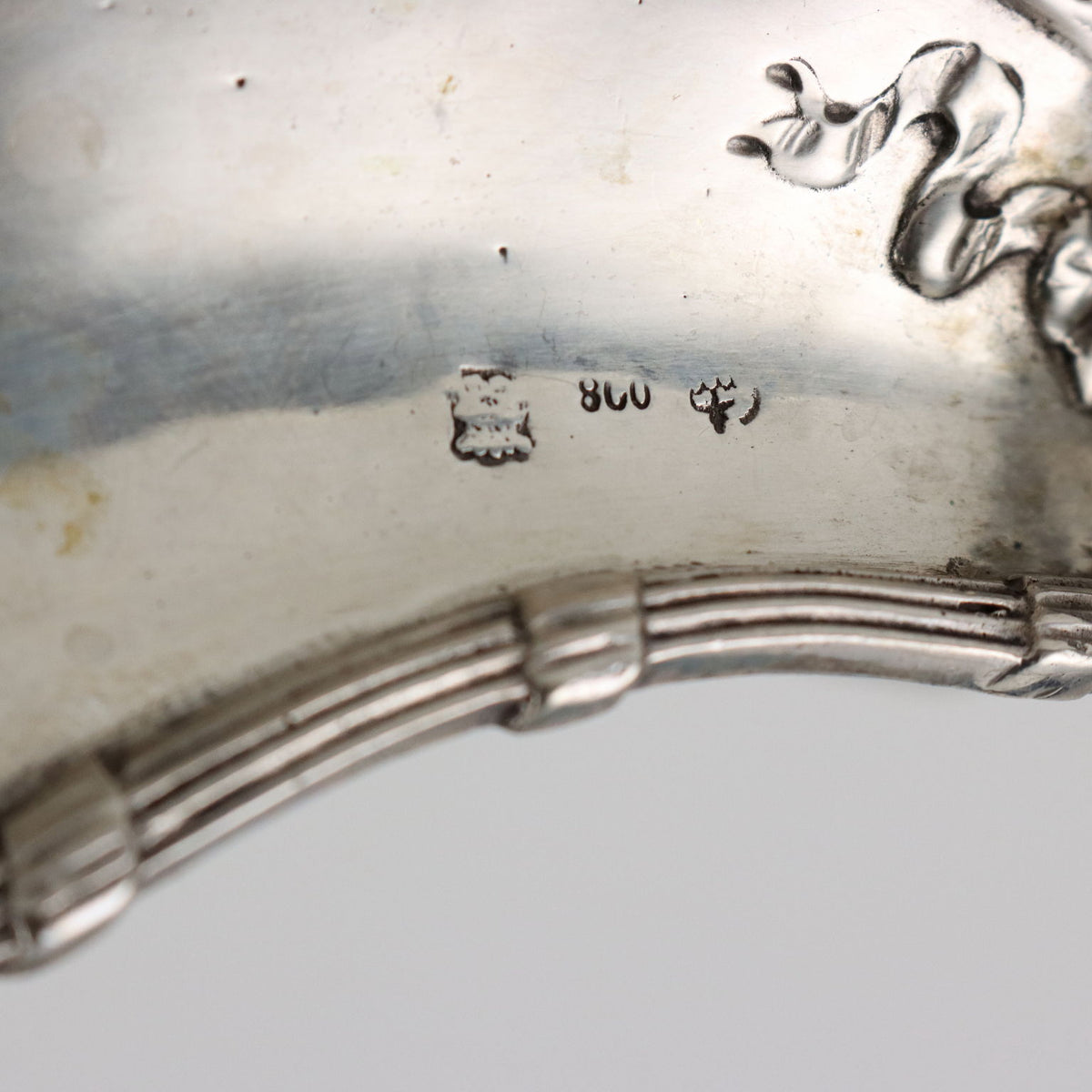 Pair of silver gravy boats in neoclassical style, decoration in relief chiseled and embossed with laurel festoons, ribbons and medallions depicting the face of a nobleman. Engraved silver and silversmith's marks. Gr. 1126 Table sets, , collector's articles, ancient objects, table plates.
