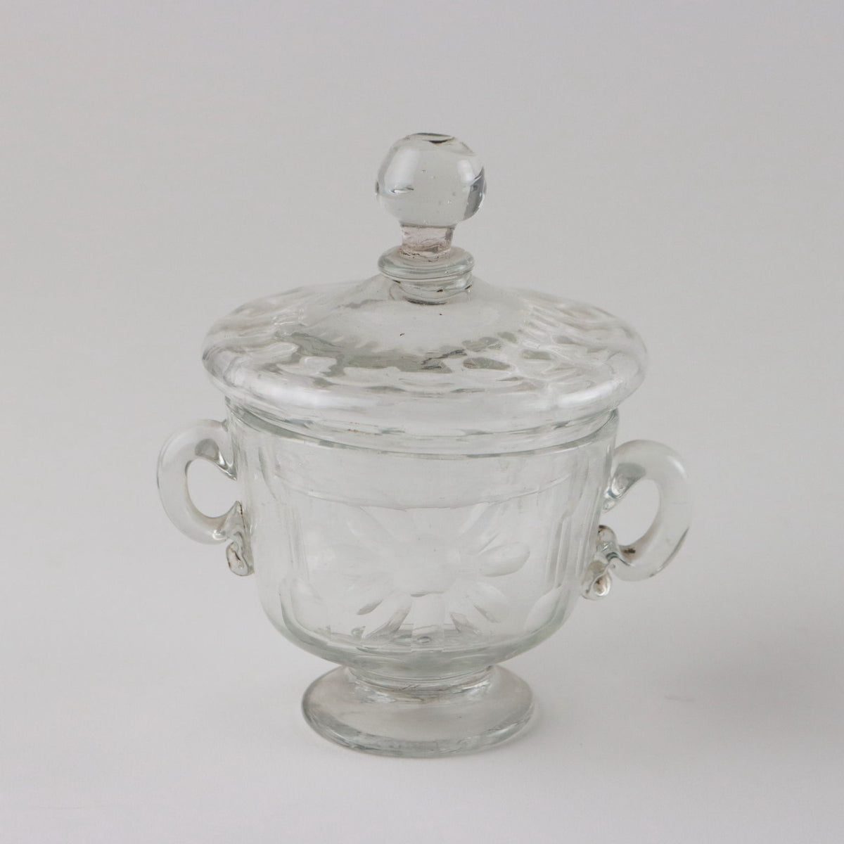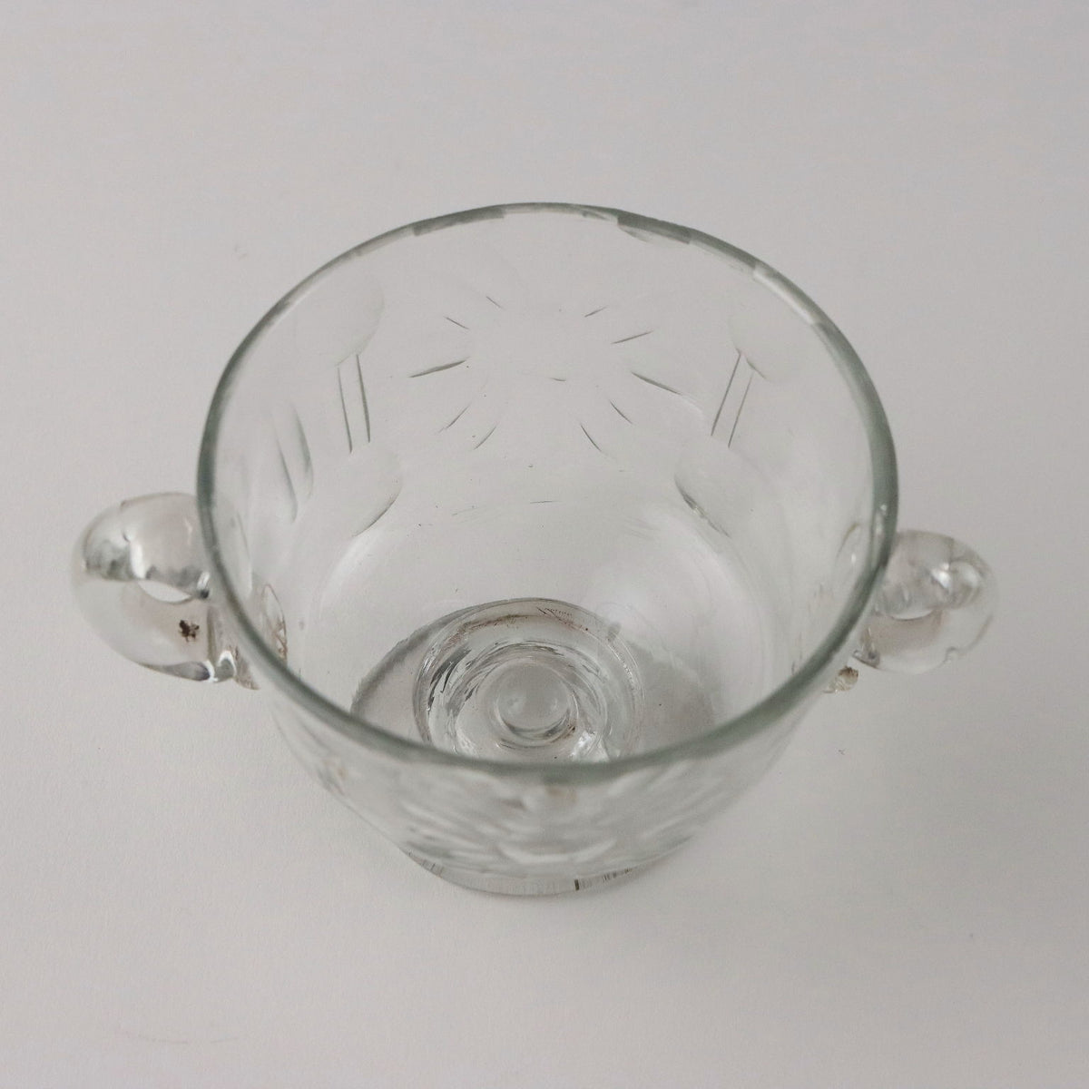 Cup and small vase in cut Murano glass, Murano 18th century. Both made of colorless glass, although of different shapes, have applied handles and beveled decorations. The cup has a ground flower decoration. Ancient glasses, , vases, service.