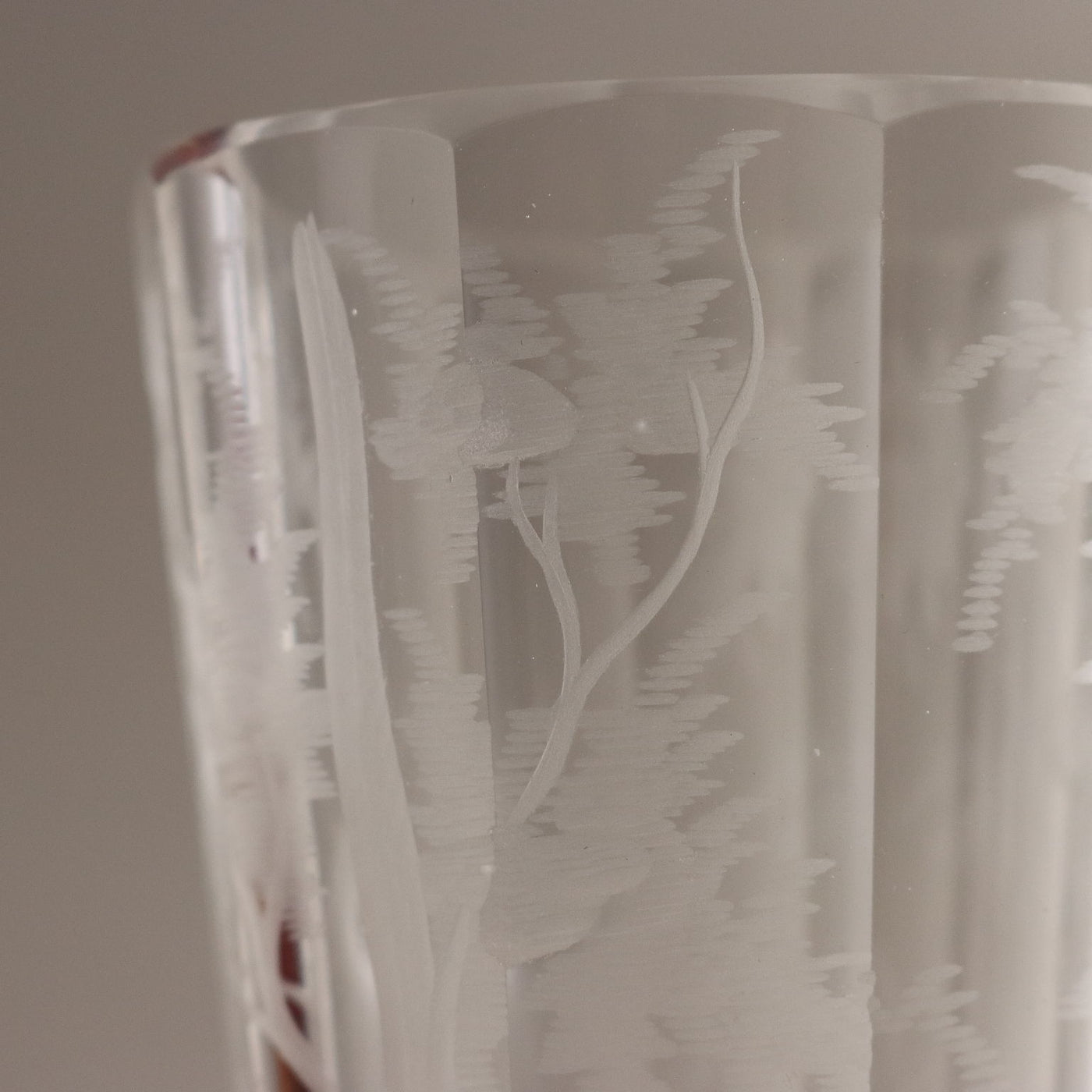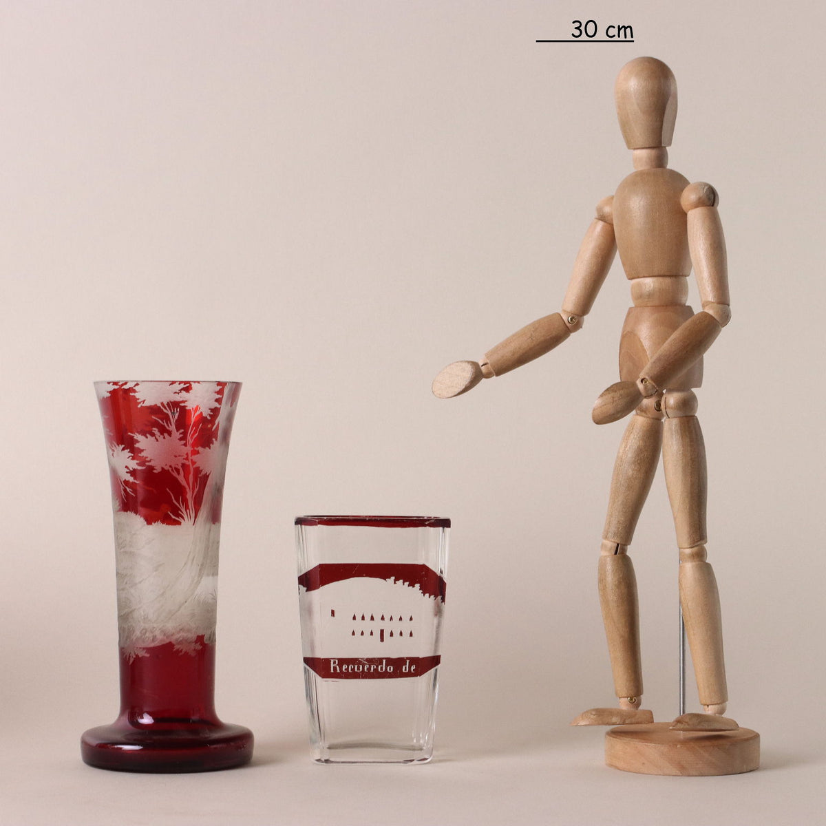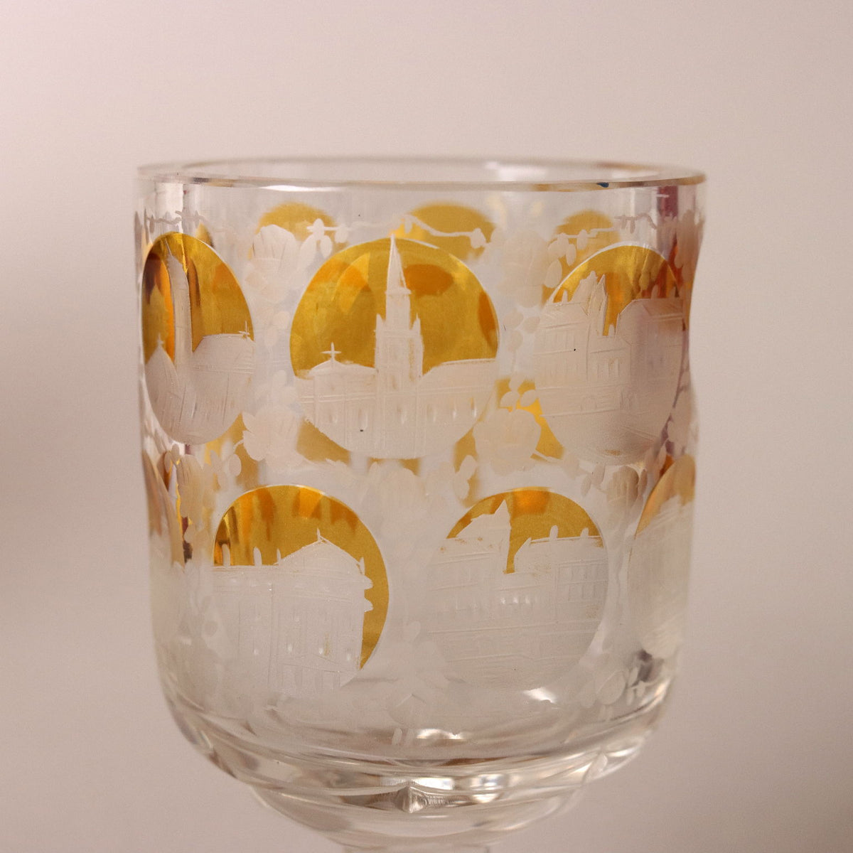 Group of seven glasses in cut and engraved glass of different manufactures, shapes and colours. Ancient objects, , collector's articles, candle-holder.