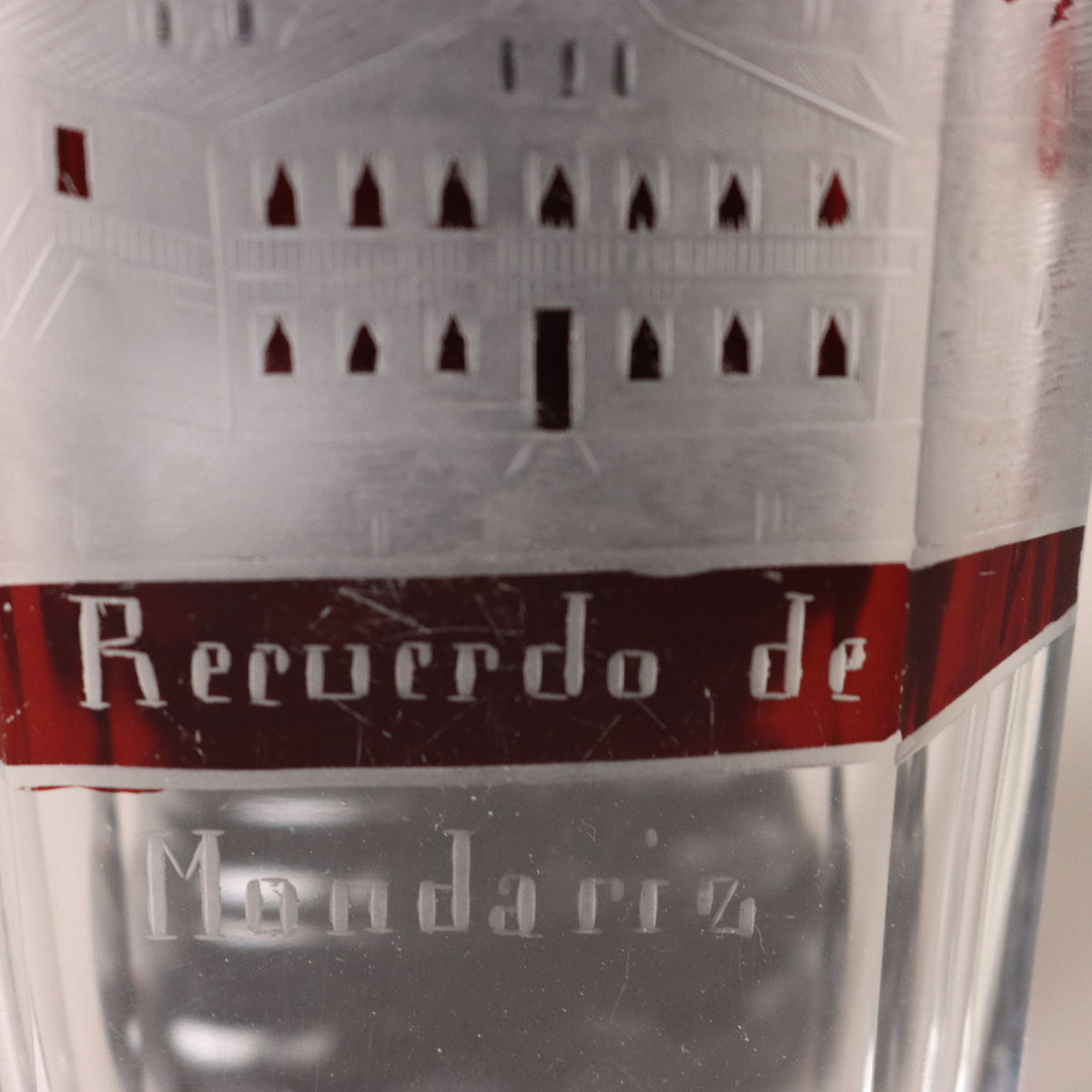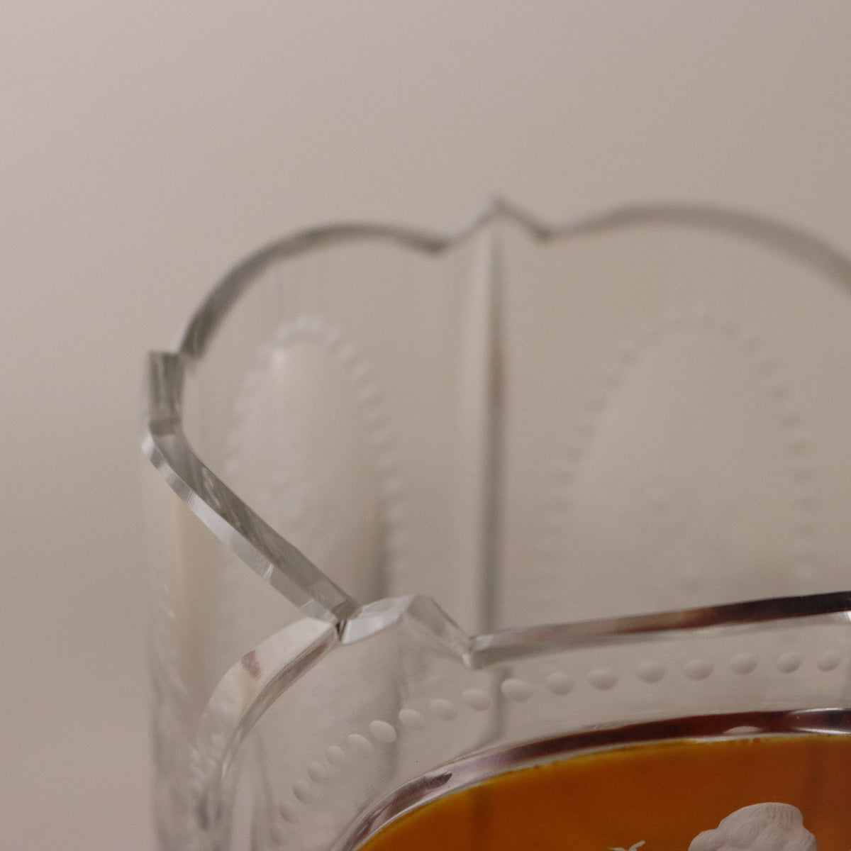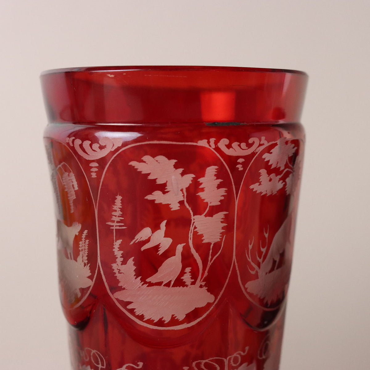Group of seven glasses in cut and engraved glass of different manufactures, shapes and colours. Ancient objects, , collector's articles, candle-holder.