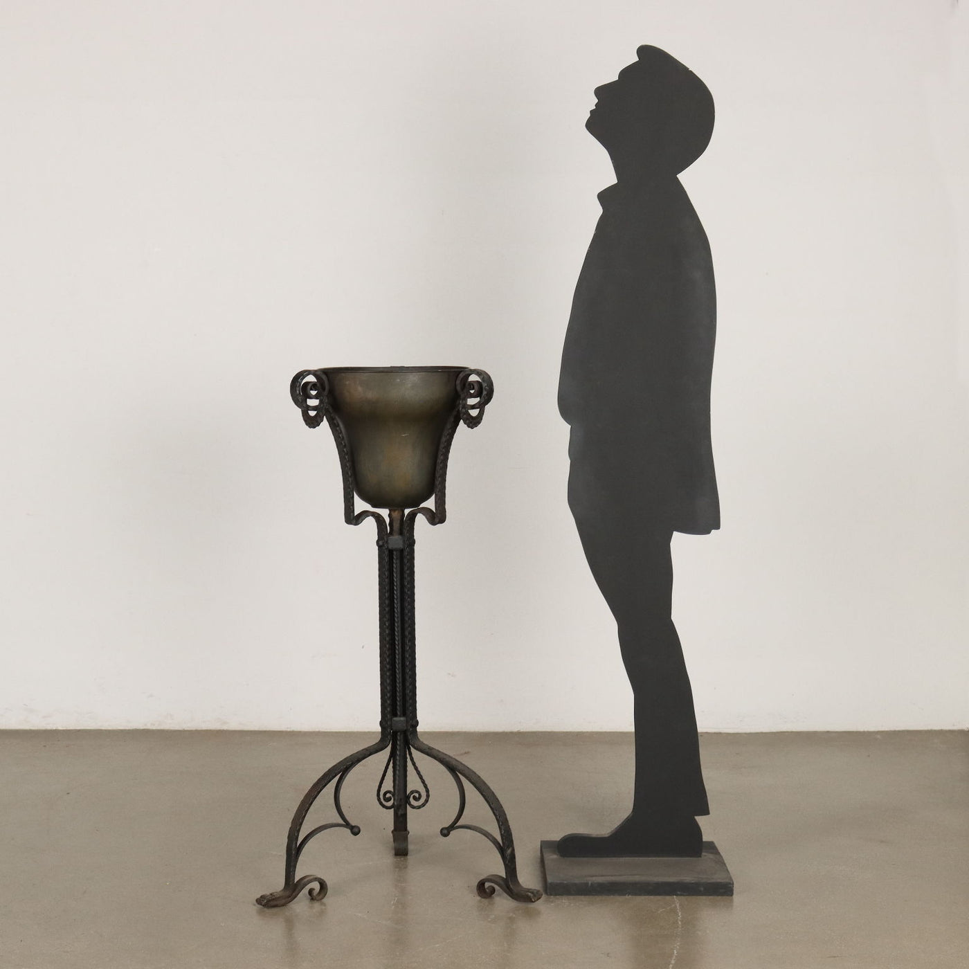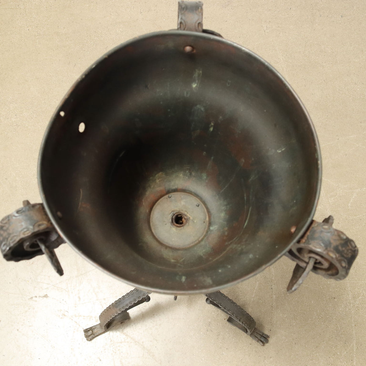 Wrought iron vase holder with feral-shaped feet and repeated motif decorations. Copper vase. Ancient objects, , collector's articles, candle-holder.