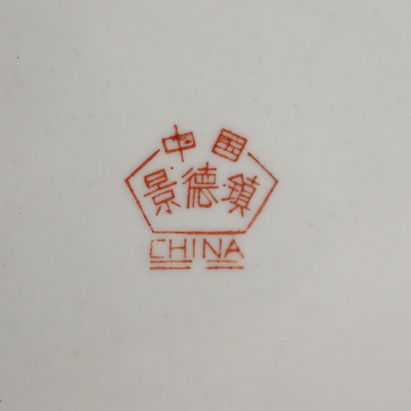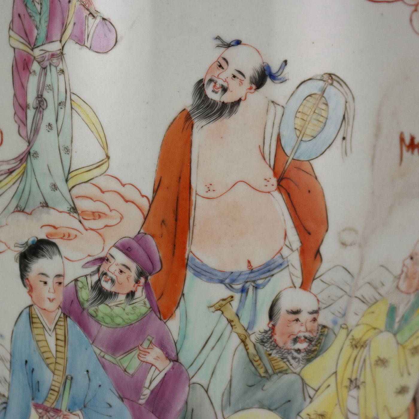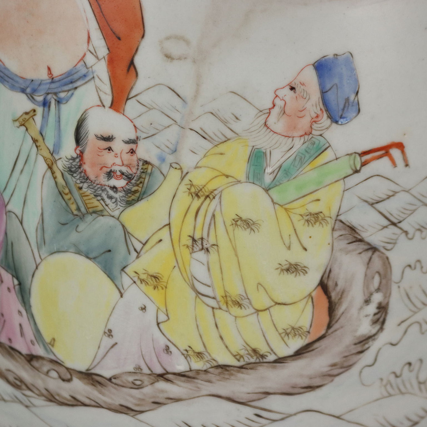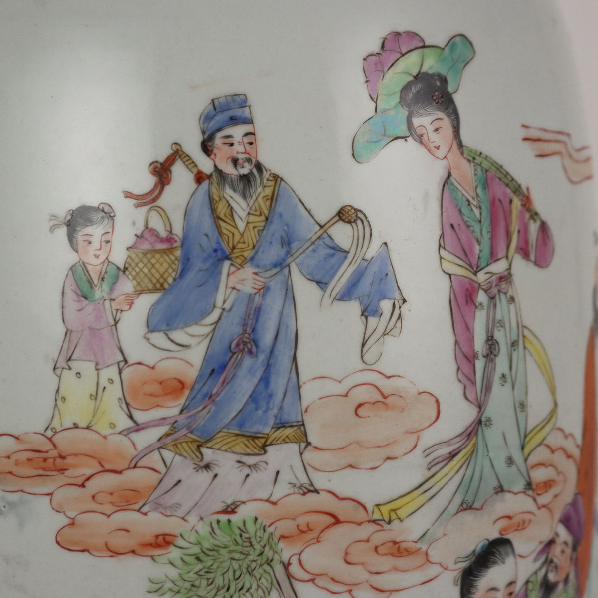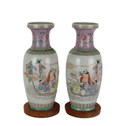 Pair of porcelain vases painted with enamels and figures, with Chinese characters written on one side. Wooden stand. Vase, jar, bowl, container.