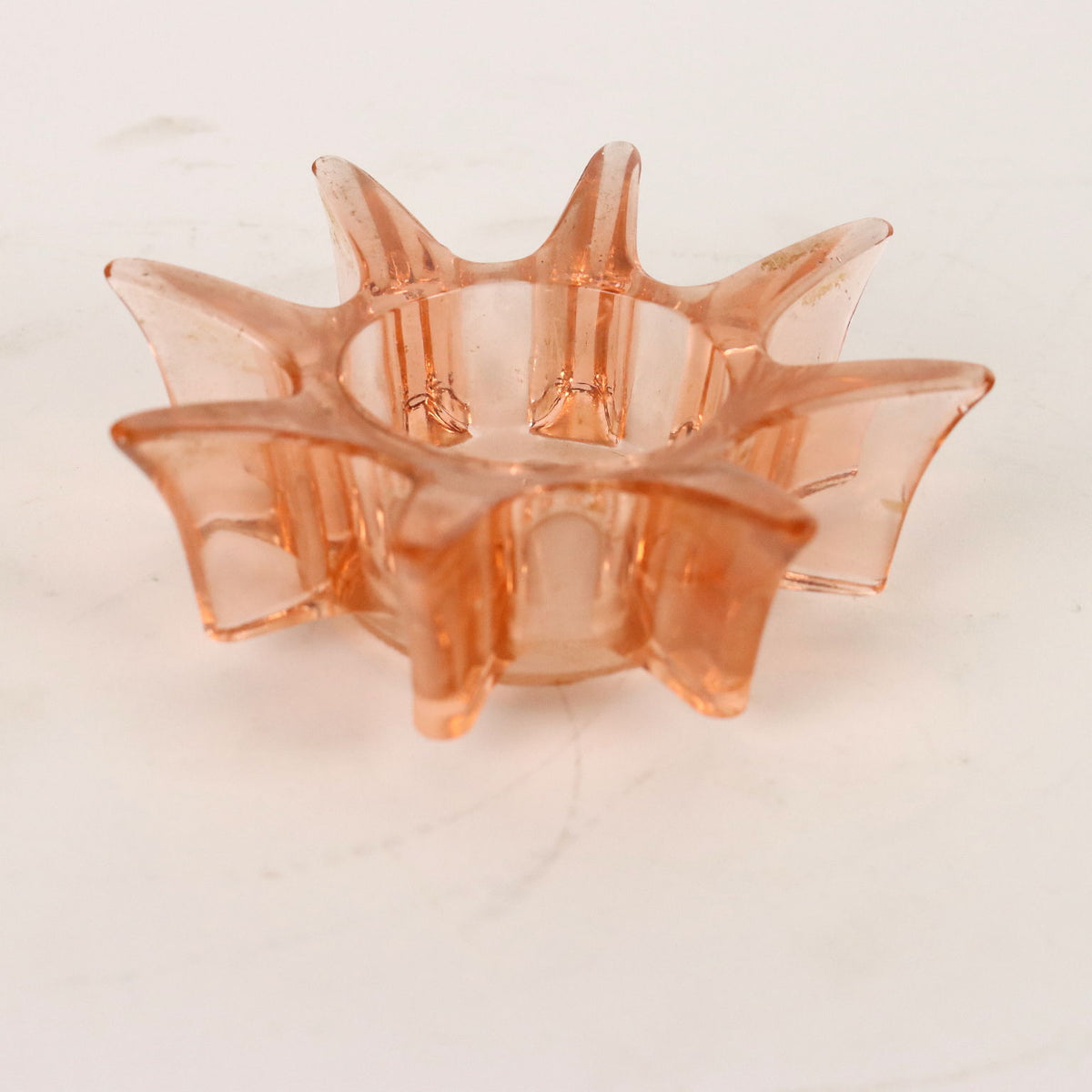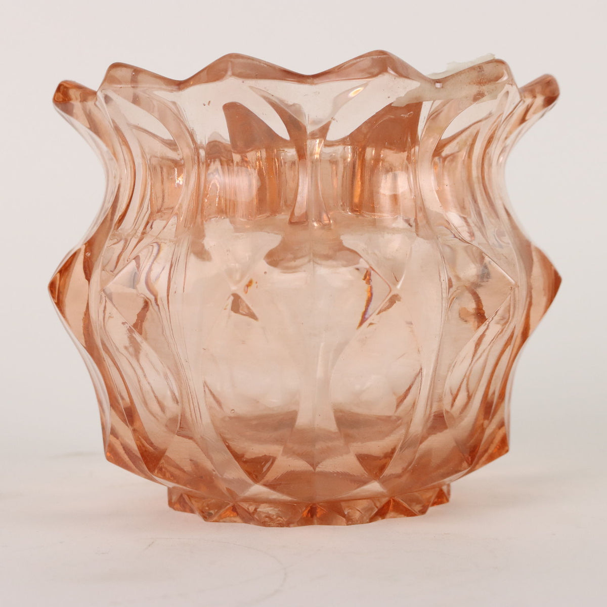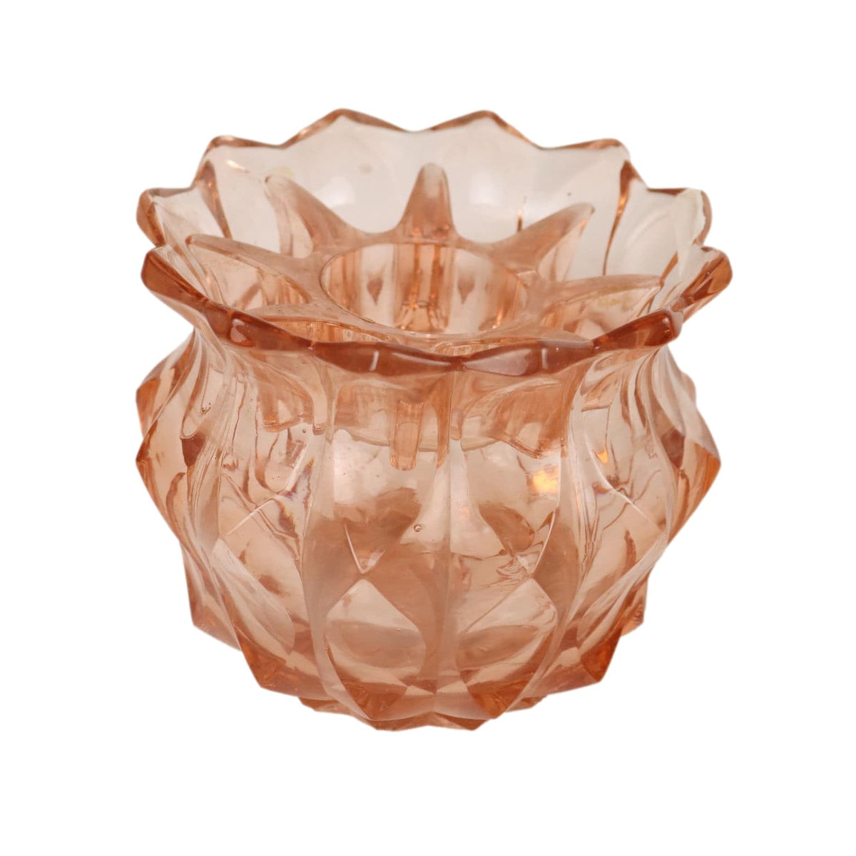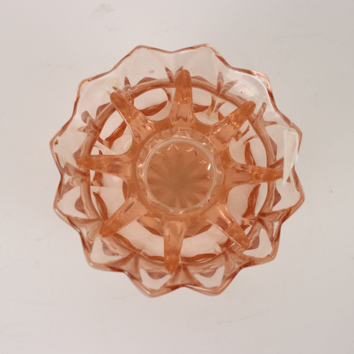 Faceted pink glass flower bowl with removable rack. Vase, jar, bowl, container.