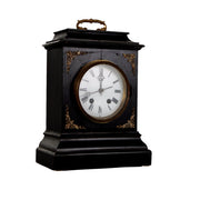 Wooden table clock with dark patina. Enamelled metal dial with Roman numeral hours protected by glass cover. Original winding key. Clocks, gilded clock, chimney clock, countertop clock, table clock, tryptich, pendulum, parisienne.