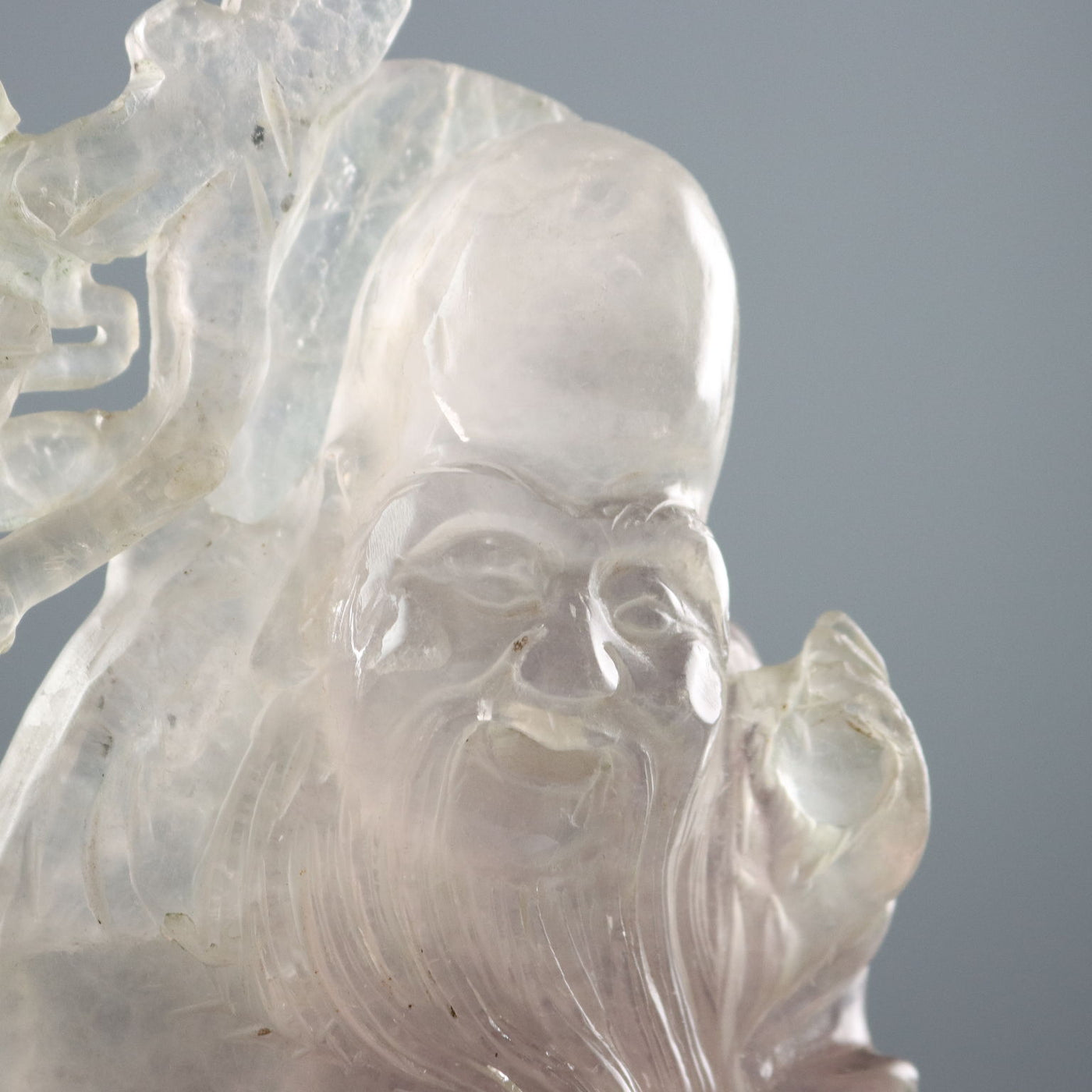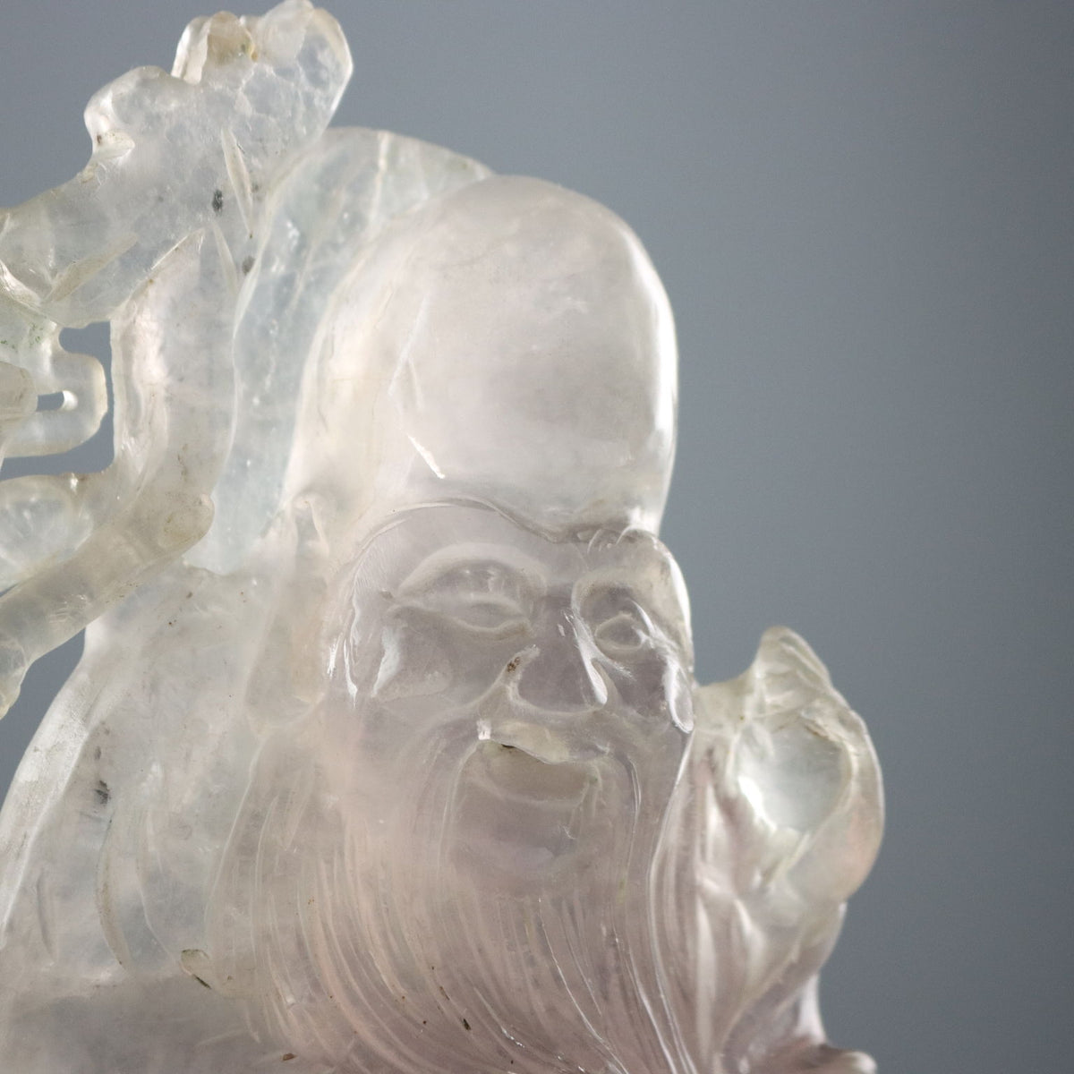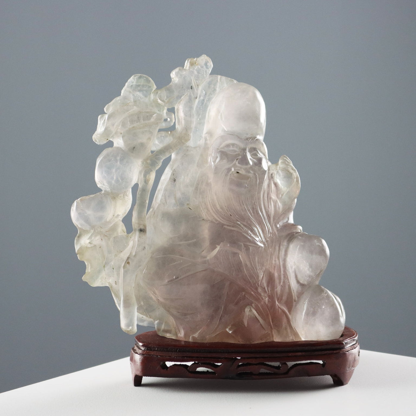 Quartz sculpture depicting the immortal Shoulao crouching with his staff and peaches, symbols of longevity. Sculptures ancient objects, , ancient art, sculpture, statue.