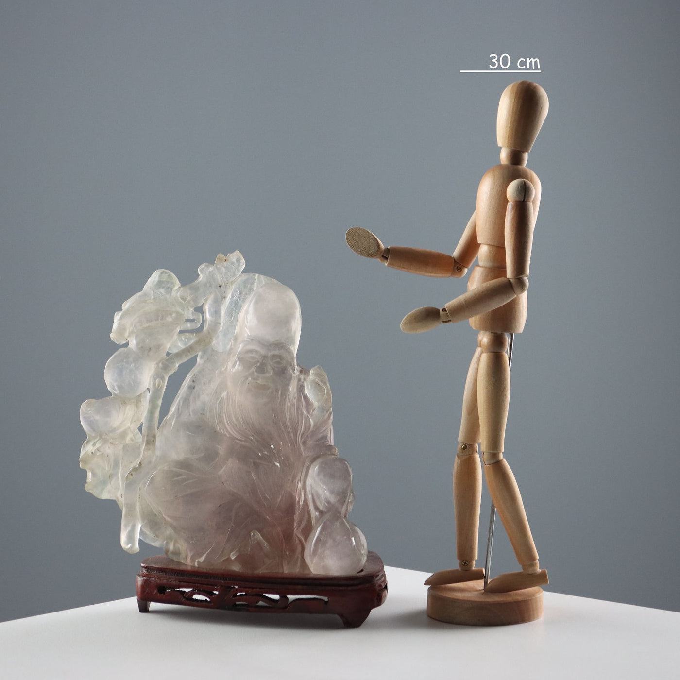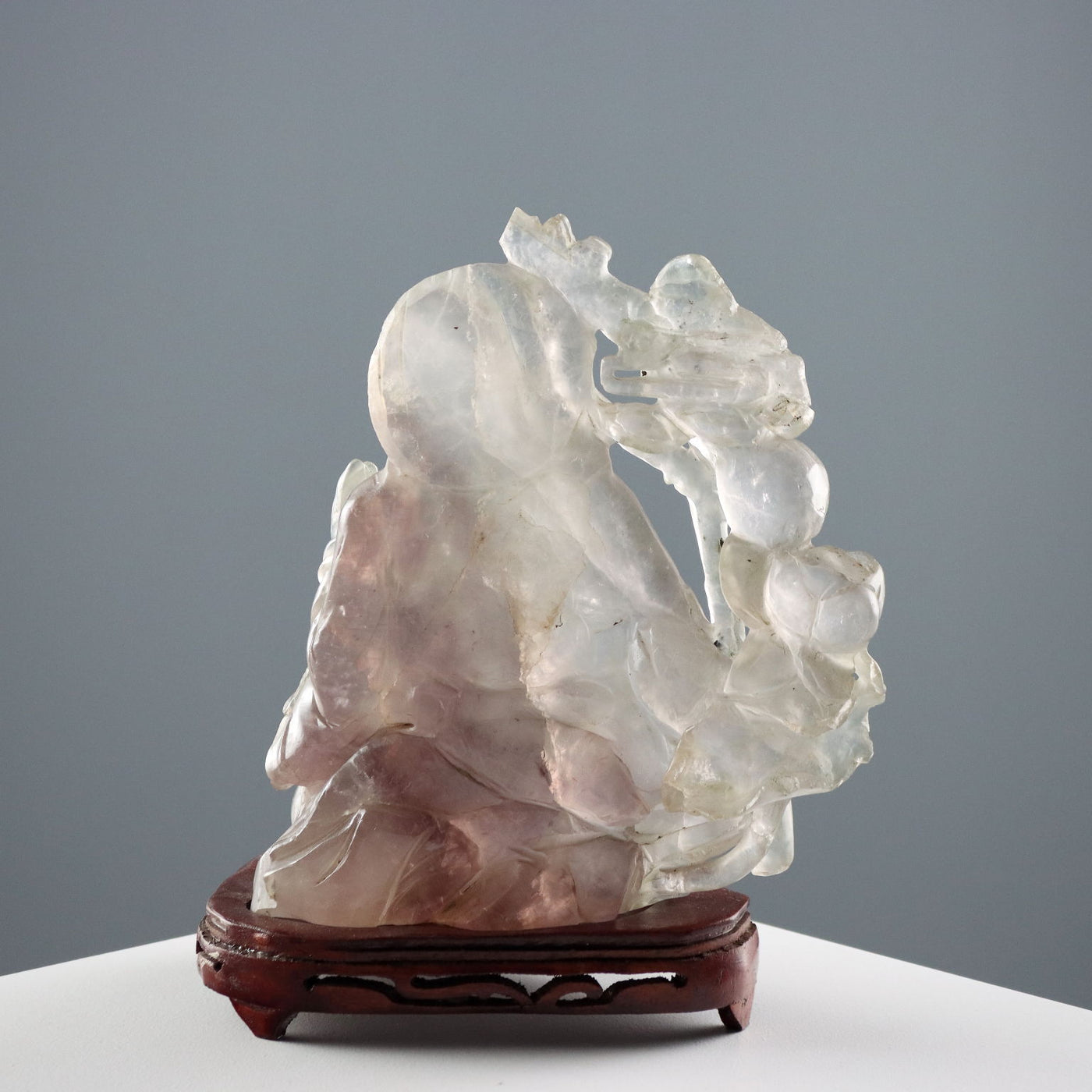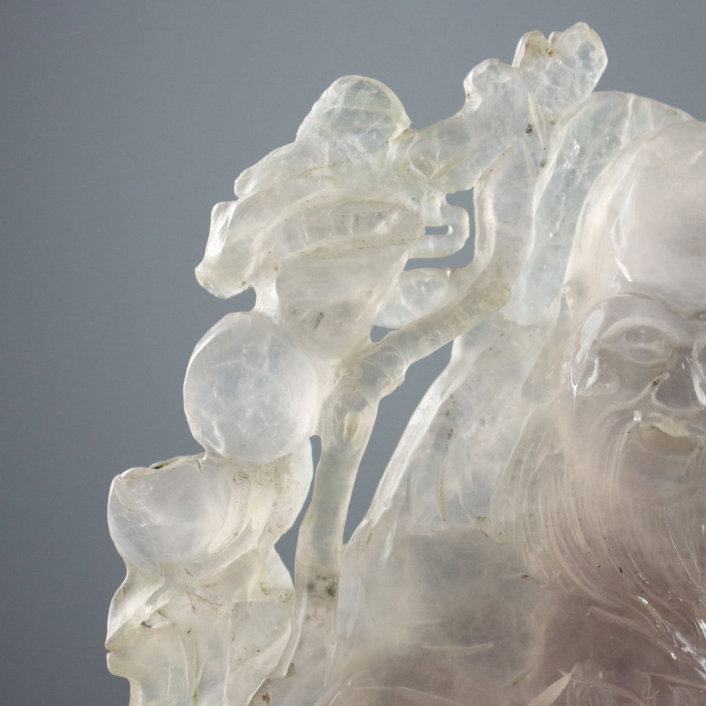Quartz sculpture depicting the immortal Shoulao crouching with his staff and peaches, symbols of longevity. Sculptures ancient objects, , ancient art, sculpture, statue.