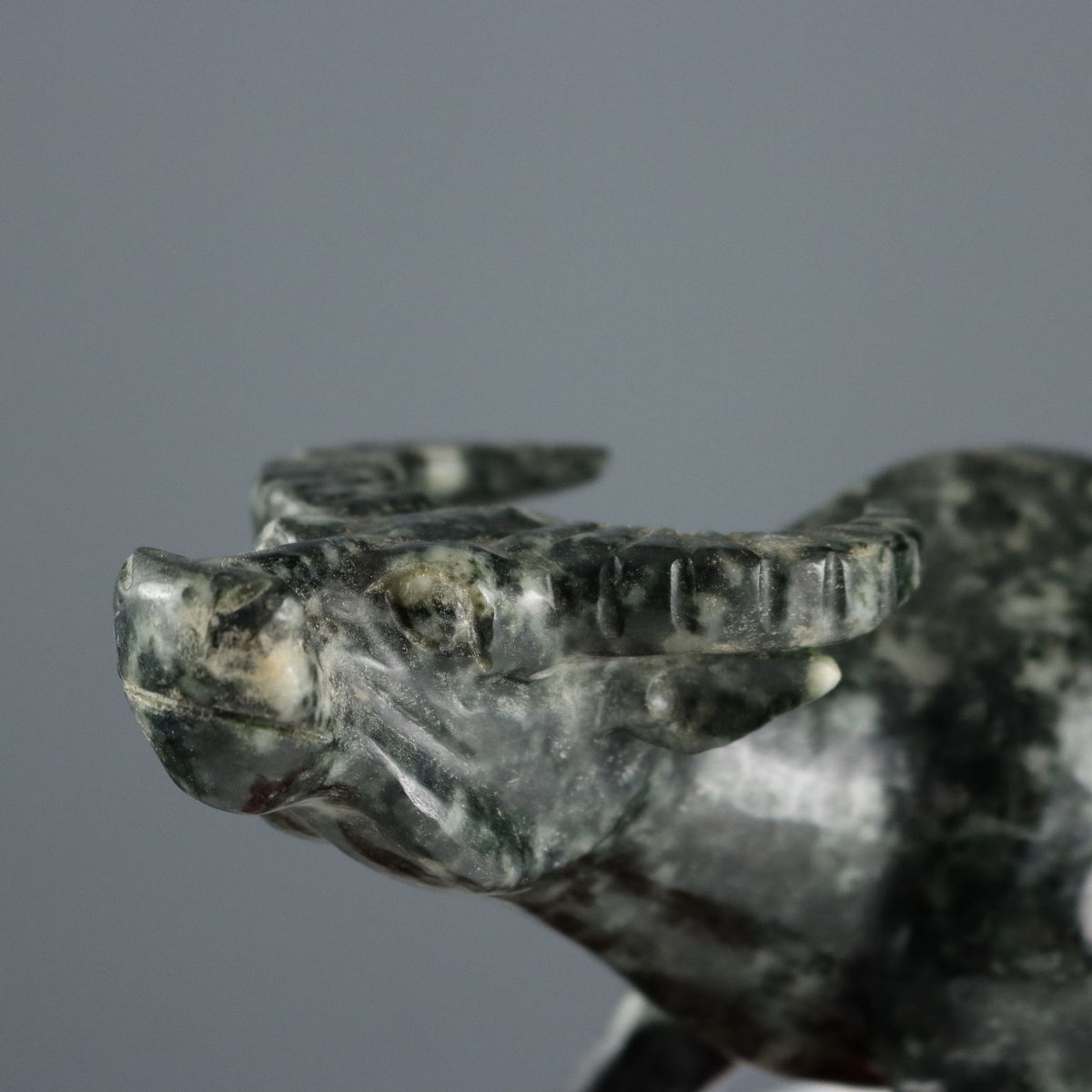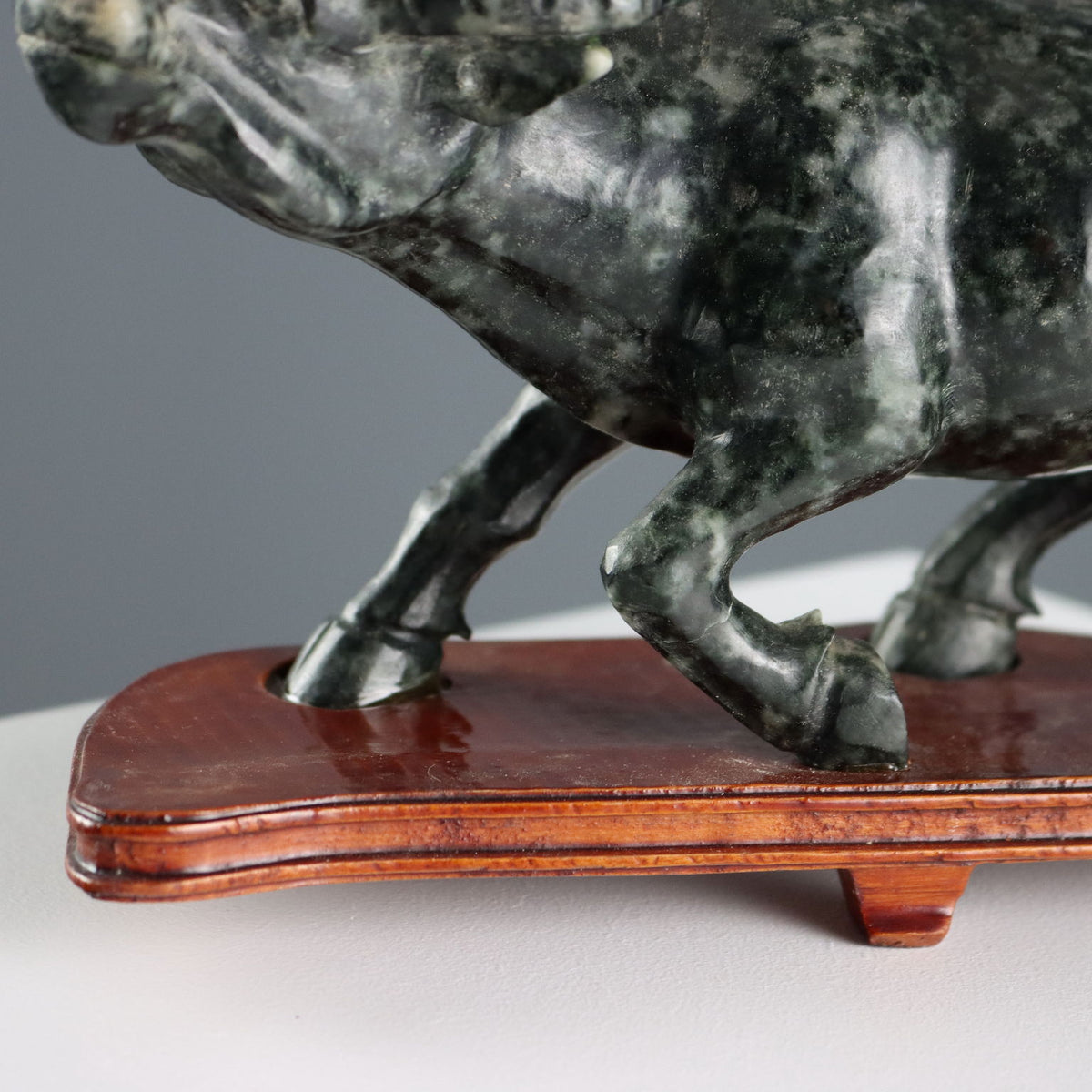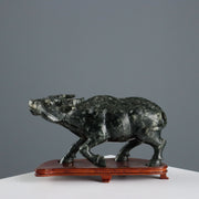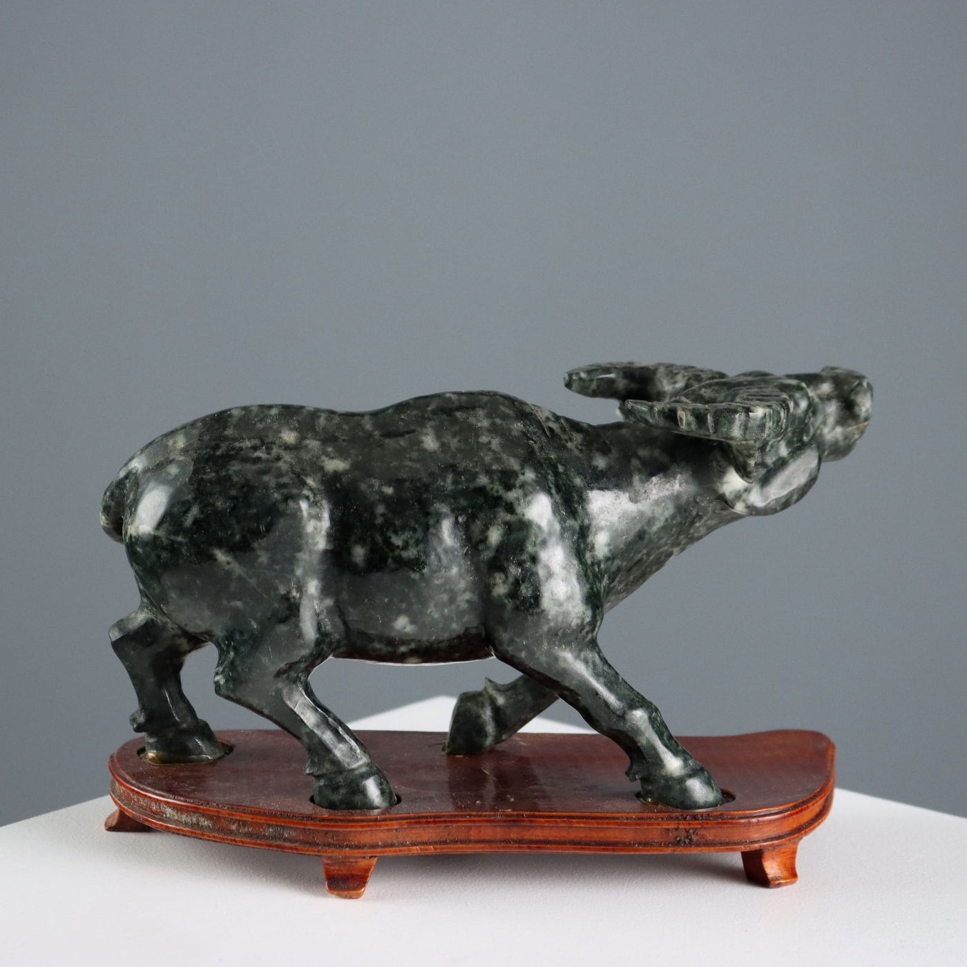 Stone sculpture depicting a water buffalo. Wooden base. Sculptures ancient objects, , ancient art, sculpture, statue.
