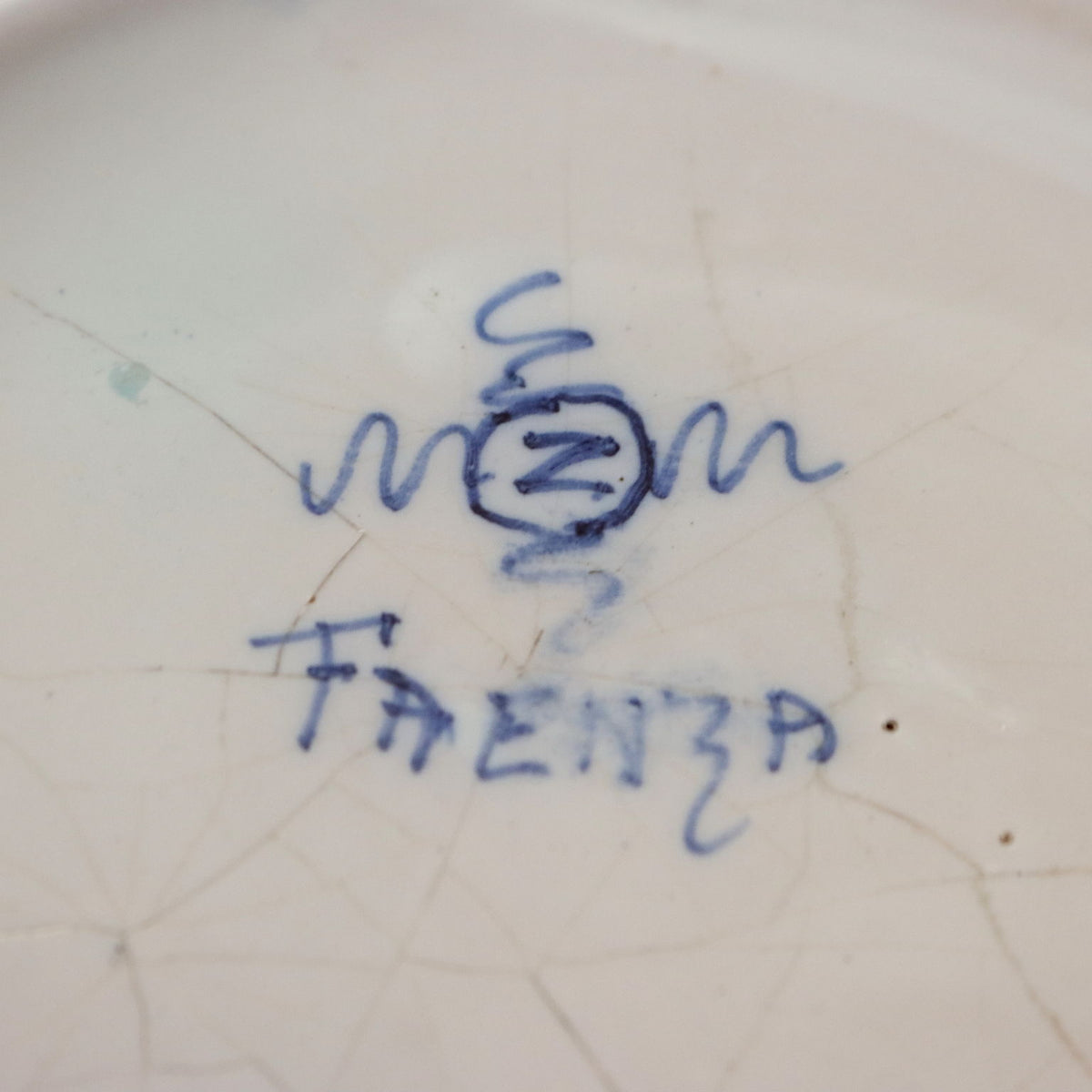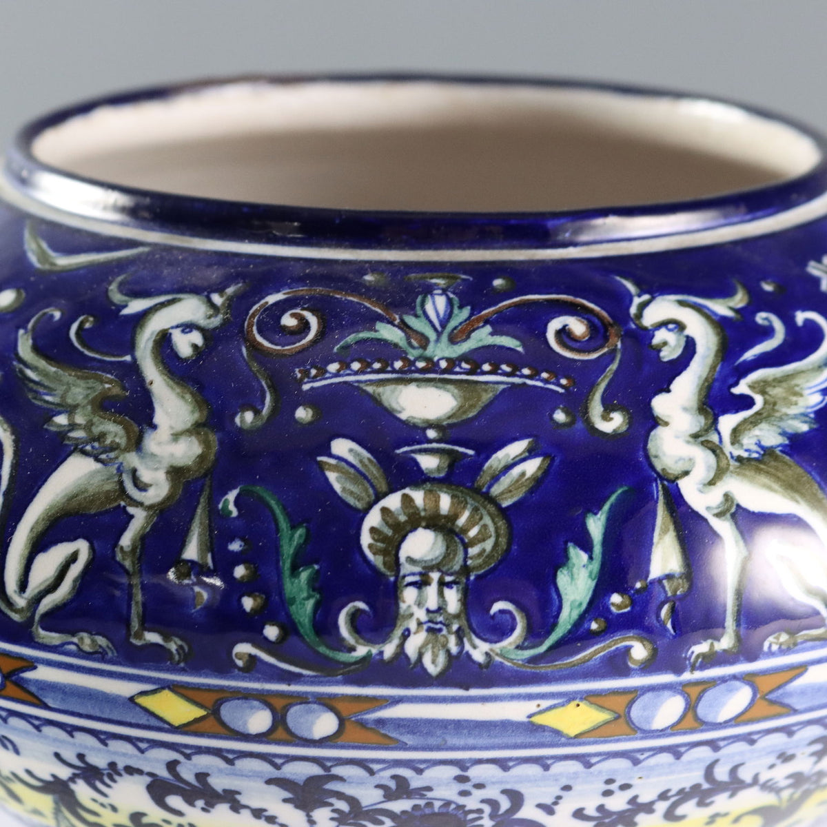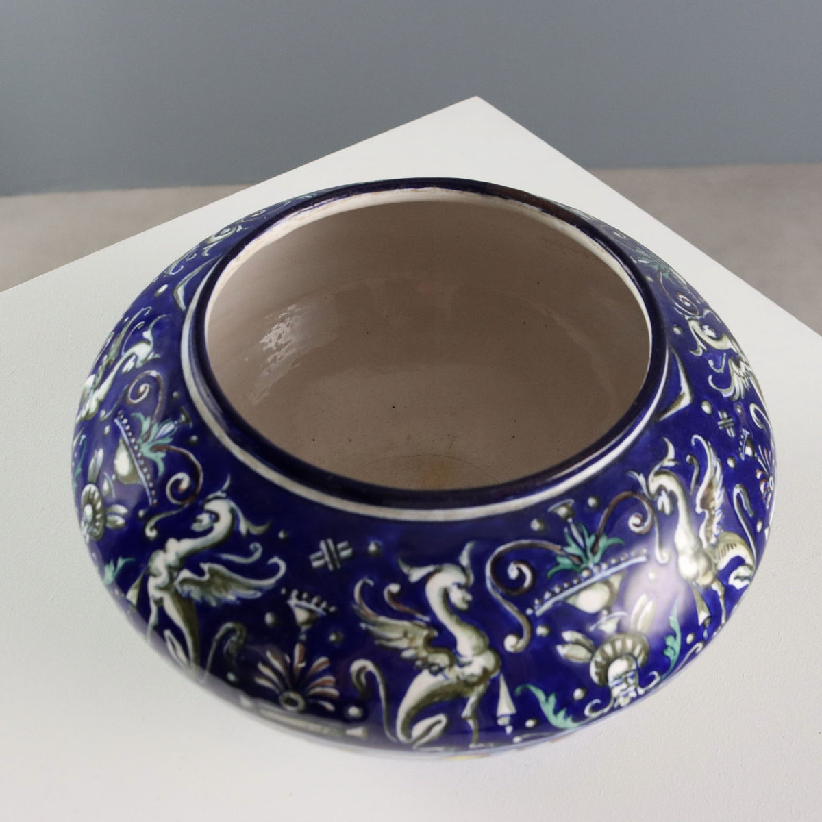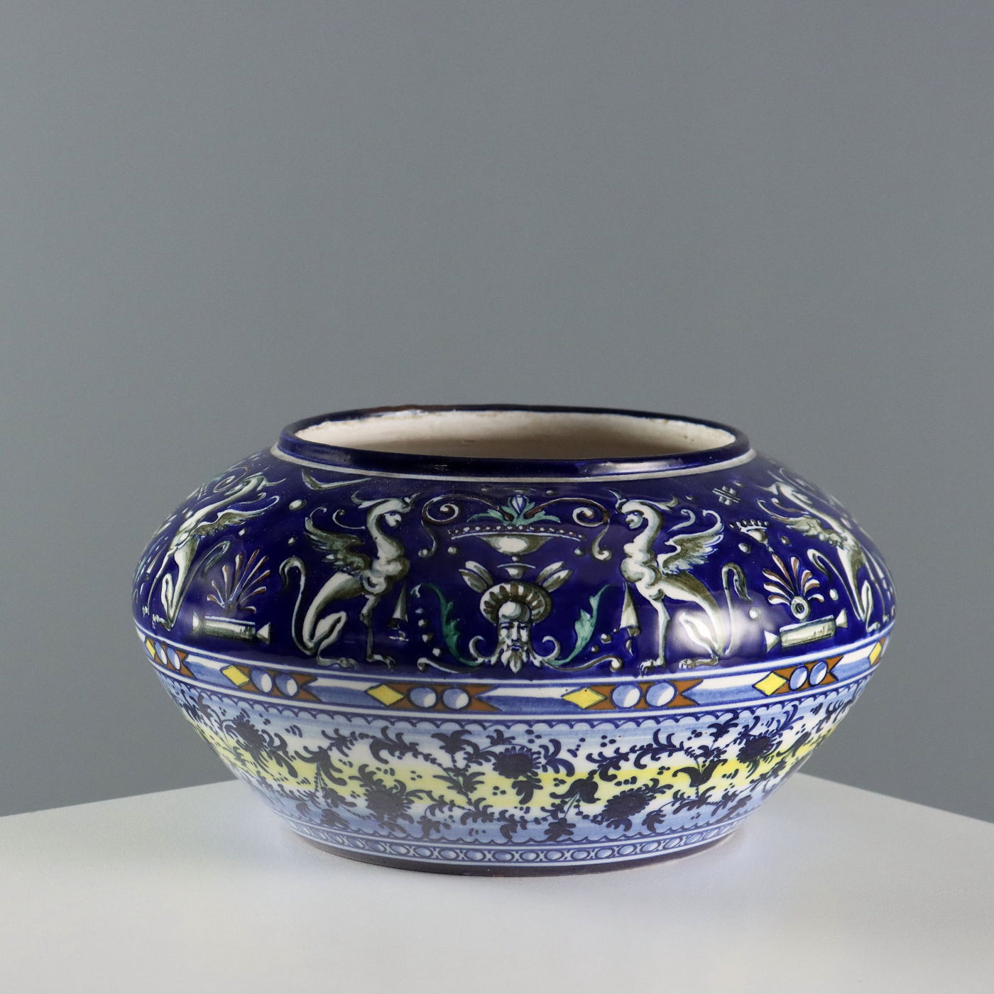 Polychrome majolica bowl in shades of blue and ochre, decorated in neo-Renaissance style with a grotesque motif and mythological figures. Paolo Zoli factory, founded in the late 19th century and closed in 1930. Underglaze blue mark dating to the 1920s. Ancient objects, , collector's articles, candle-holder.