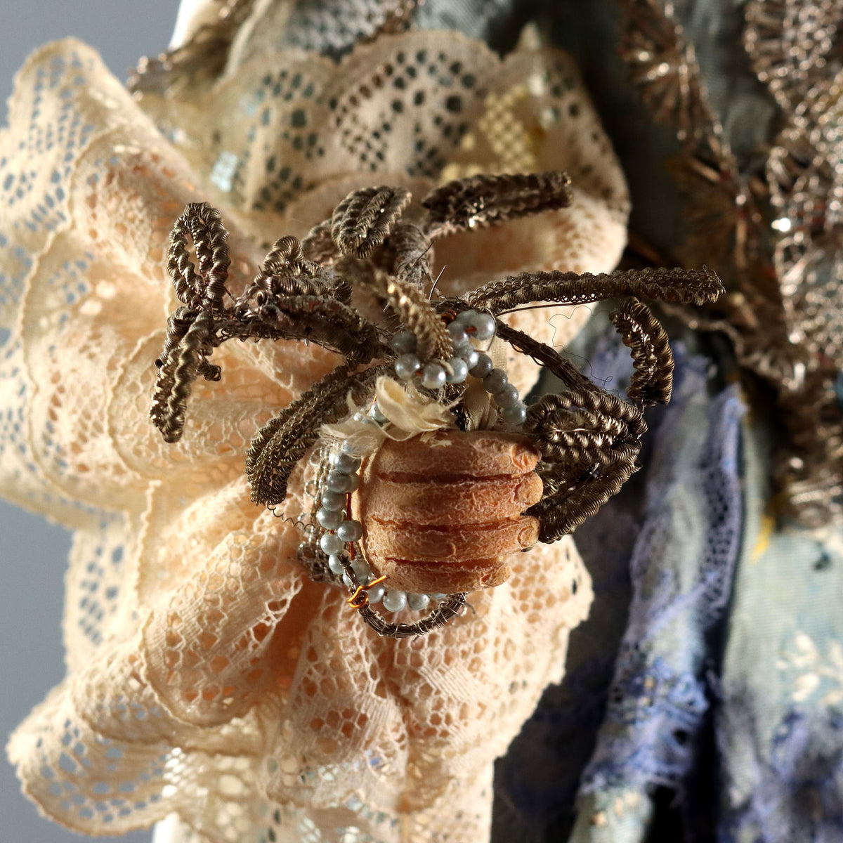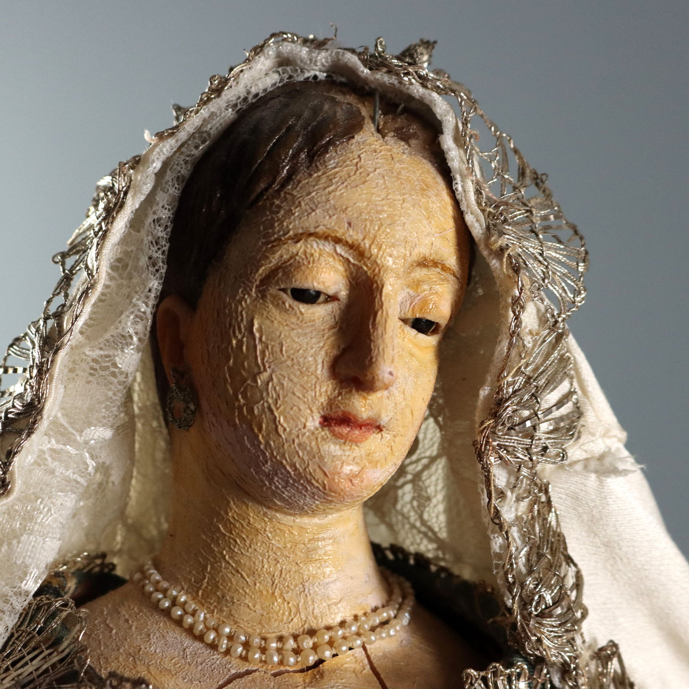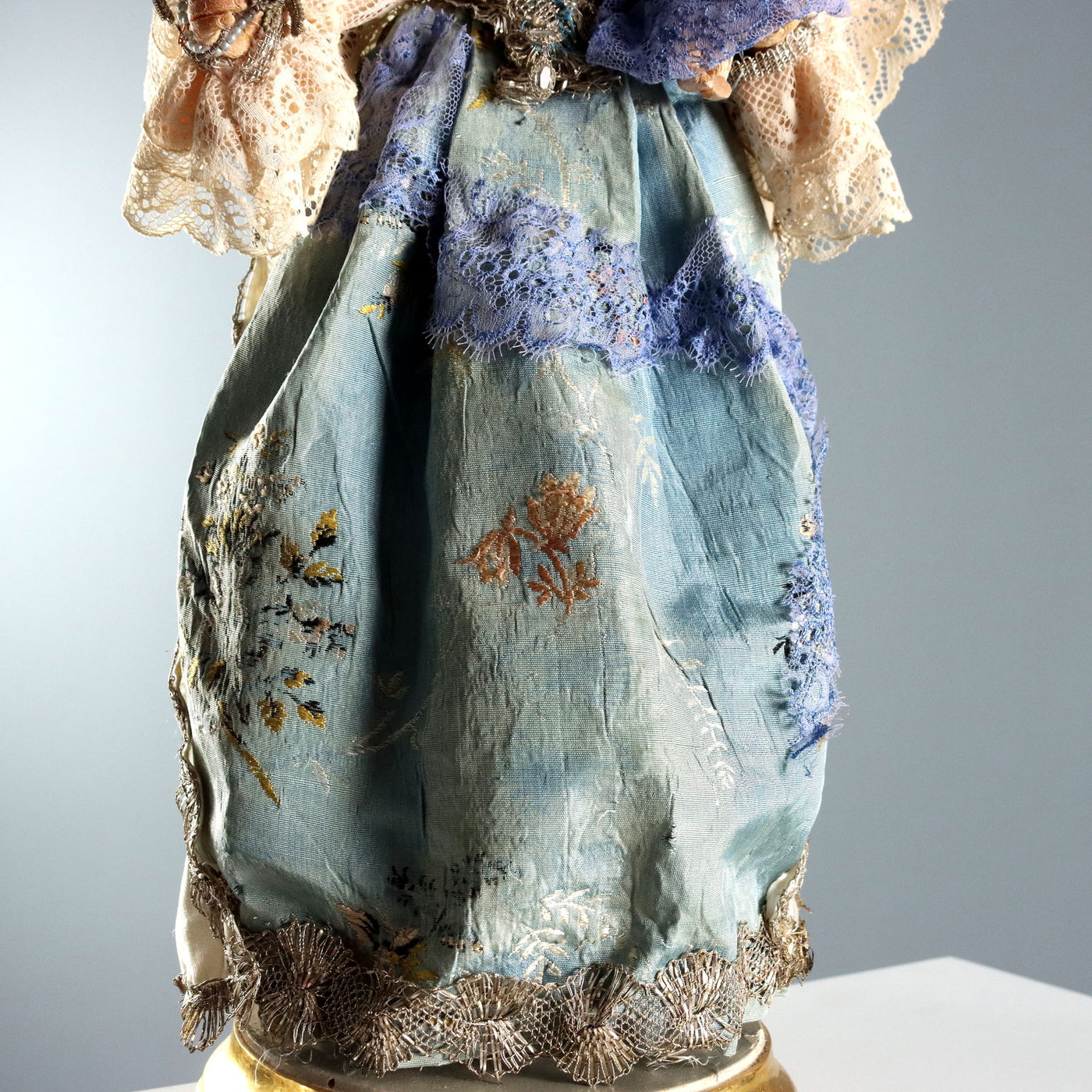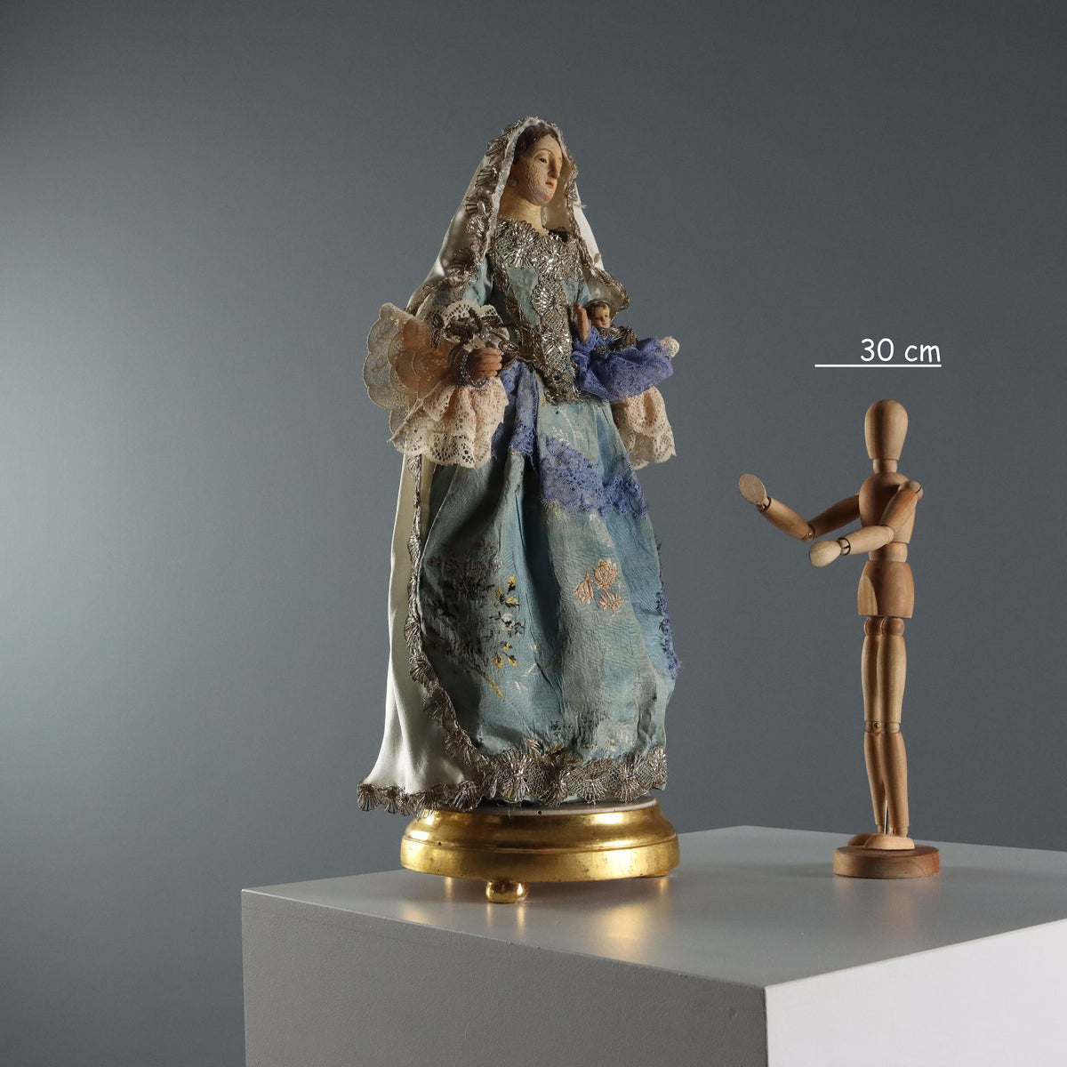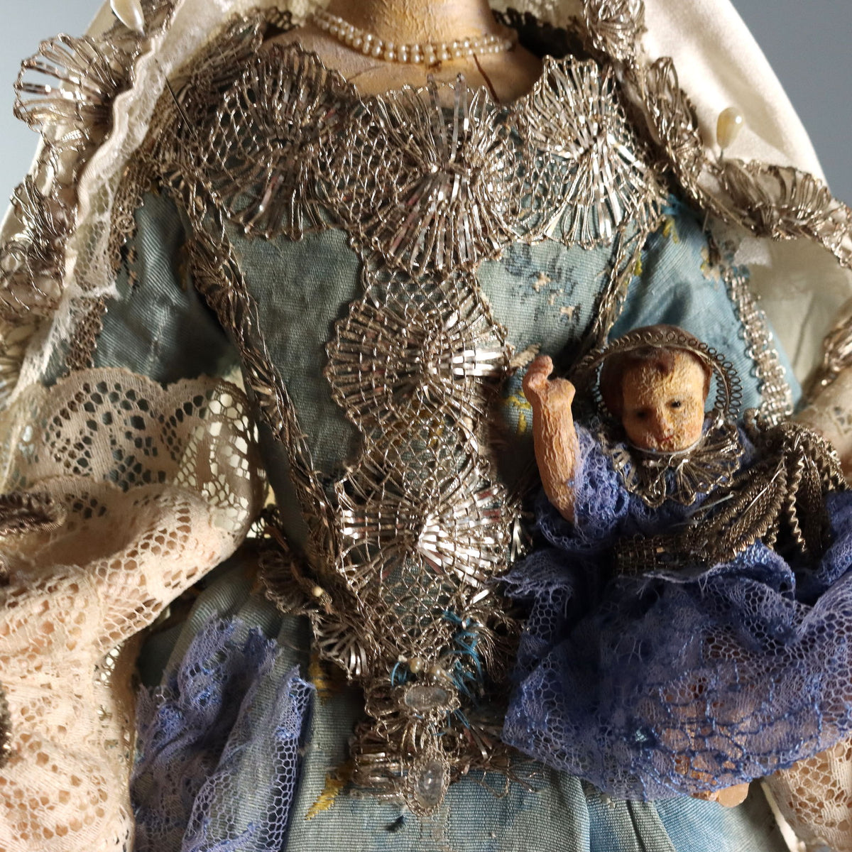 Wax Virgin Mary and Child on a gilded wooden base. Dressed in embroidered fabric, lace, and trimmings. Sculptures ancient objects, , ancient art, sculpture, statue.