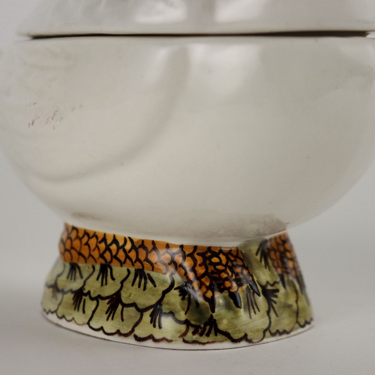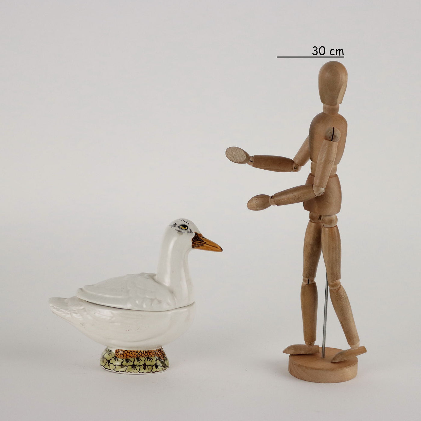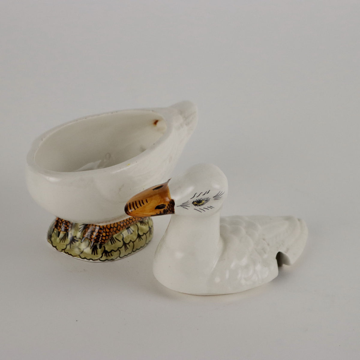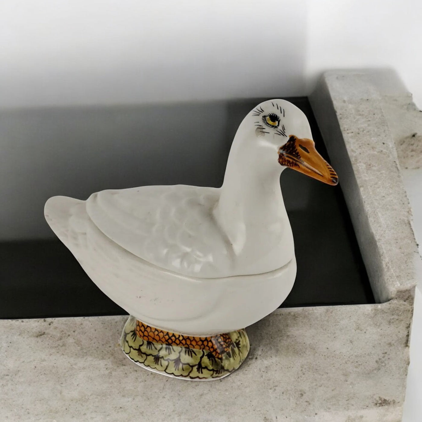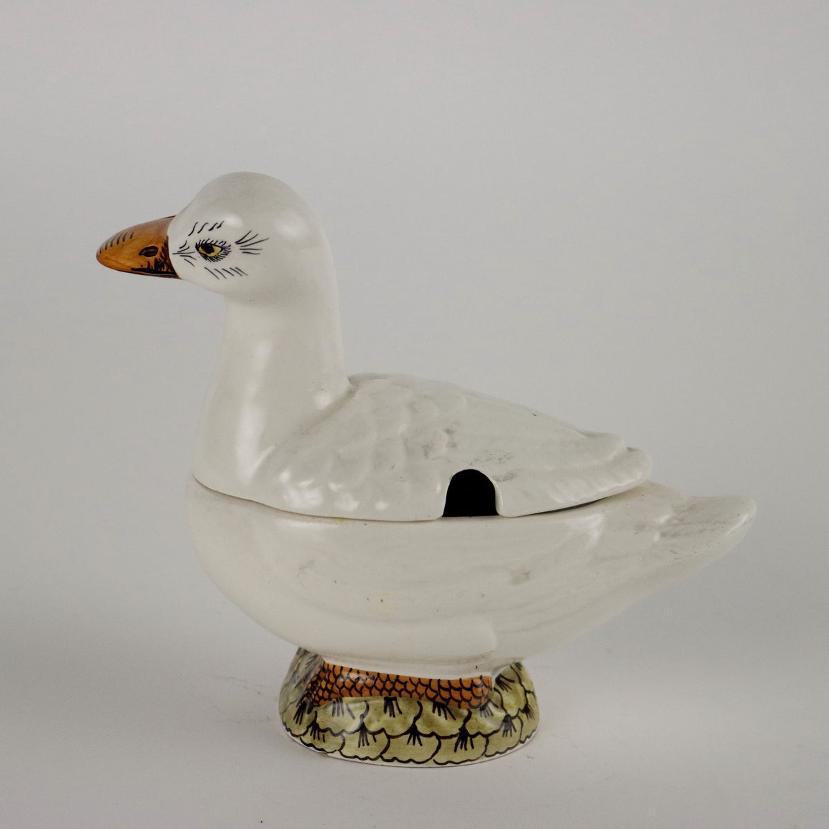Painted porcelain sauce holder duck. Production brand printed under the base. Vintage objects, vintage objects, 1960s articles, 1970s articles, 1930s articles, 1940s objects, 1950s objects, design articles.