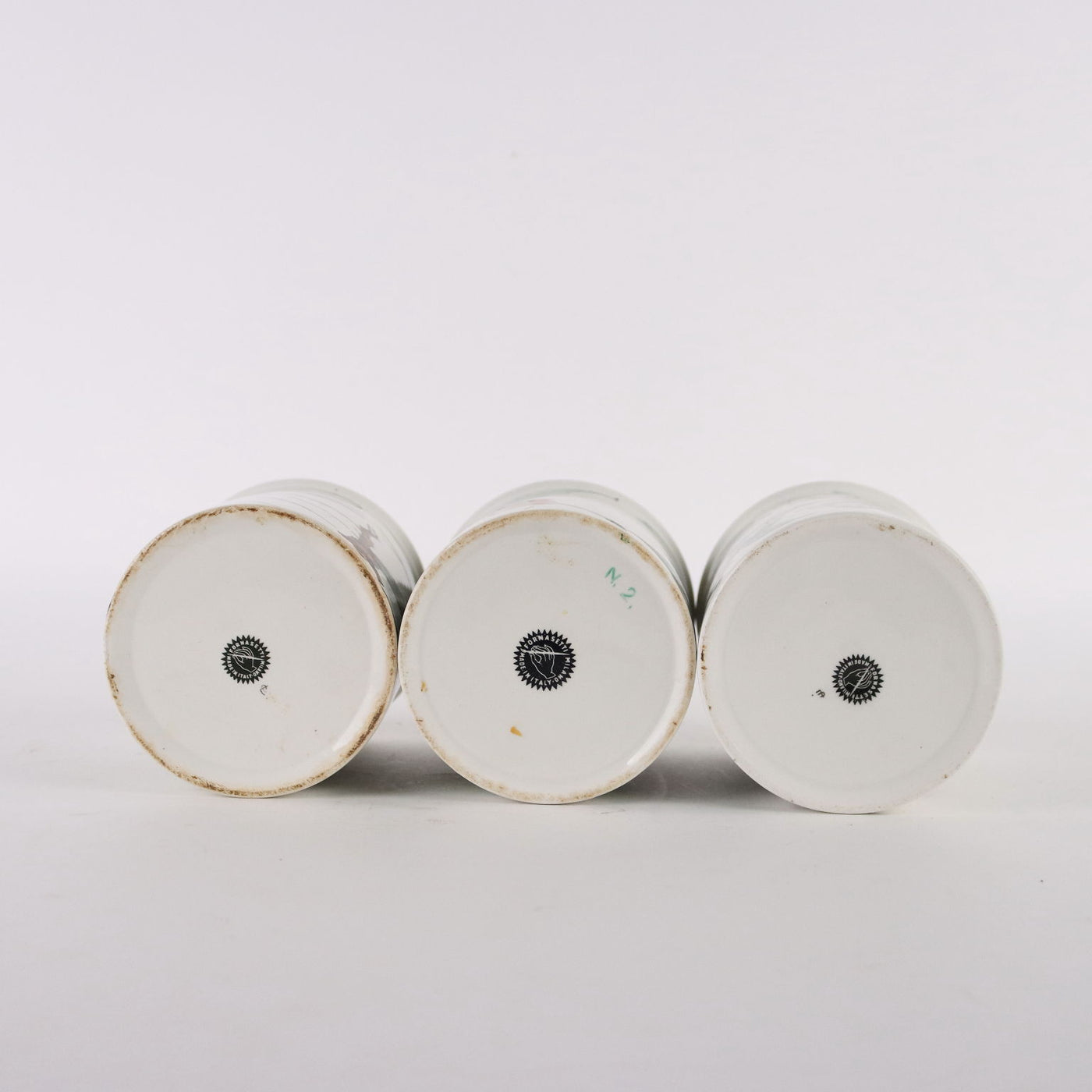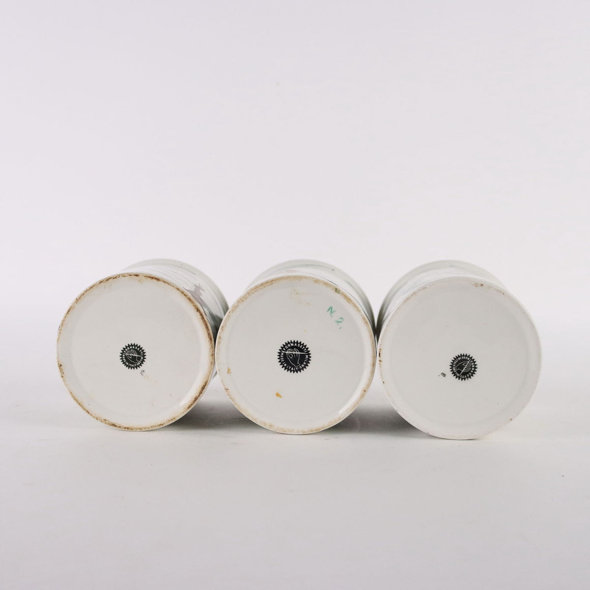 Group of three ceramic jars. Missing lids. Under the base the manufacturer's brand. Vintage objects, vintage objects, 1960s articles, 1970s articles, 1930s articles, 1940s objects, 1950s objects, design articles.
