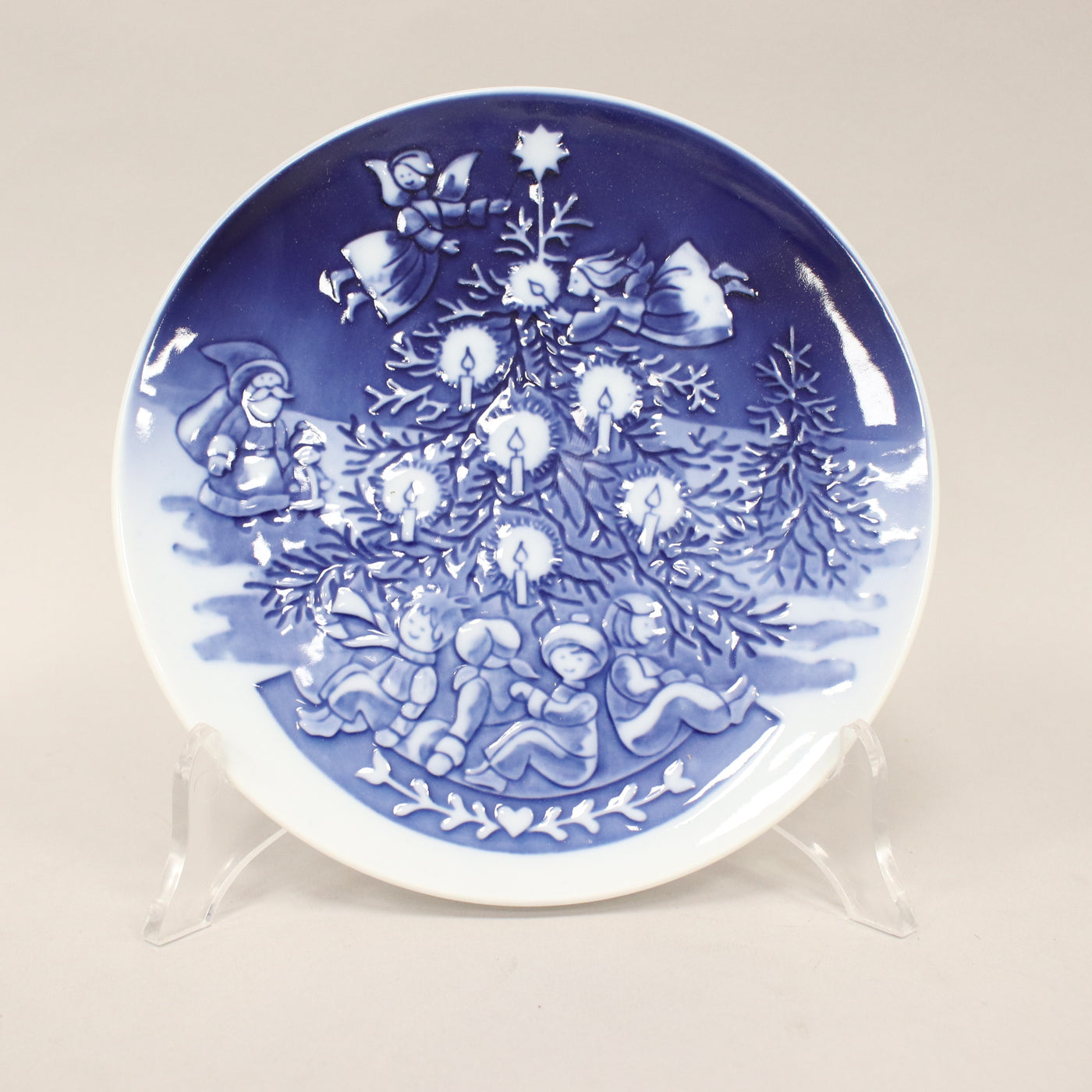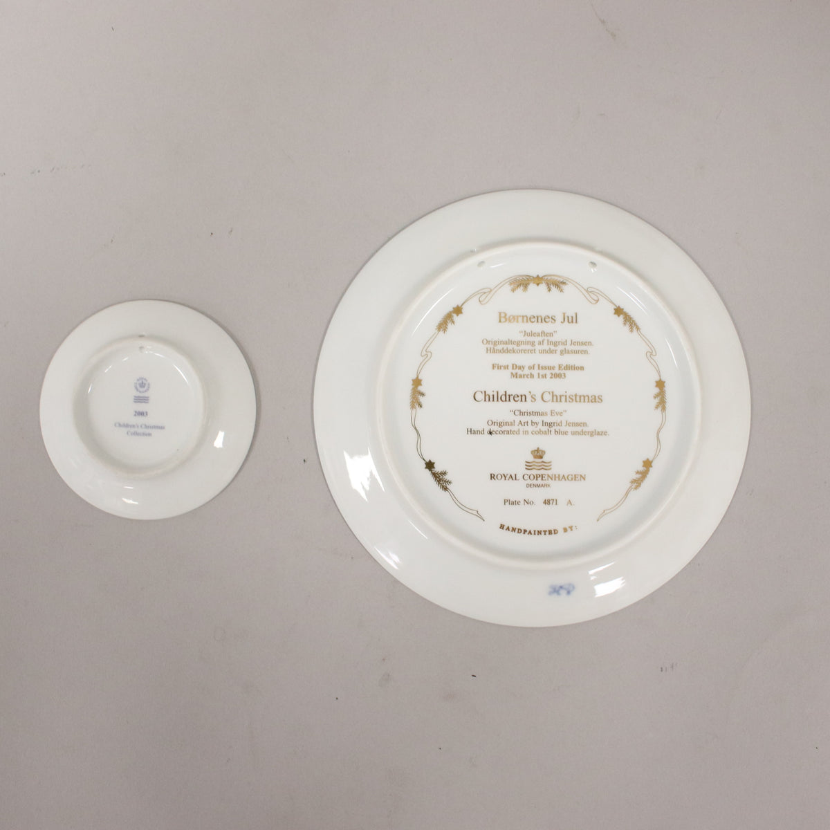 Royal Copenhagen Christmas Plate 2003 complete with box, booklet and certificate; it is the sixth in the series and is entitled 'Christmas Eve Evening' drawing by Ingrid Jensen. Plate number 4871 A. The box includes the second plate with the same illustration. Since 1998, Royal Copenhagen has started producing the Christmas plate dedicated to children with illustrations that represent the joy that Christmas inspires in children. White porcelain plate with decorations in various shades of blue. Each plate was produced in limited quantities only and exclusively in the year of the first printing, which takes place from March 1st, and production ended at the end of the year with the destruction of the original mold which made it impossible to reproduce. As a guarantee of authenticity, the plate bears the Royal Copenhagen mark with the three overlapping wavy lines, which represent the three Danish straits: Øresund, the Great Belt and the Little Belt, and the initials of the painter who created the unique illustration of the plate. The plate measures 17 cm. in diameter and on the back it has two holes made by Royal Copenhagen itself during production so that it can be hung.