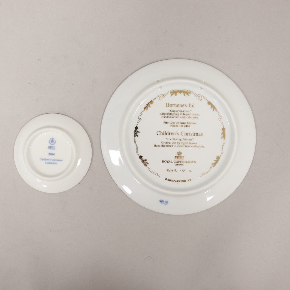Royal Copenhagen Christmas Plate 2004 complete with box, booklet and certificate; it is the seventh in the series and is entitled 'The Queen of Skate' drawing by Ingrid Jensen. Plate number 4704 A. The box includes the second plate with the same illustration. Since 1998, Royal Copenhagen has started producing the Christmas plate dedicated to children with illustrations that represent the joy that Christmas inspires in children. White porcelain plate with decorations in various shades of blue. Each plate was produced in limited quantities only and exclusively in the year of the first printing, which takes place from March 1st, and production ended at the end of the year with the destruction of the original mold which made it impossible to reproduce. As a guarantee of authenticity, the plate bears the Royal Copenhagen mark with the three overlapping wavy lines, which represent the three Danish straits: Øresund, the Great Belt and the Little Belt, and the initials of the painter who created the unique illustration of the plate. The plate measures 17 cm. in diameter and on the back it has two holes made by Royal Copenhagen itself during production so that it can be hung. Vintage plates, design ceramics, design plates, vintage objects, vintage objects, 1960s articles, 1970s articles, 1930s articles, 1940s objects, 1950s objects, design articles.