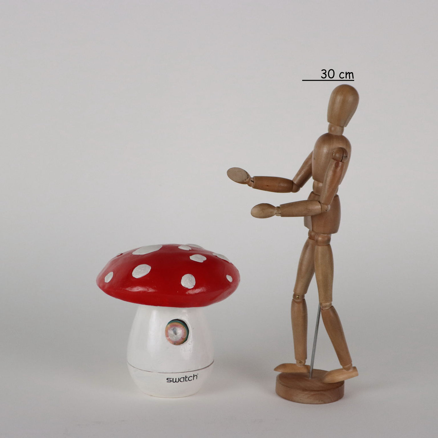 Gnome themed clock contained in painted wooden mushroom. Vintage objects, vintage objects, 1960s articles, 1970s articles, 1930s articles, 1940s objects, 1950s objects, design articles.