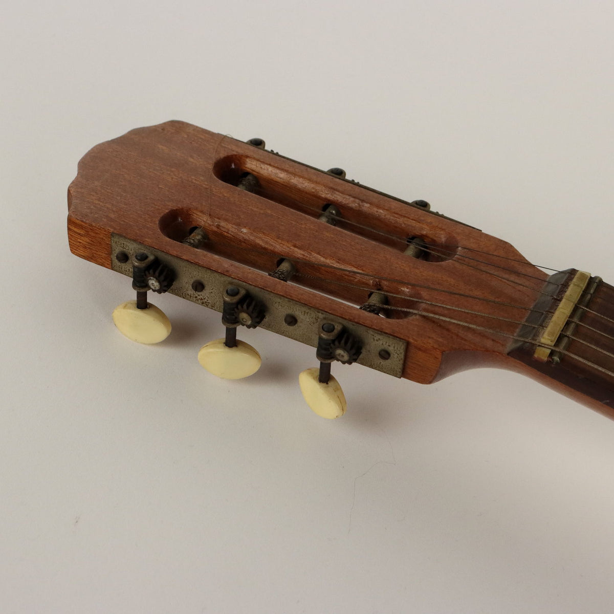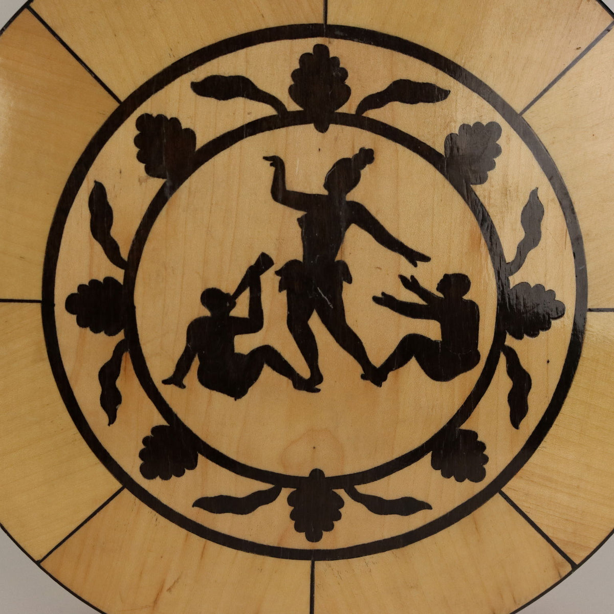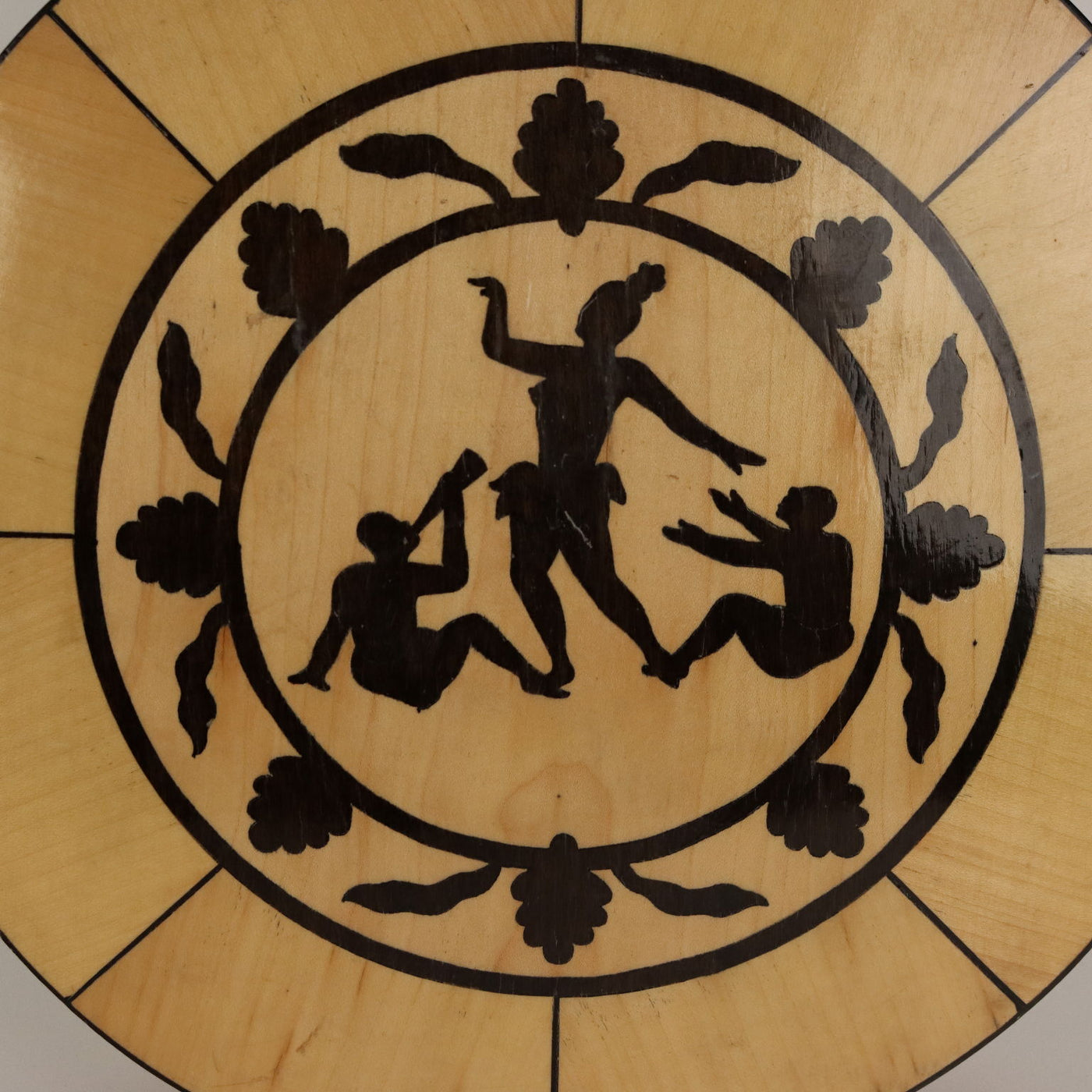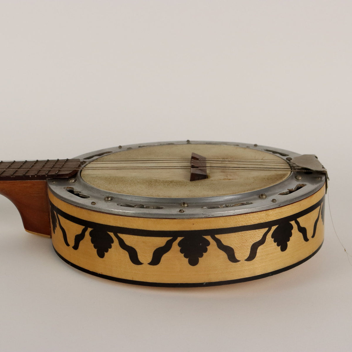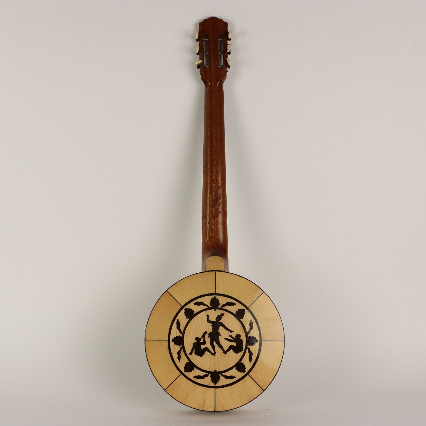 Banjo six-string wooden guitar, inlaid decoration depicting a dancer with a pair of musicians and a Greek key. Vintage objects, vintage objects, 1960s articles, 1970s articles, 1930s articles, 1940s objects, 1950s objects, design articles.