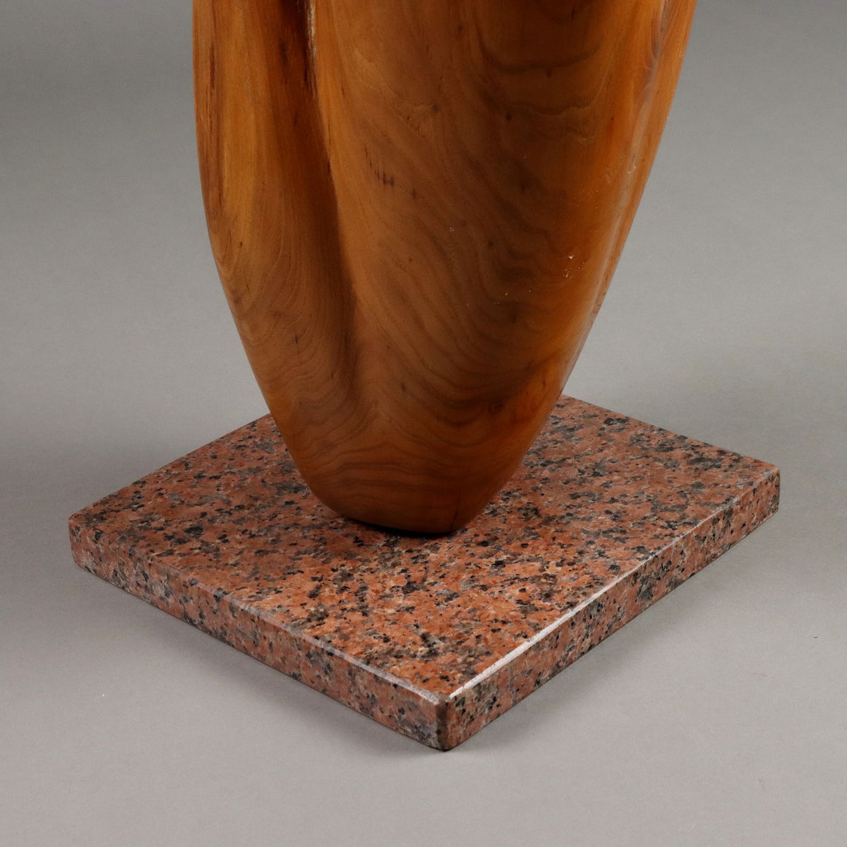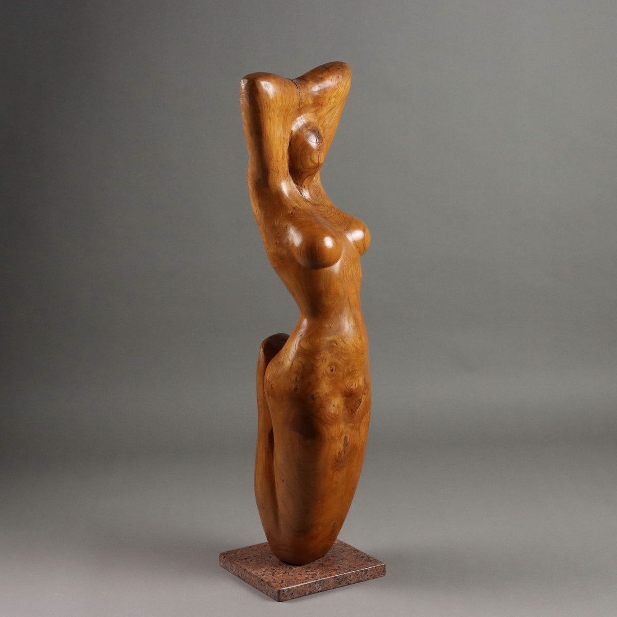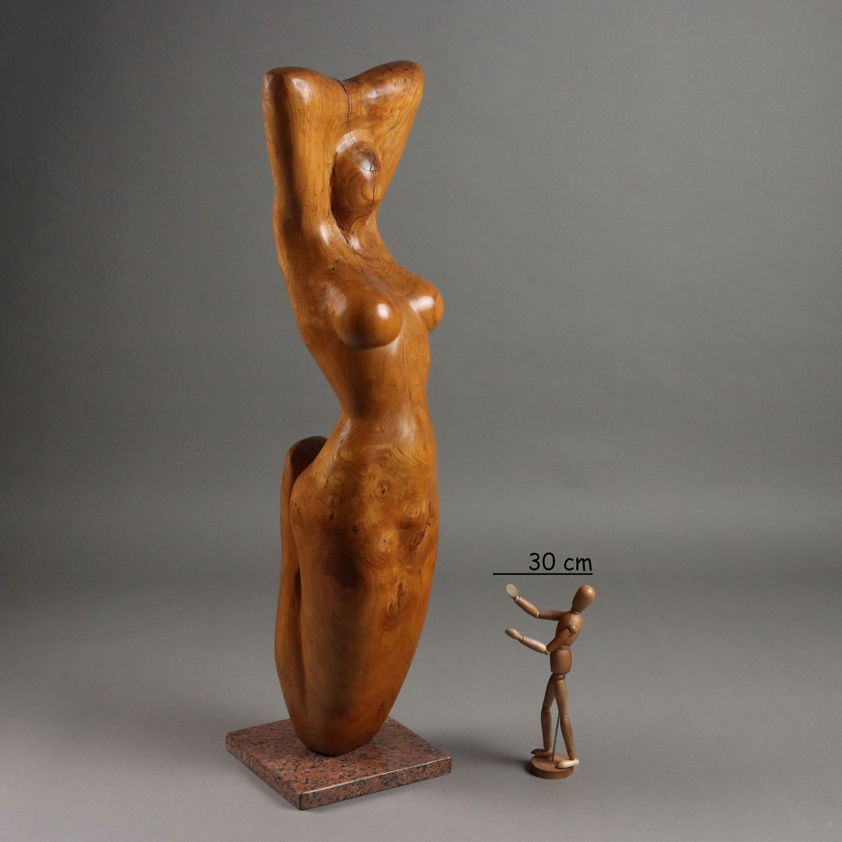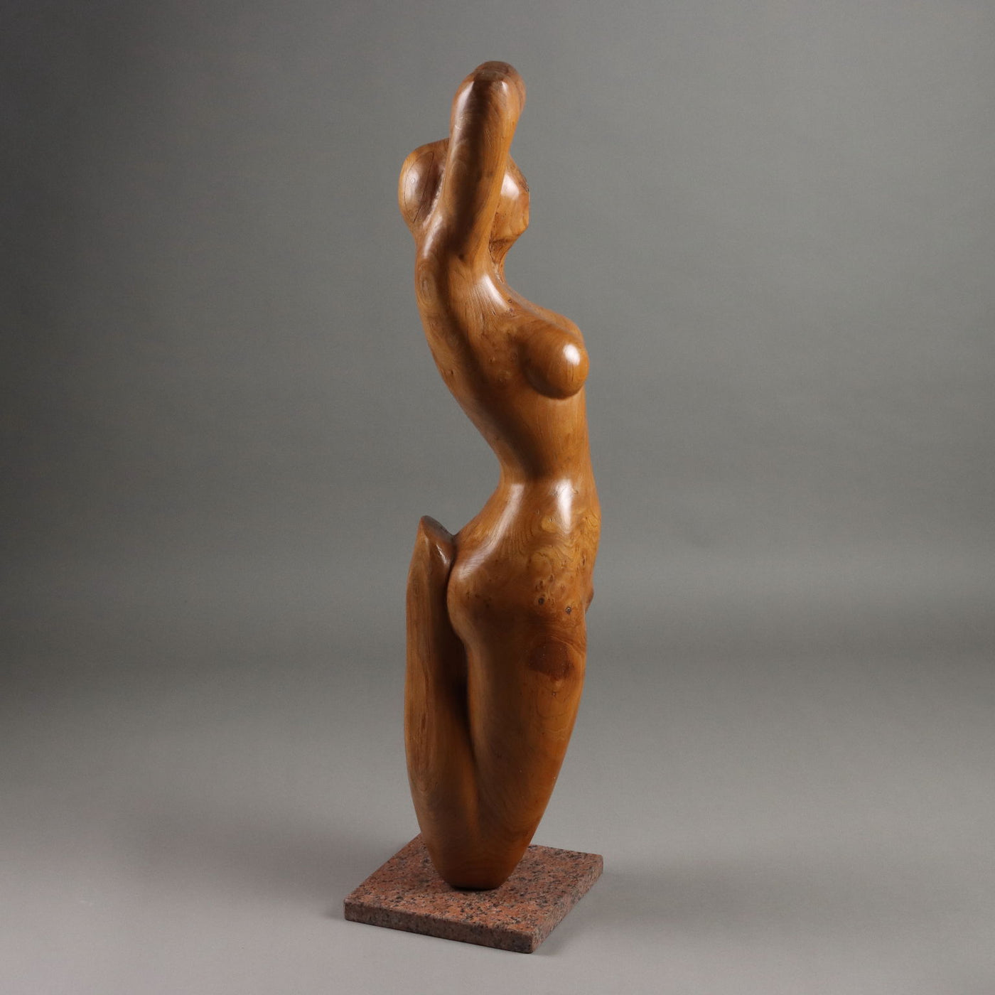 Carved wooden sculpture on a red granite base depicting a female nude. The author's signature is engraved on the back. Vintage objects, vintage objects, 1960s articles, 1970s articles, 1930s articles, 1940s objects, 1950s objects, design articles.