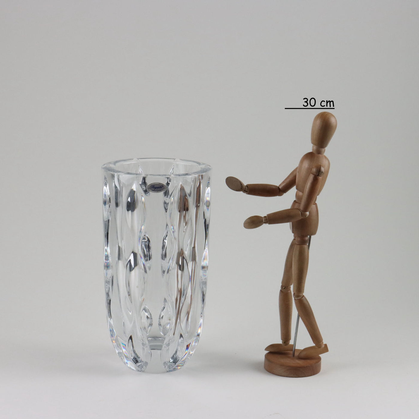 Clear crystal vase. Manufacturer's mark under the base and adhesive label on the edge. Vintage objects, vintage objects, 1960s articles, 1970s articles, 1930s articles, 1940s objects, 1950s objects, design articles.