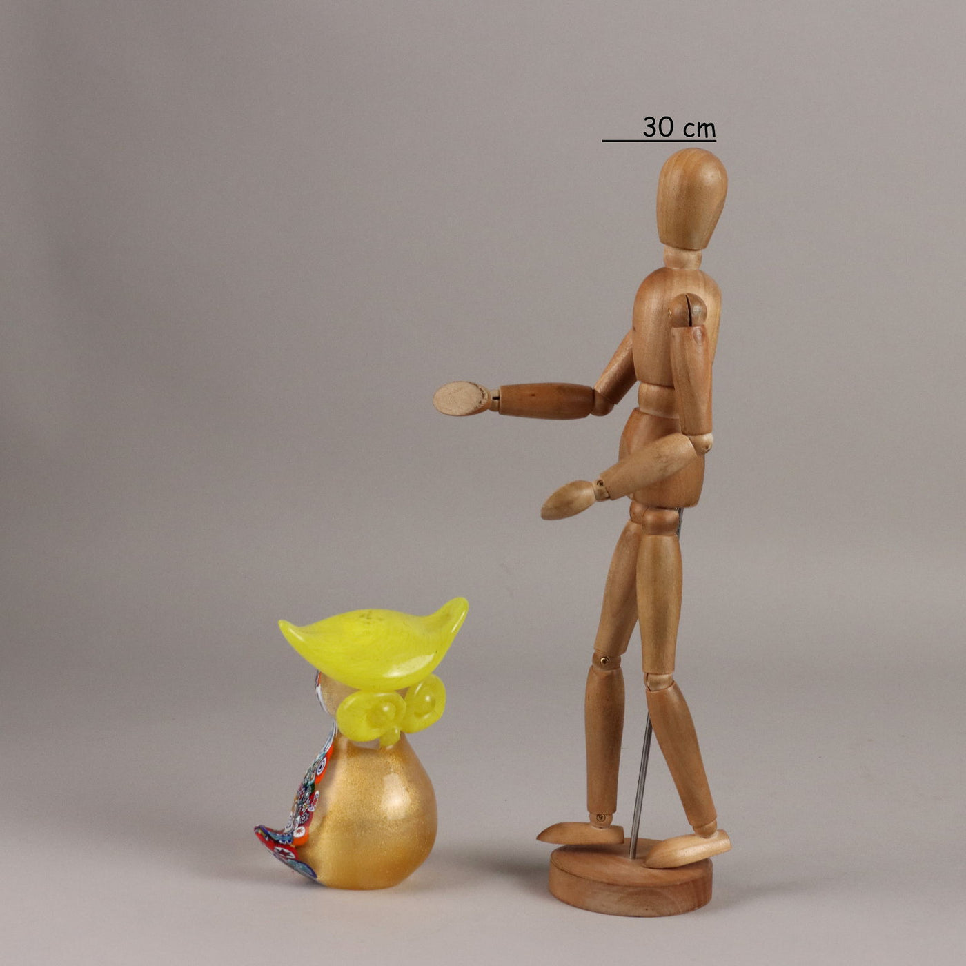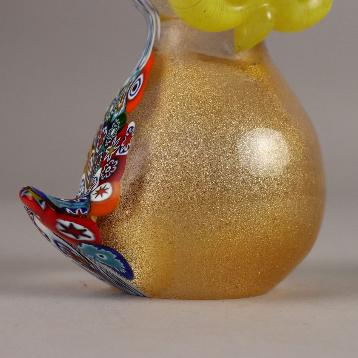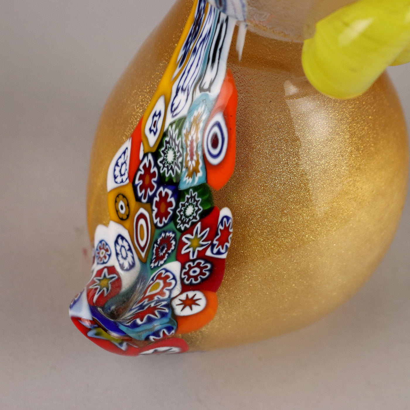 Yellow and transparent glass owl with gold inclusions and polychrome murrine. Under the base, the manufacturer's mark. Vintage objects, vintage objects, 1960s articles, 1970s articles, 1930s articles, 1940s objects, 1950s objects, design articles.