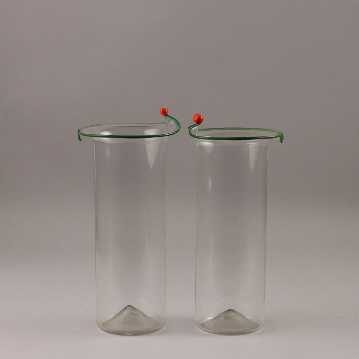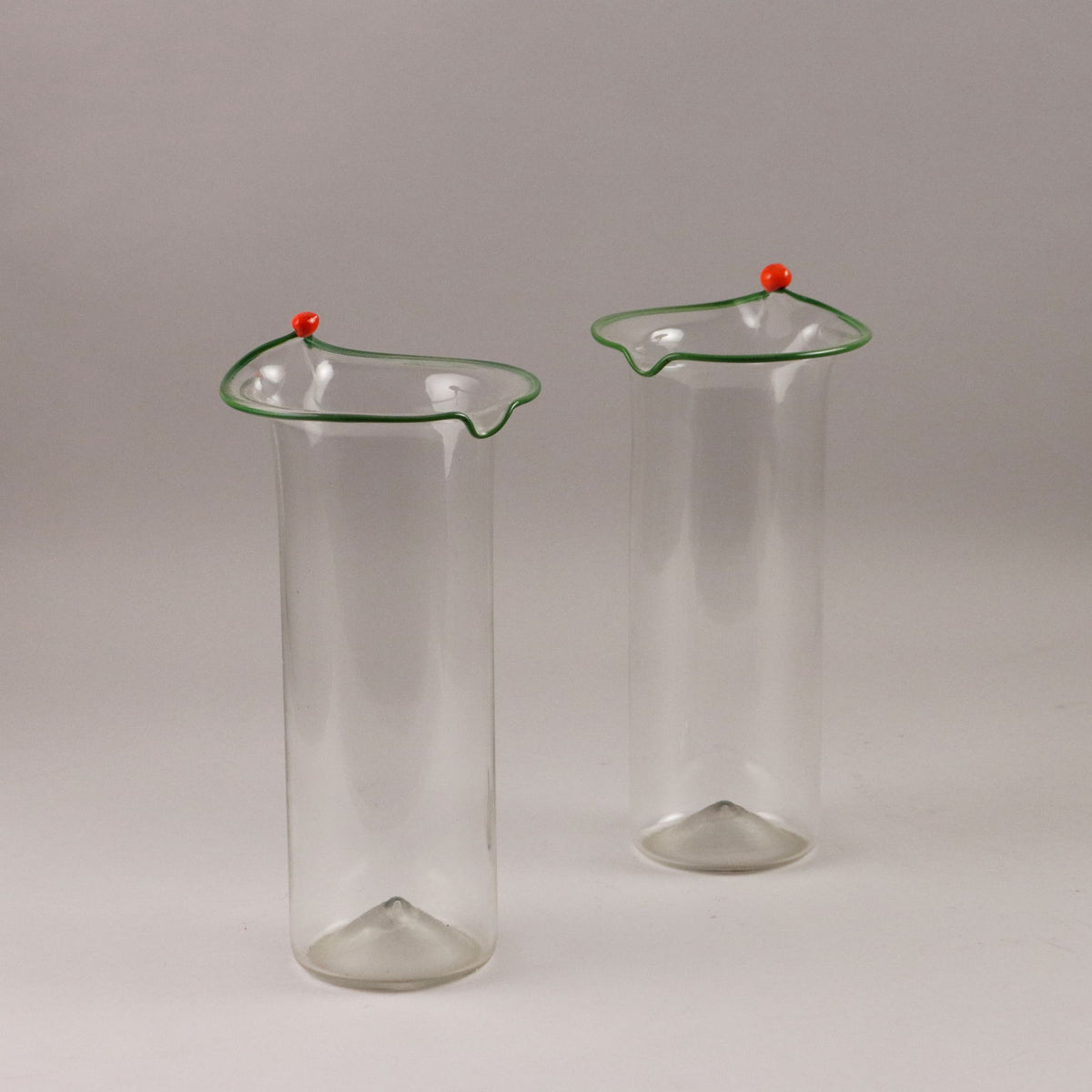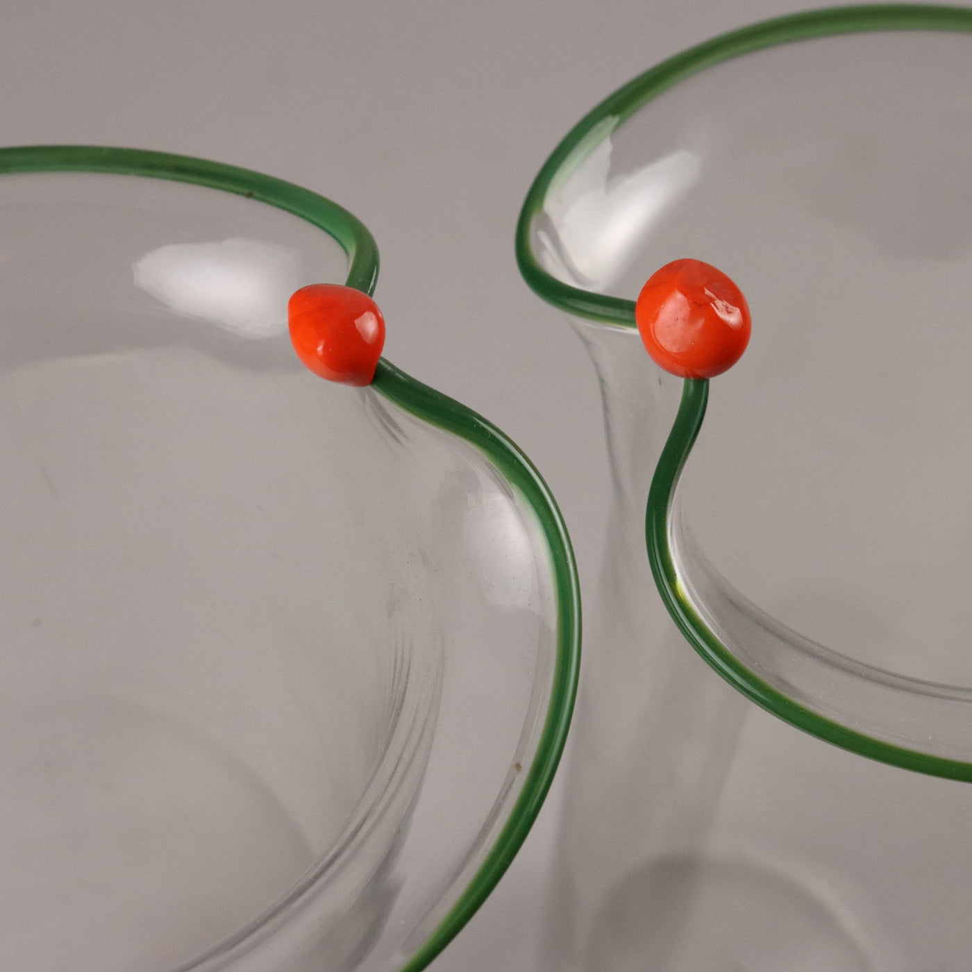 Pair of transparent glass vases with an everted edge profiled in green and orange. Under the base of a vase the manufacturer's signature is engraved: 'Venini Italia'. Vintage objects, vintage objects, 1960s articles, 1970s articles, 1930s articles, 1940s objects, 1950s objects, design articles.