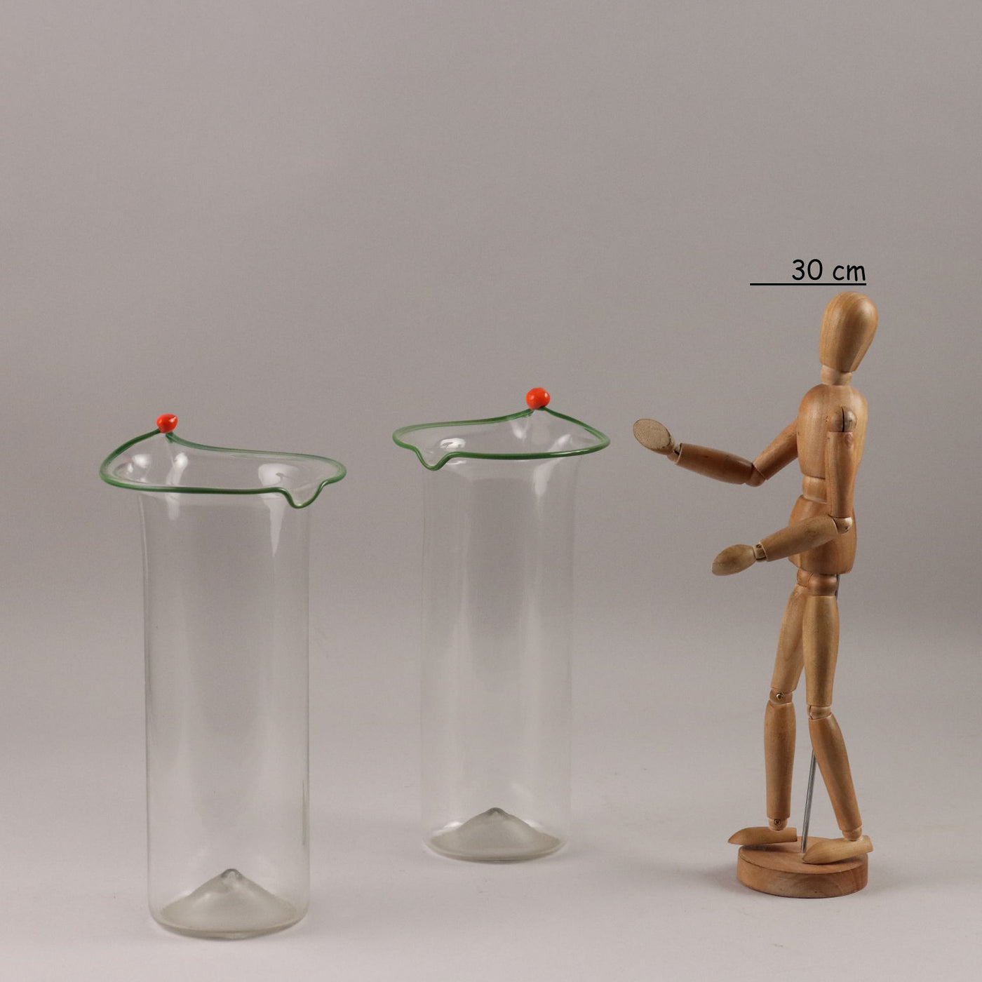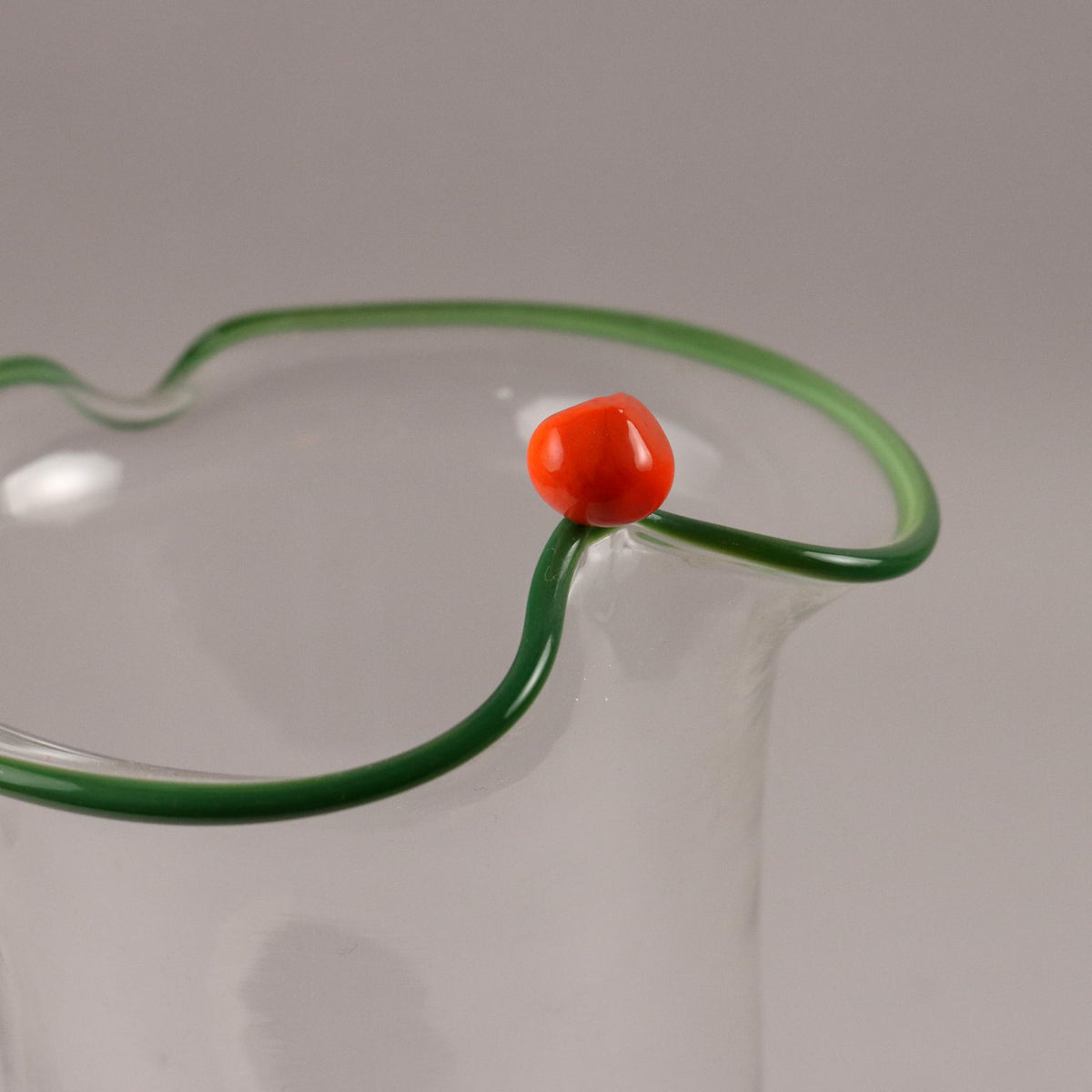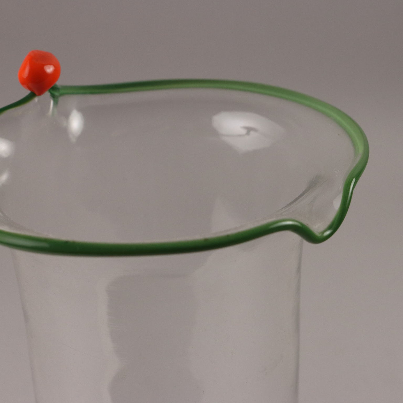 Pair of transparent glass vases with an everted edge profiled in green and orange. Under the base of a vase the manufacturer's signature is engraved: 'Venini Italia'. Vintage objects, vintage objects, 1960s articles, 1970s articles, 1930s articles, 1940s objects, 1950s objects, design articles.