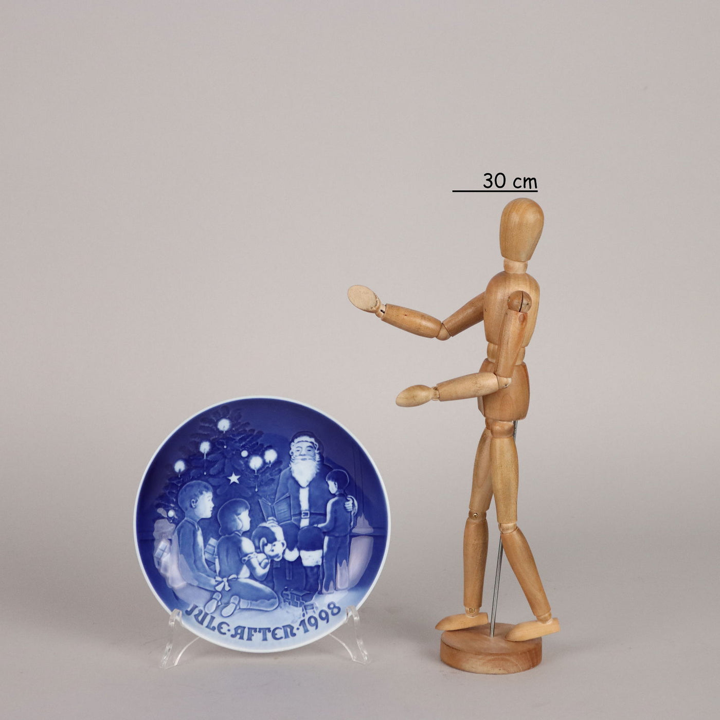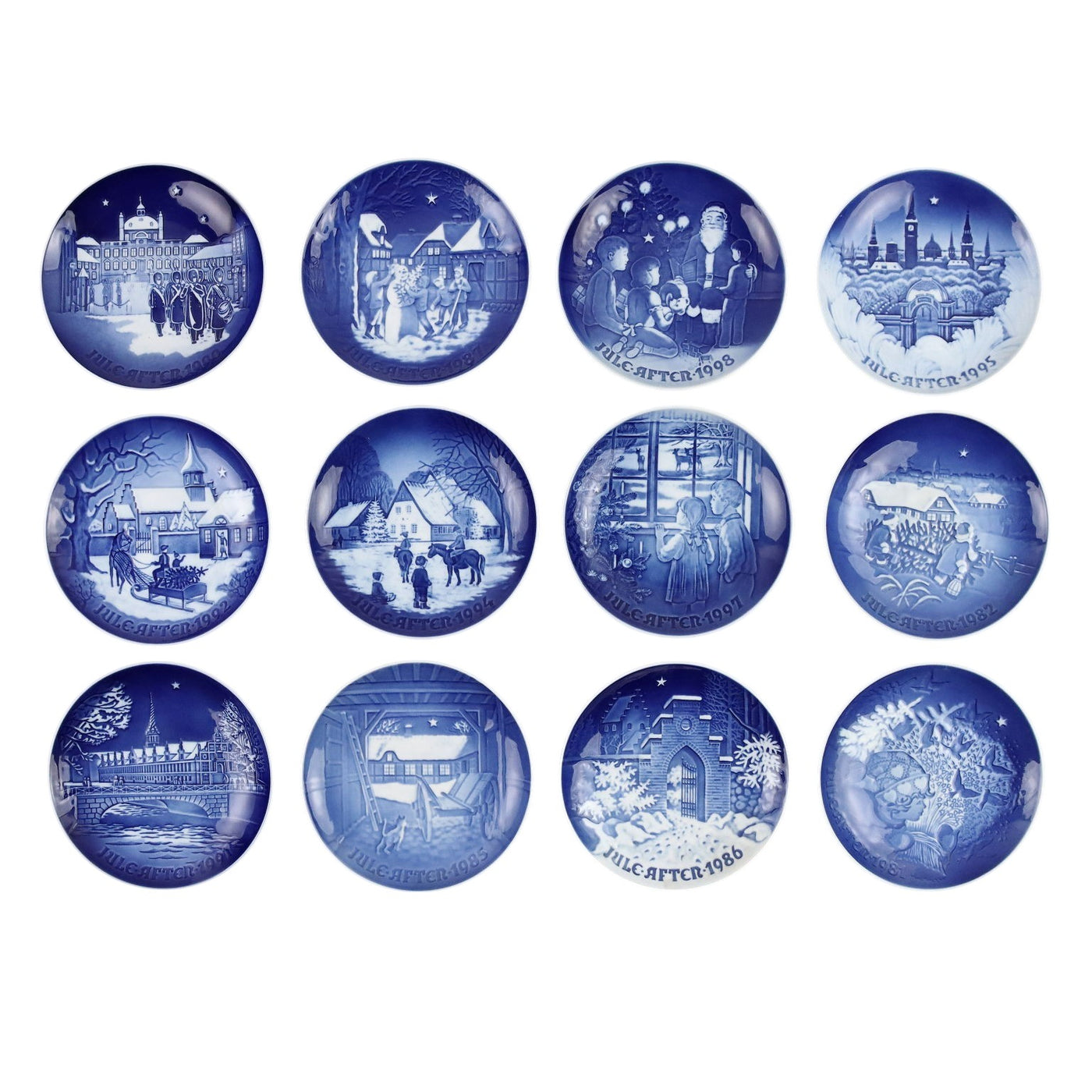 Group of twelve white porcelain plates with decorations in various shades of blue. The plates are from different years and the decorations feature different scenes. Manufacturer's mark under the base. Vintage plates, design ceramics, design plates, vintage objects, vintage objects, 1960s articles, 1970s articles, 1930s articles, 1940s objects, 1950s objects, design articles.