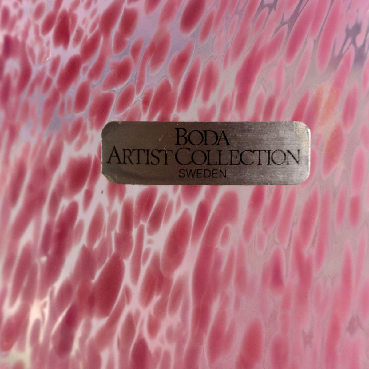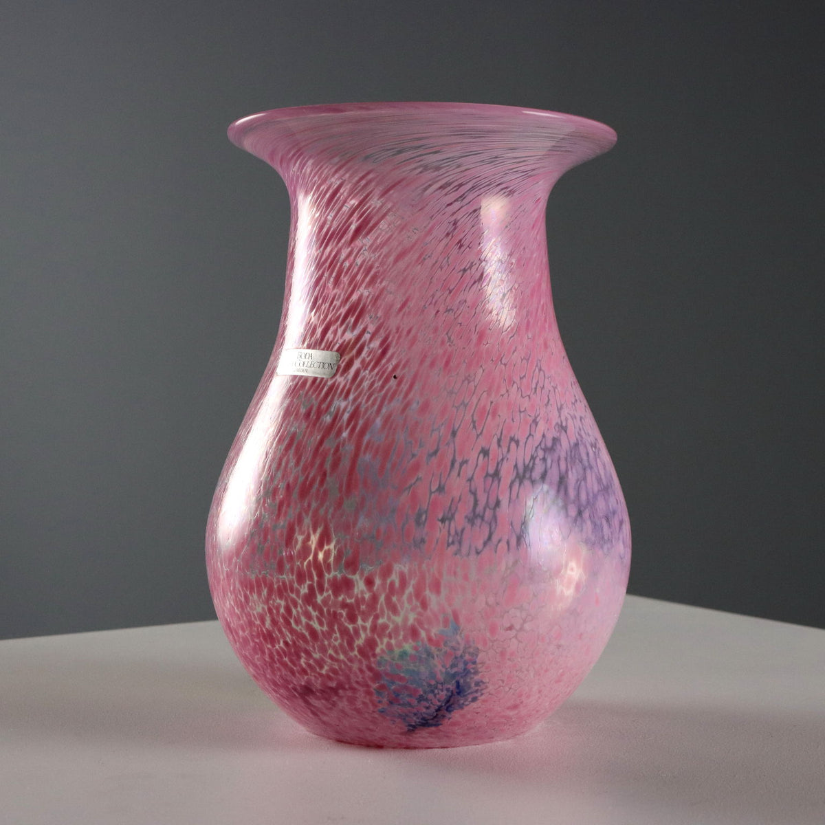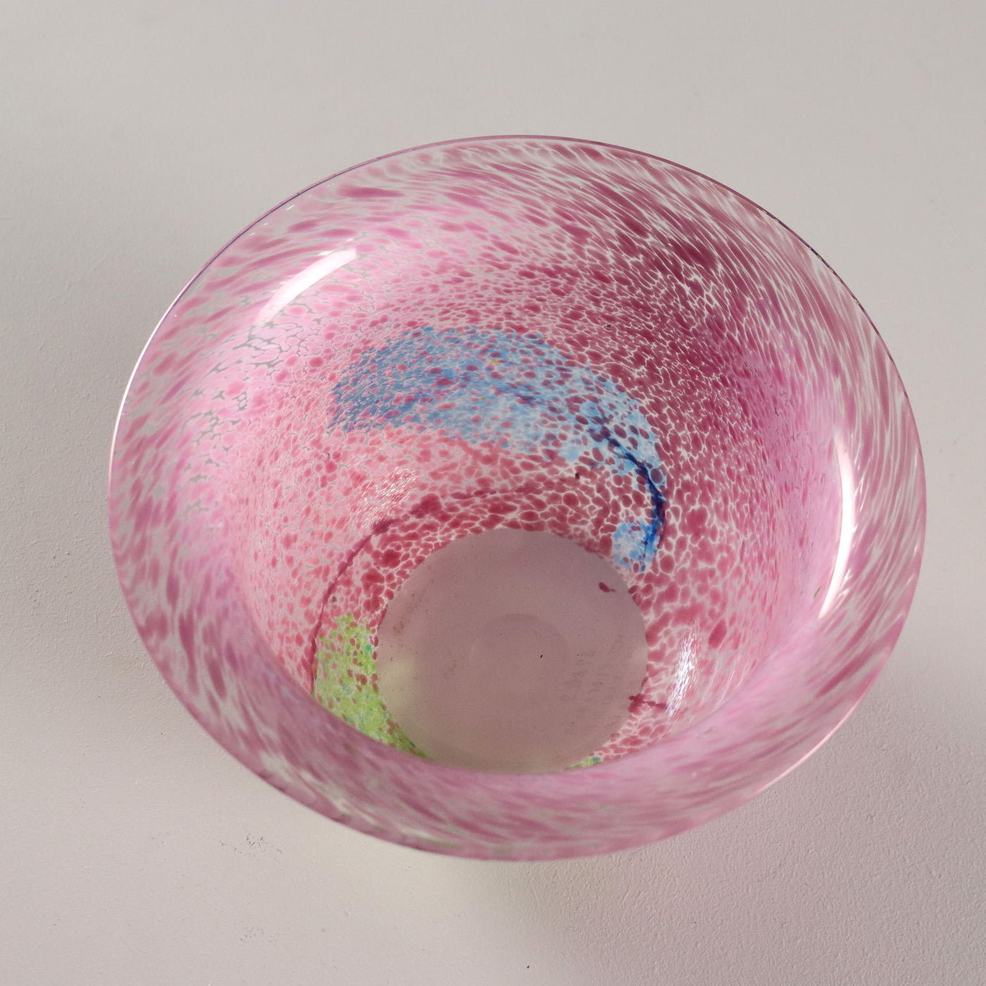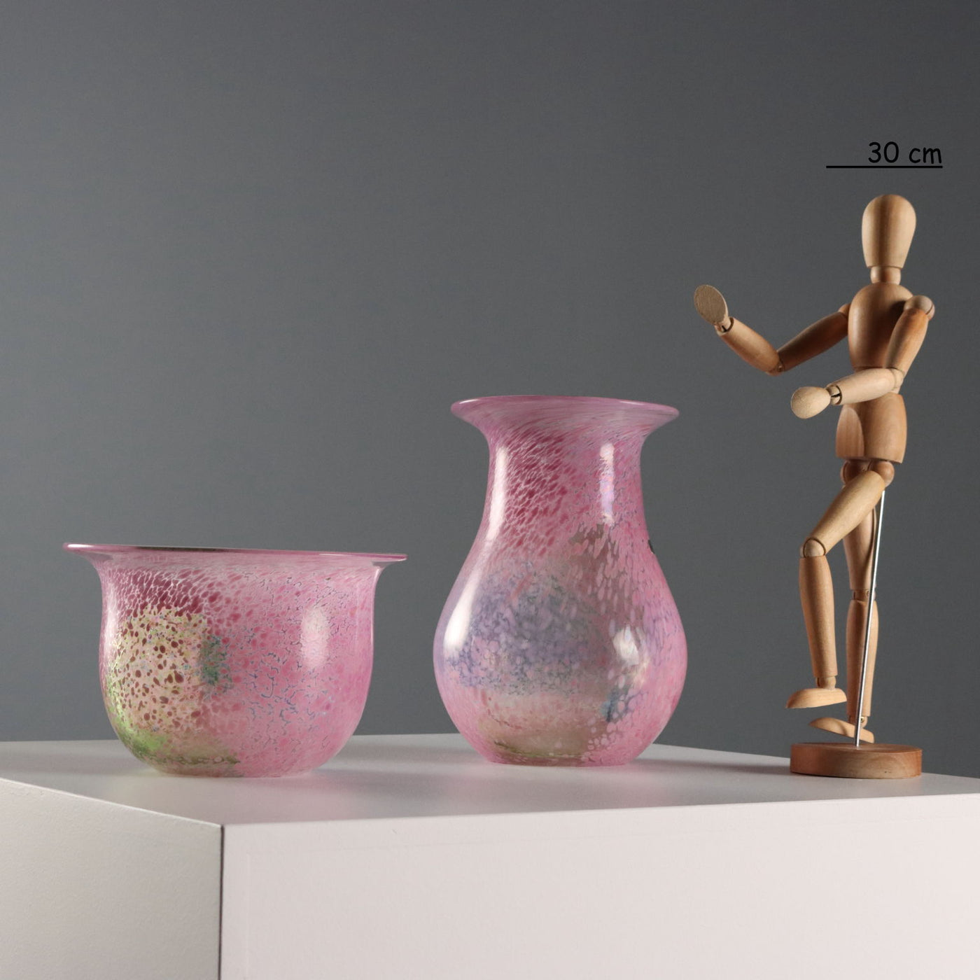 Pair of glass vases from the 'Artist Collection' series. Pink, green and blue polychrome spot decoration. Signature of the artist, manufacturer's mark and code engraved under the base. Manufacturer's label applied. Vintage objects, vintage objects, 1960s articles, 1970s articles, 1930s articles, 1940s objects, 1950s objects, design articles.