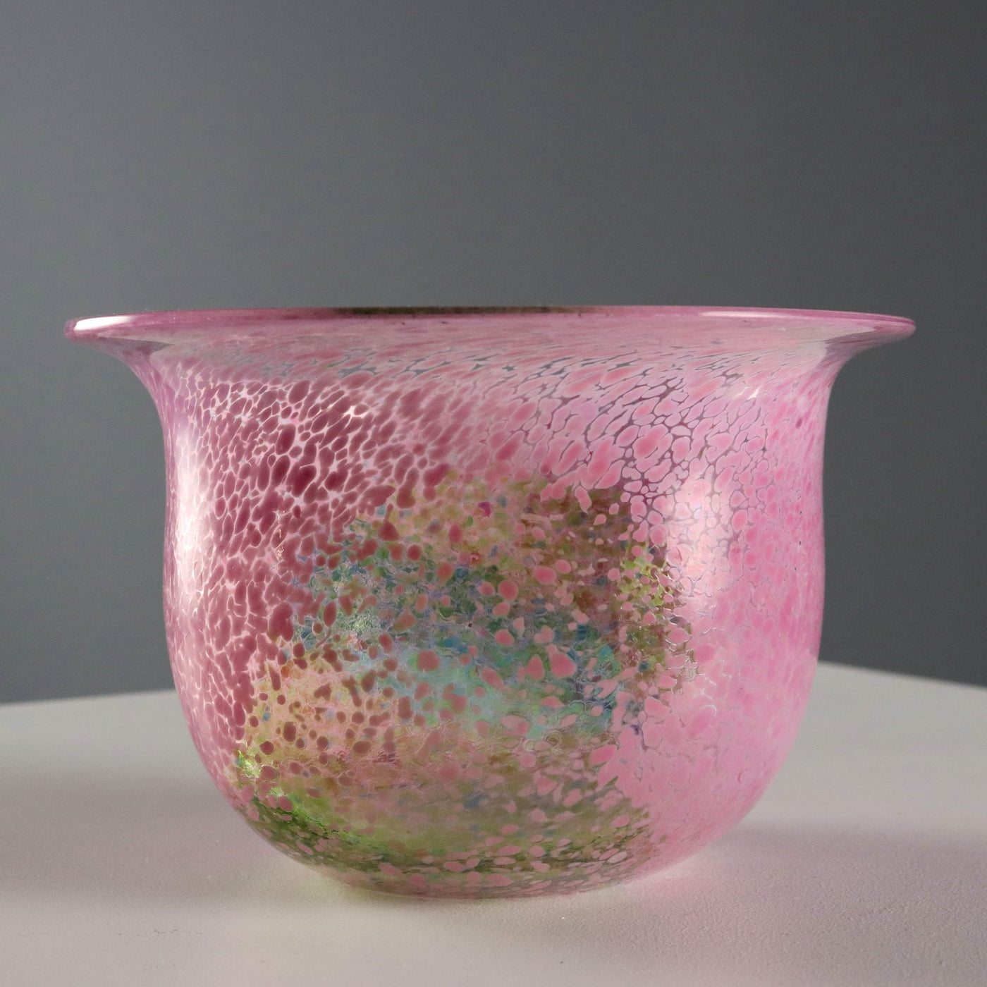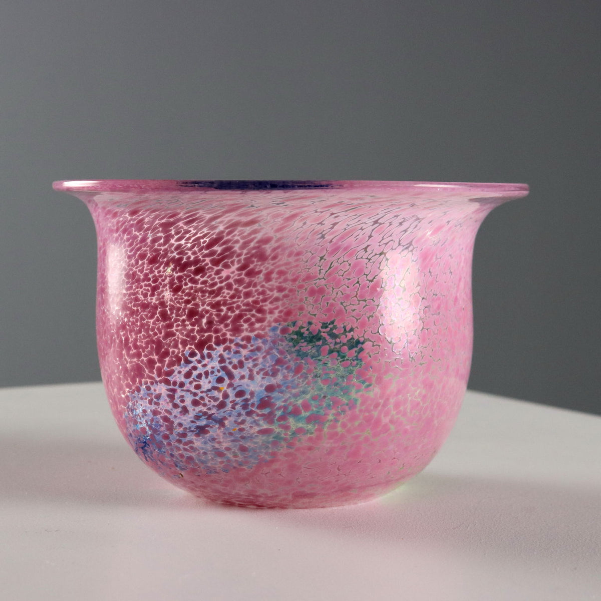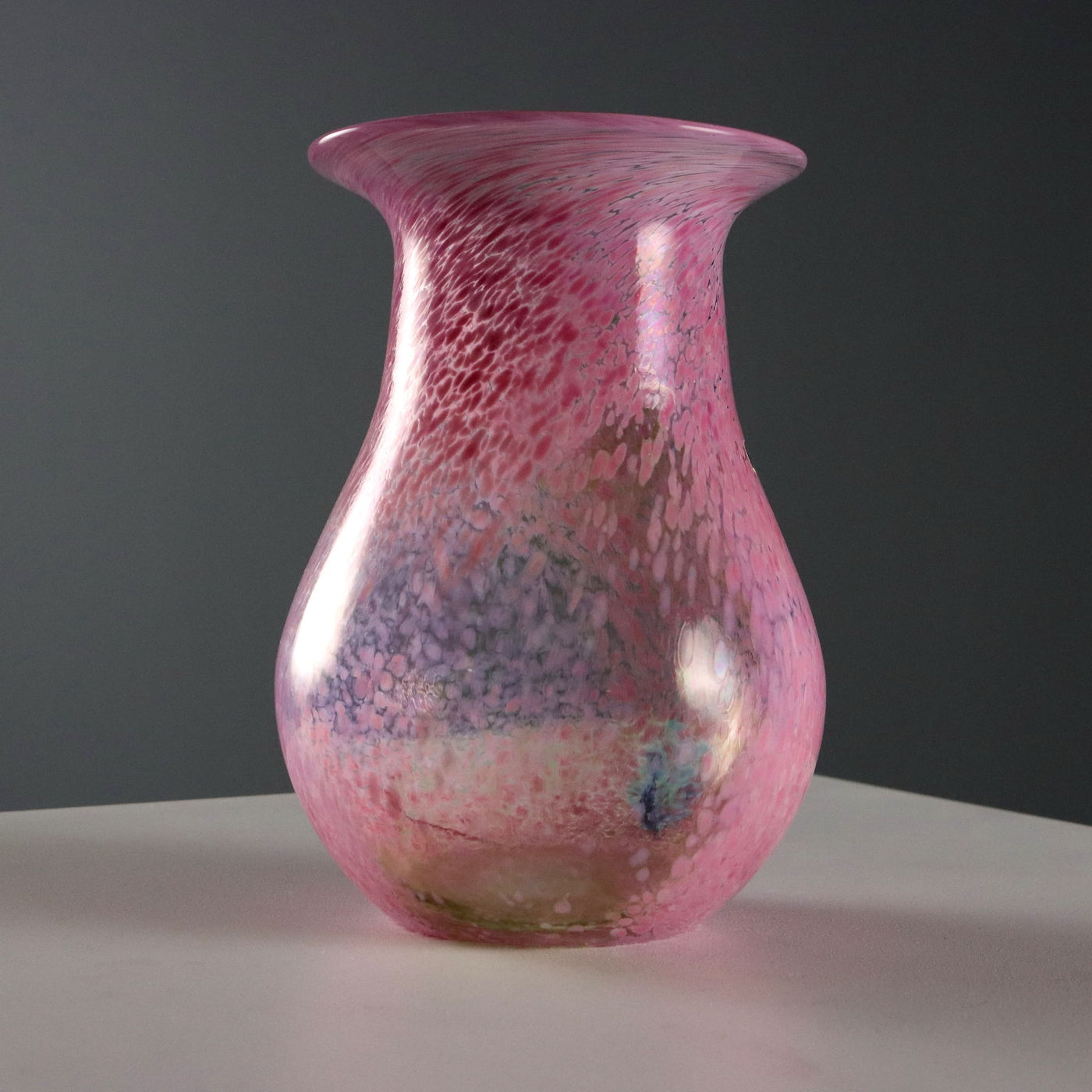 Pair of glass vases from the 'Artist Collection' series. Pink, green and blue polychrome spot decoration. Signature of the artist, manufacturer's mark and code engraved under the base. Manufacturer's label applied. Vintage objects, vintage objects, 1960s articles, 1970s articles, 1930s articles, 1940s objects, 1950s objects, design articles.