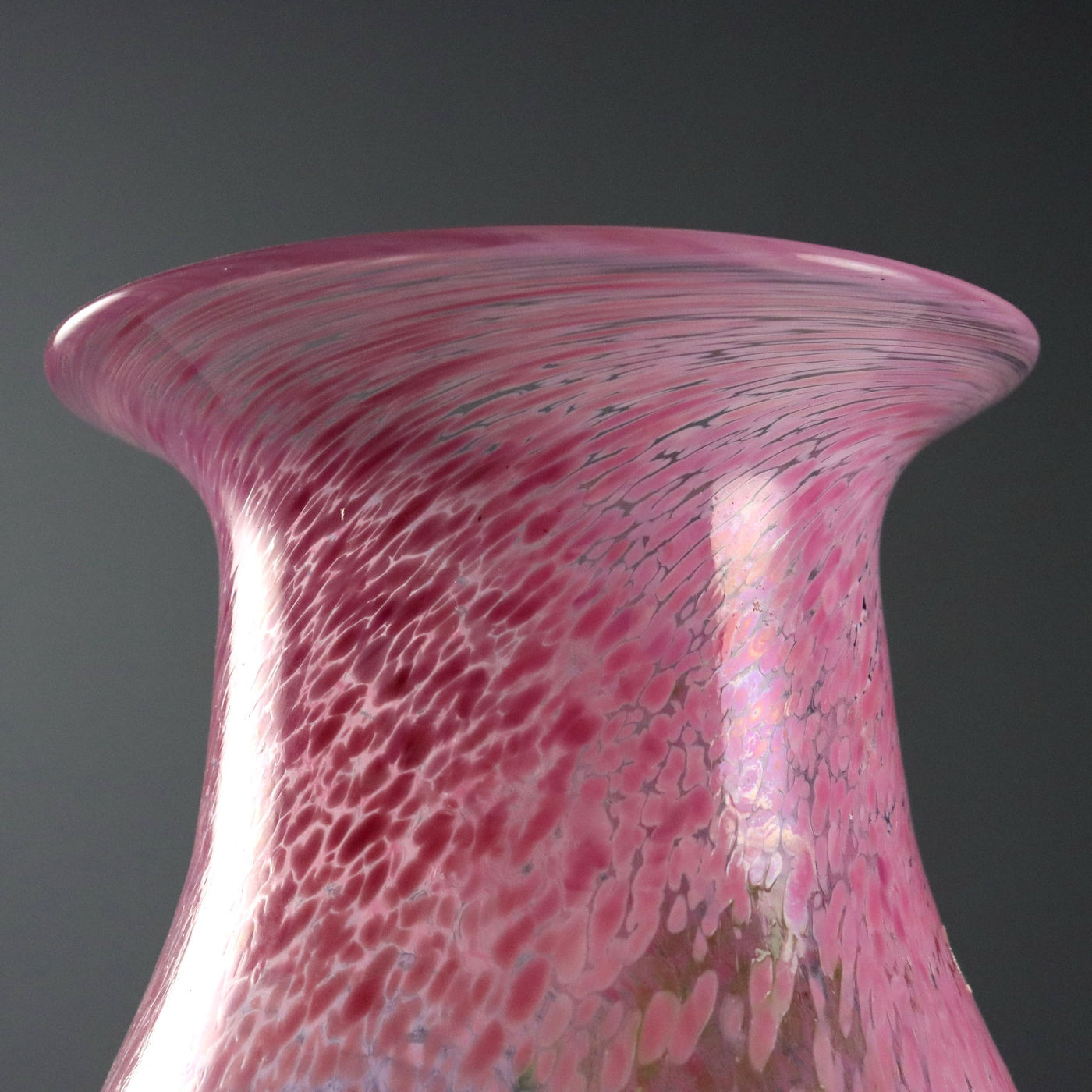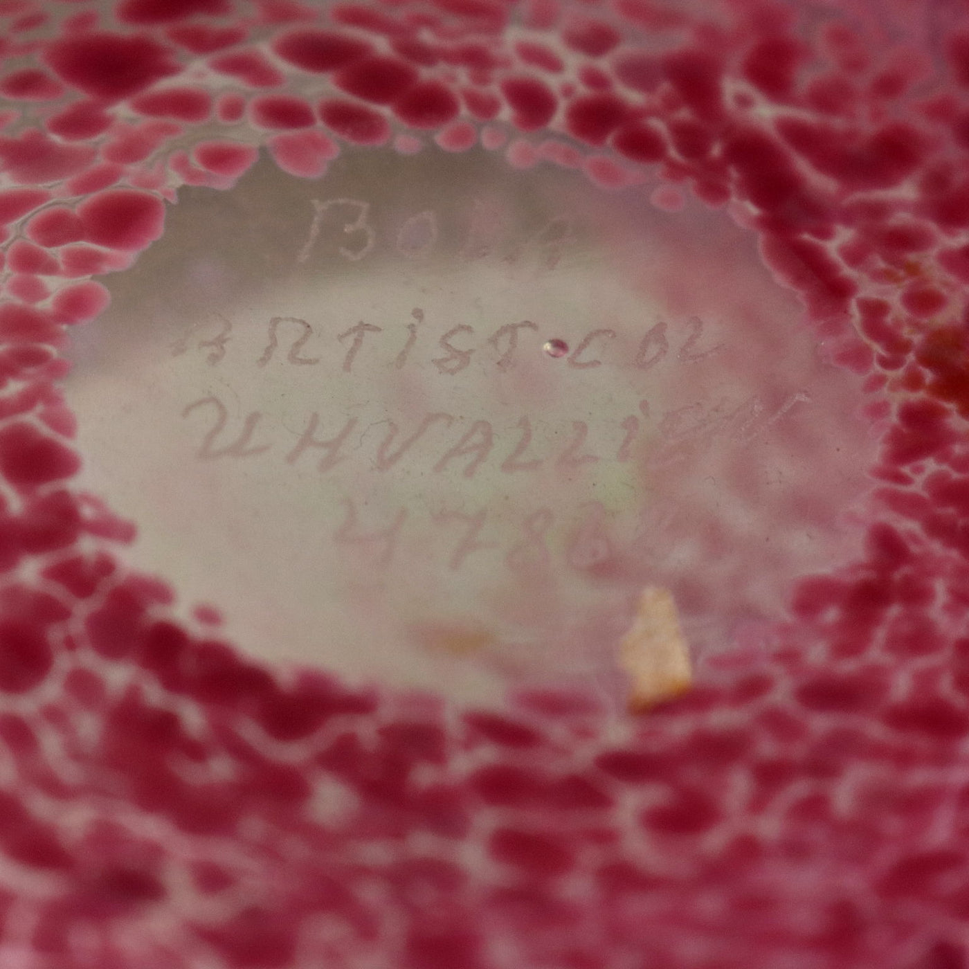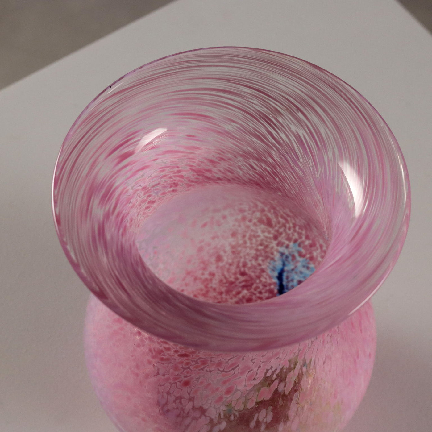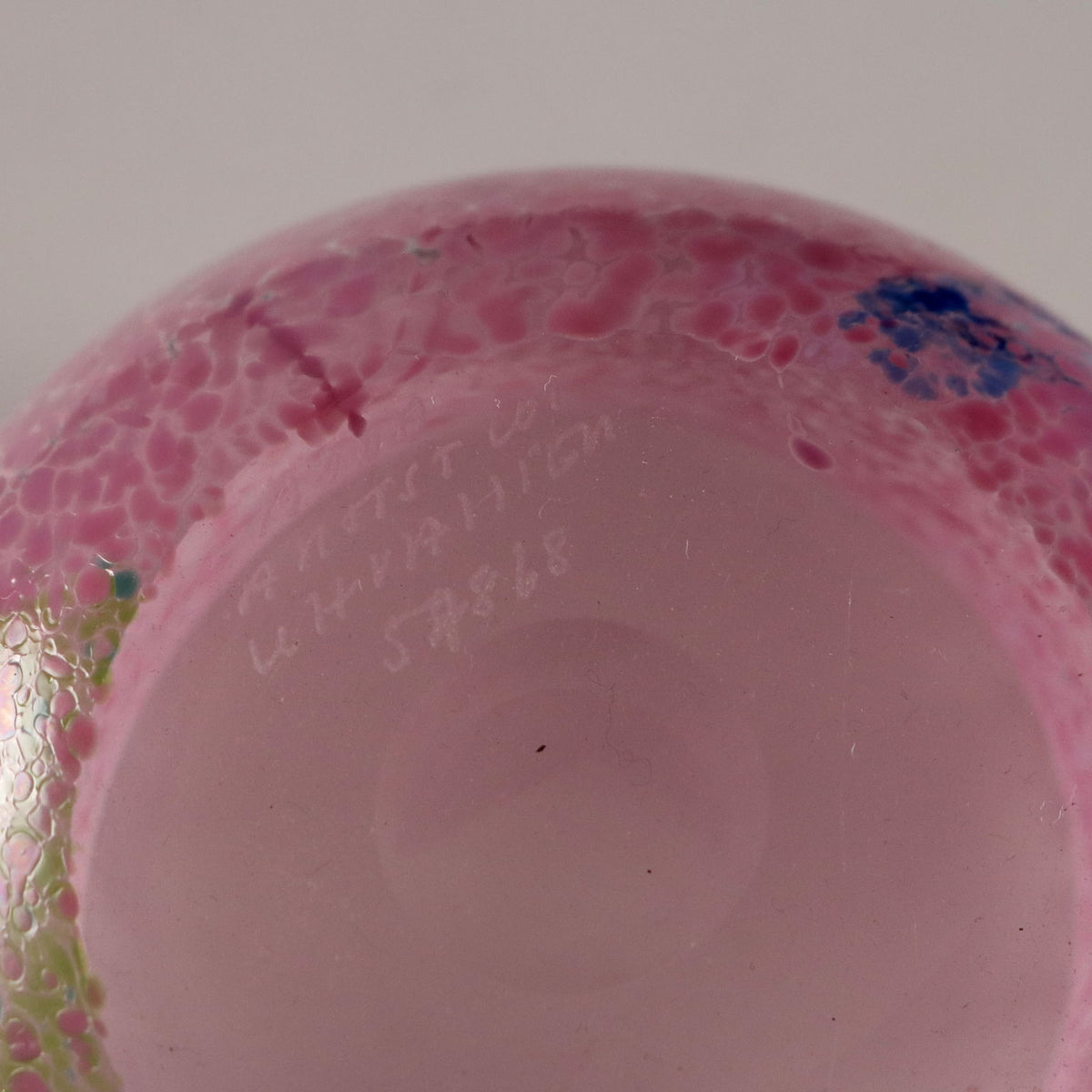 Pair of glass vases from the 'Artist Collection' series. Pink, green and blue polychrome spot decoration. Signature of the artist, manufacturer's mark and code engraved under the base. Manufacturer's label applied. Vintage objects, vintage objects, 1960s articles, 1970s articles, 1930s articles, 1940s objects, 1950s objects, design articles.