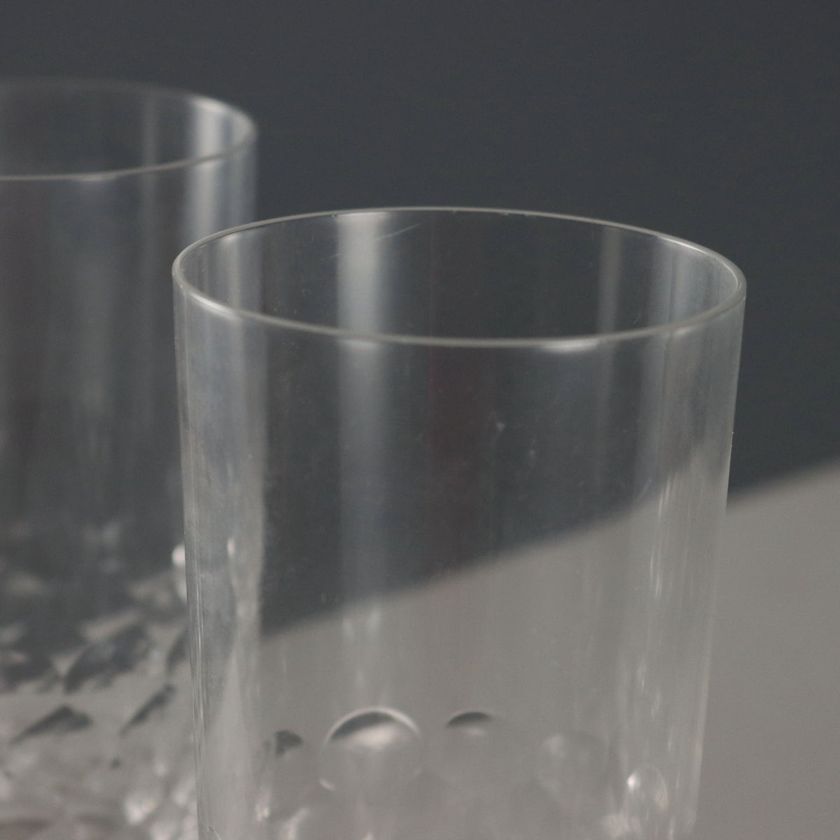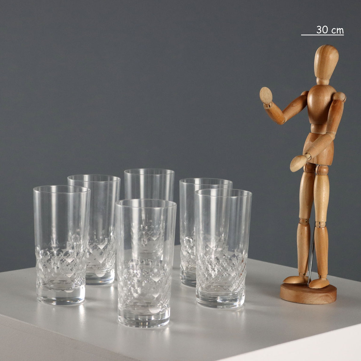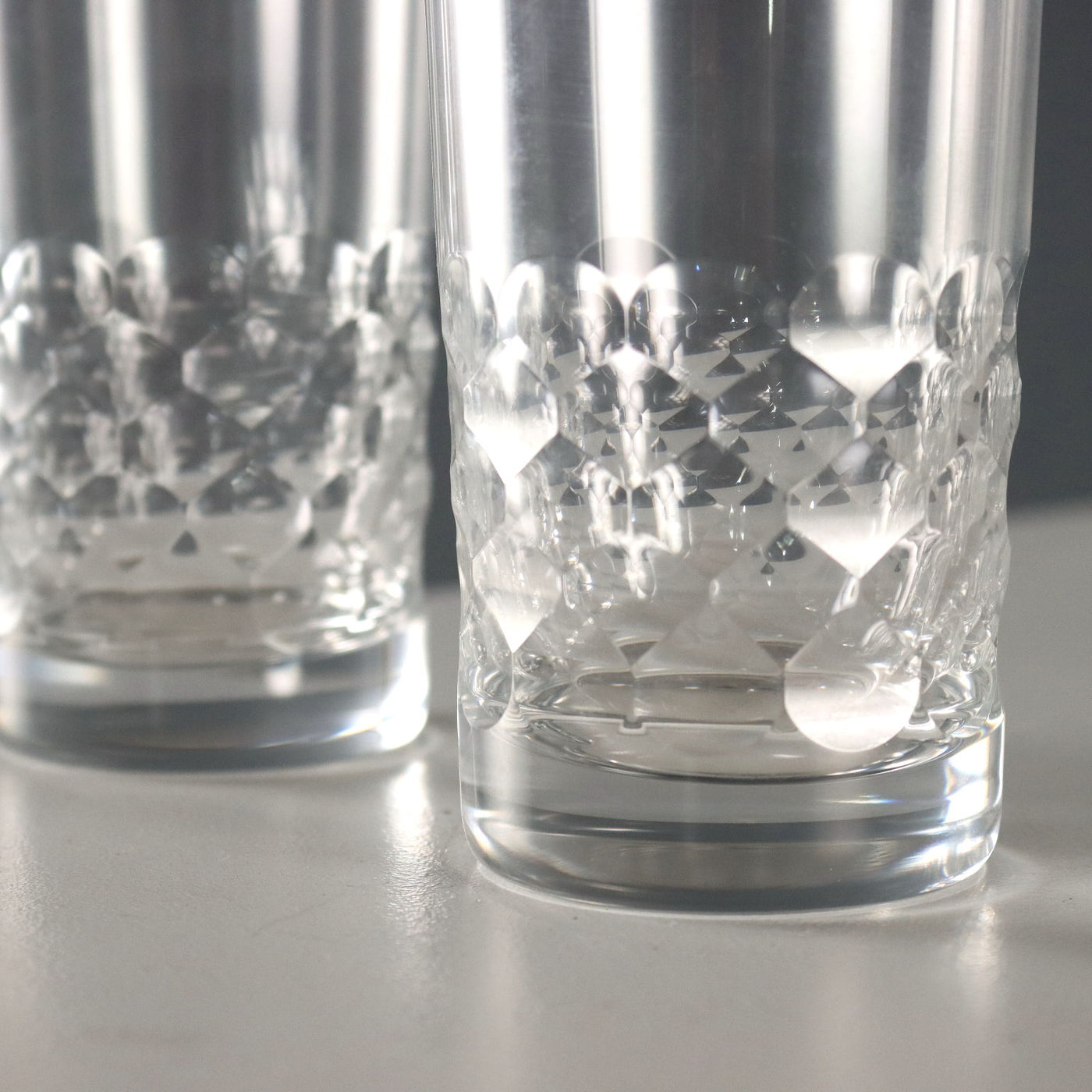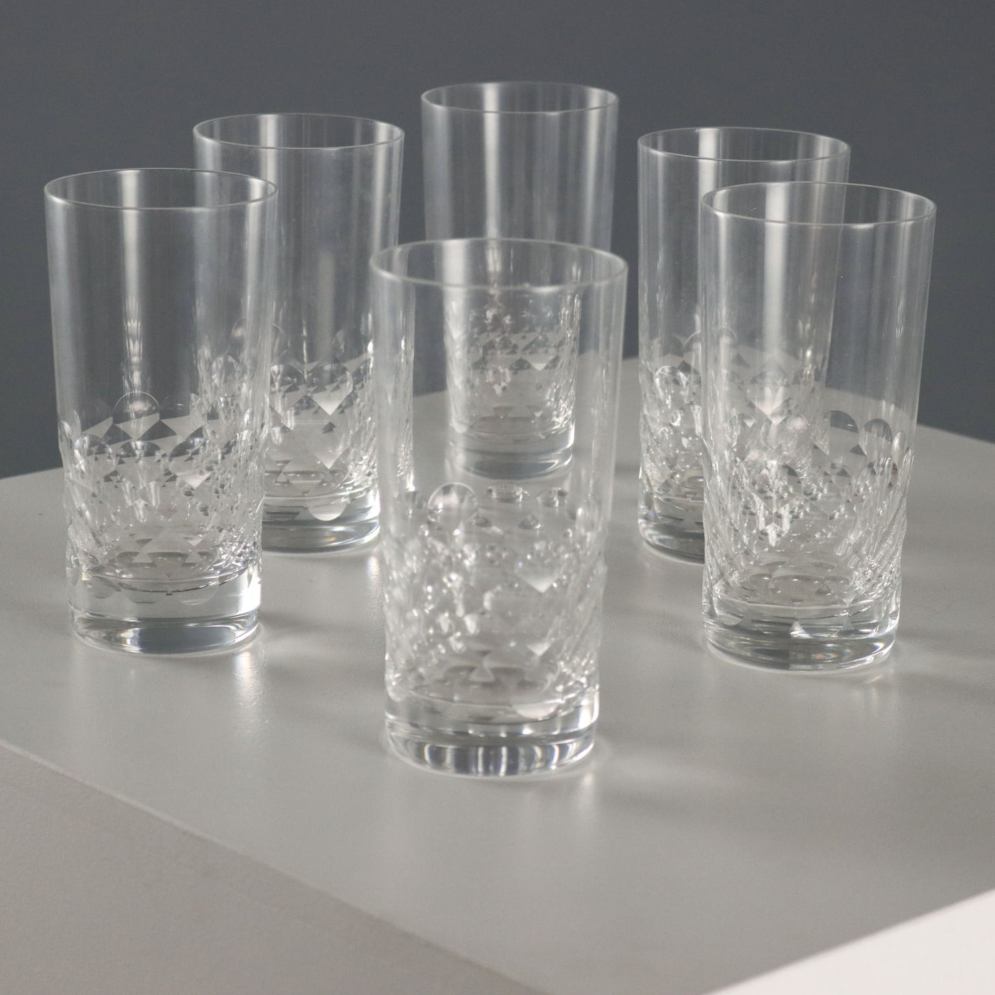 Six Baccarat Chauny crystal Highball glasses with honeycomb motif. Vintage objects, vintage objects, 1960s articles, 1970s articles, 1930s articles, 1940s objects, 1950s objects, design articles.