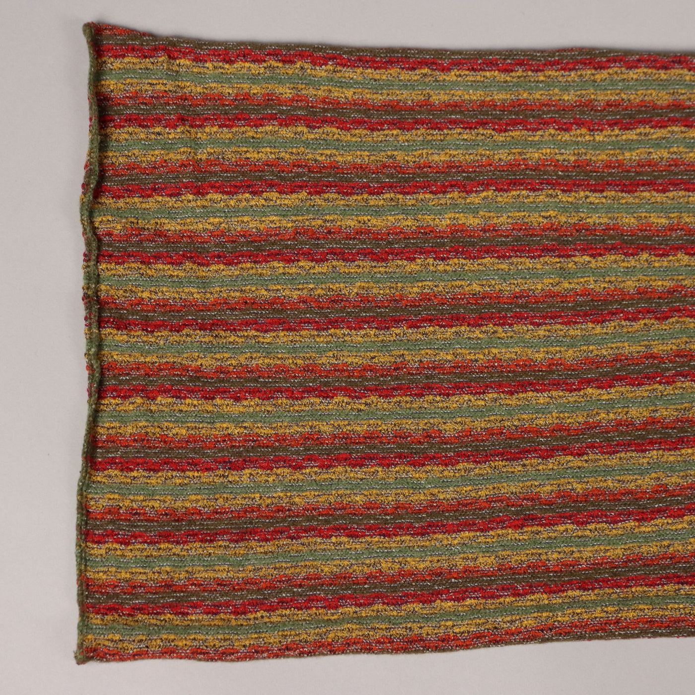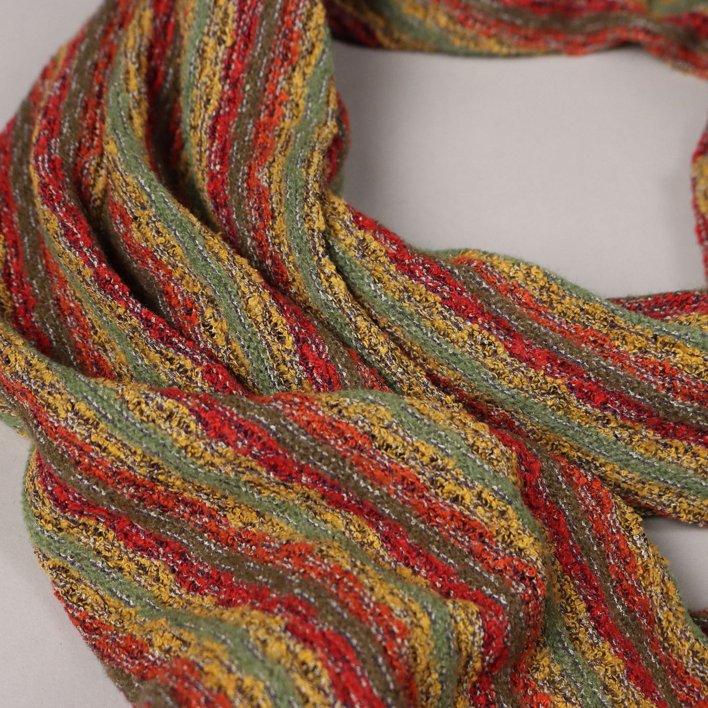 Lightweight scarf with striped texture in warm shades of red, orange, yellow and green. Perfect for giving a touch of color and originality to your outfit. Second-hand, , vintage men's clothes, vintage lady's clothing, vintage scraves, 1950s trousers, 1950s skirts, 1960s skirts, second-hand, vintage trousers, 1980s skirts, used men's coat, used women's coats, used bags, second-hand bags, used clothes, vintage clothes, vintage shoes, 1970s jacket, 1950s jacket, 1960s scarf, 1950s scarf, 1940s scarf, vintage scarf, 1980s jacket, vintage objects, 1980s objects, 1970s objects, ancient jacket.