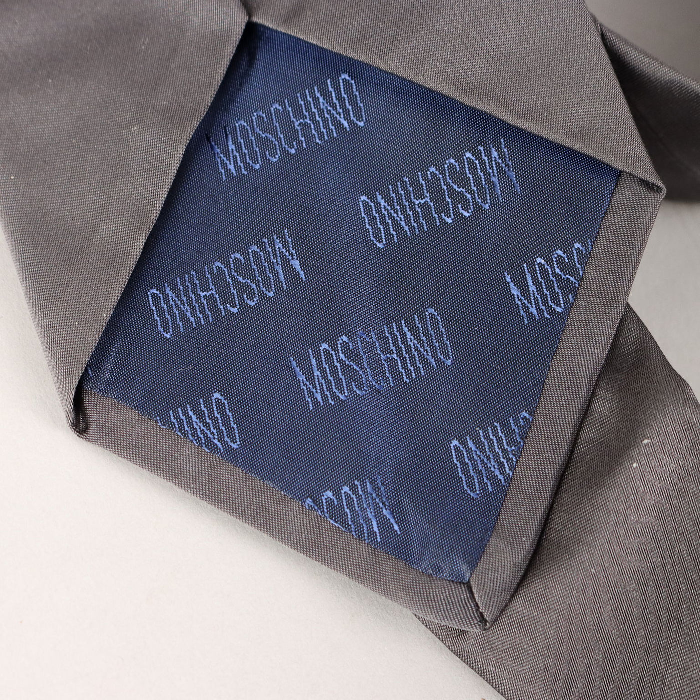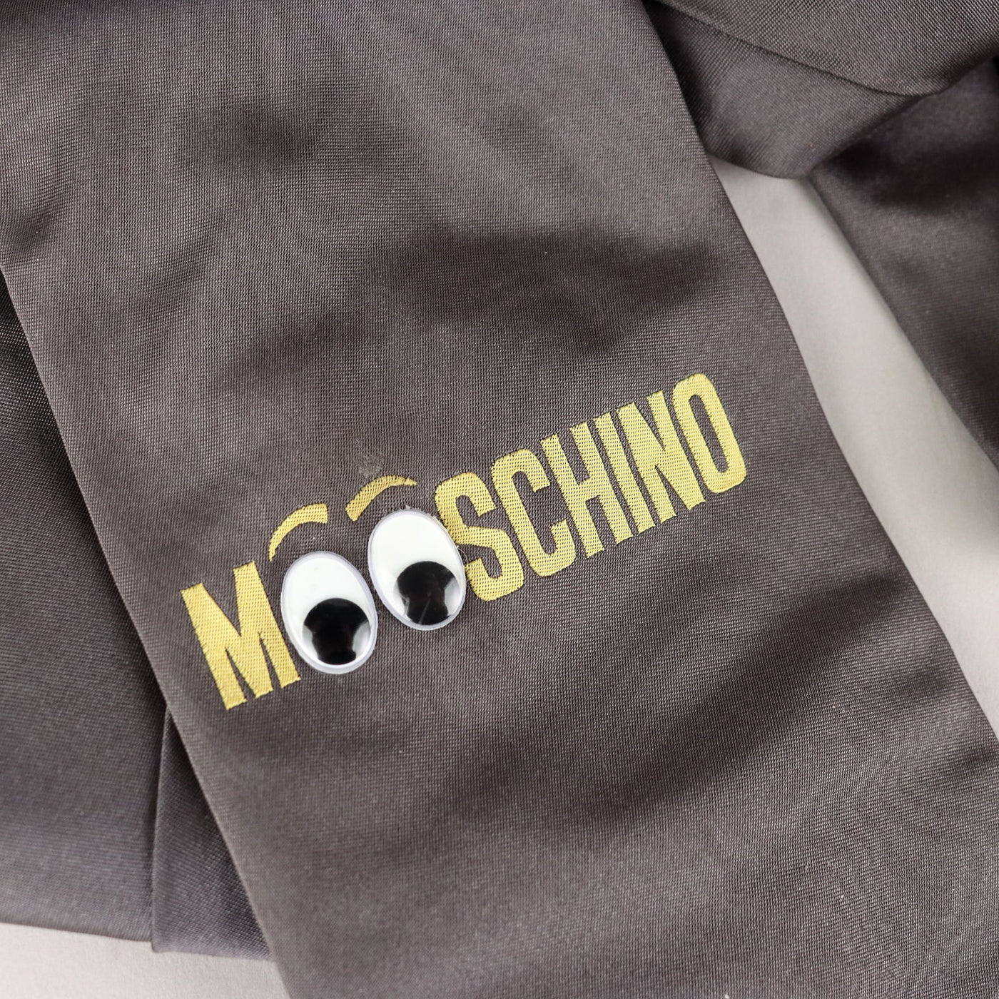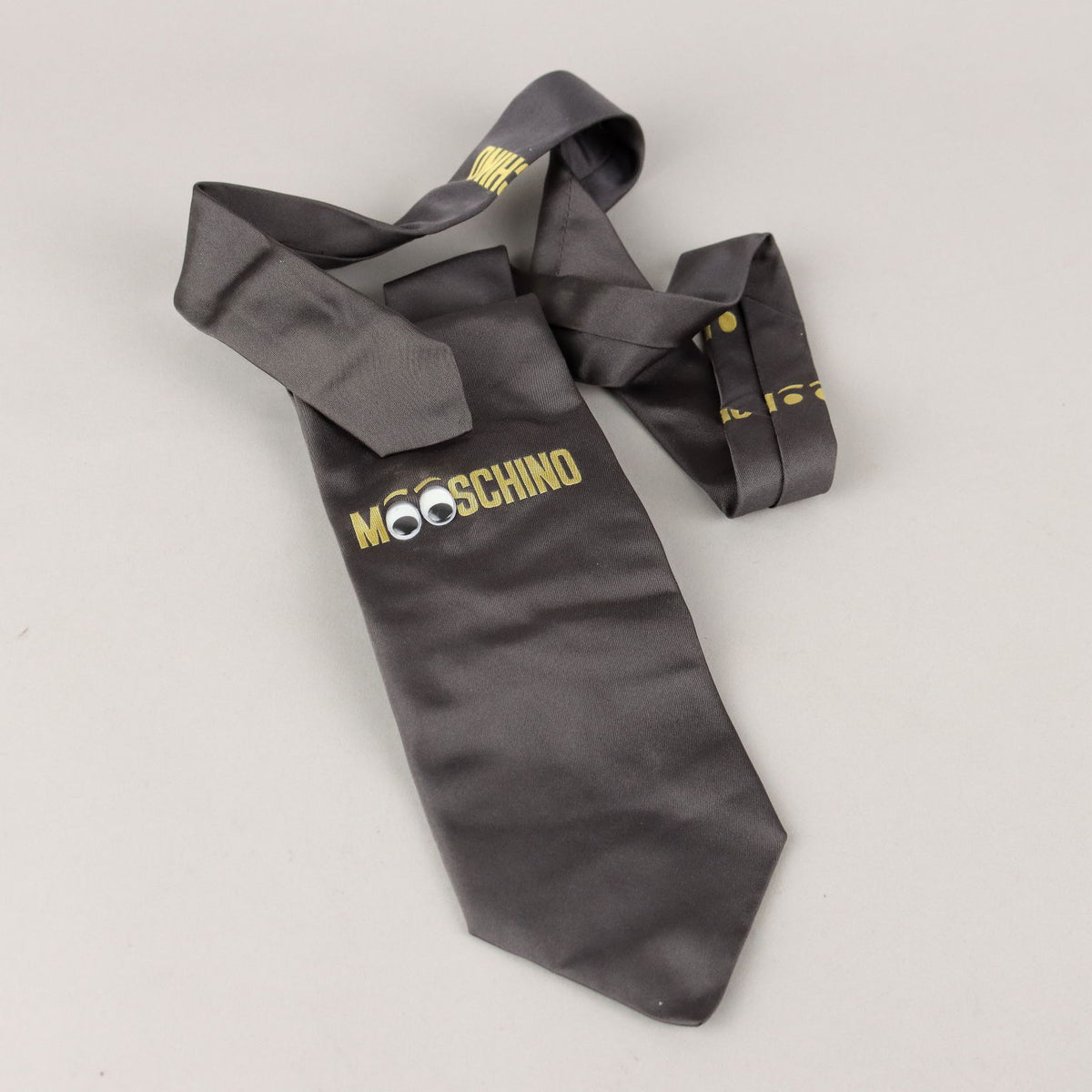 Grey pure silk tie with golden writing and applied plastic eyes, in comic style. Second-hand, , vintage men's clothes, vintage lady's clothing, vintage scraves, 1950s trousers, 1950s skirts, 1960s skirts, second-hand, vintage trousers, 1980s skirts, used men's coat, used women's coats, used bags, second-hand bags, used clothes, vintage clothes, vintage shoes, clothing, 1990s shoes, 1980s shoes, 1970s shoes, 1960s shoes, 1950s shoes.