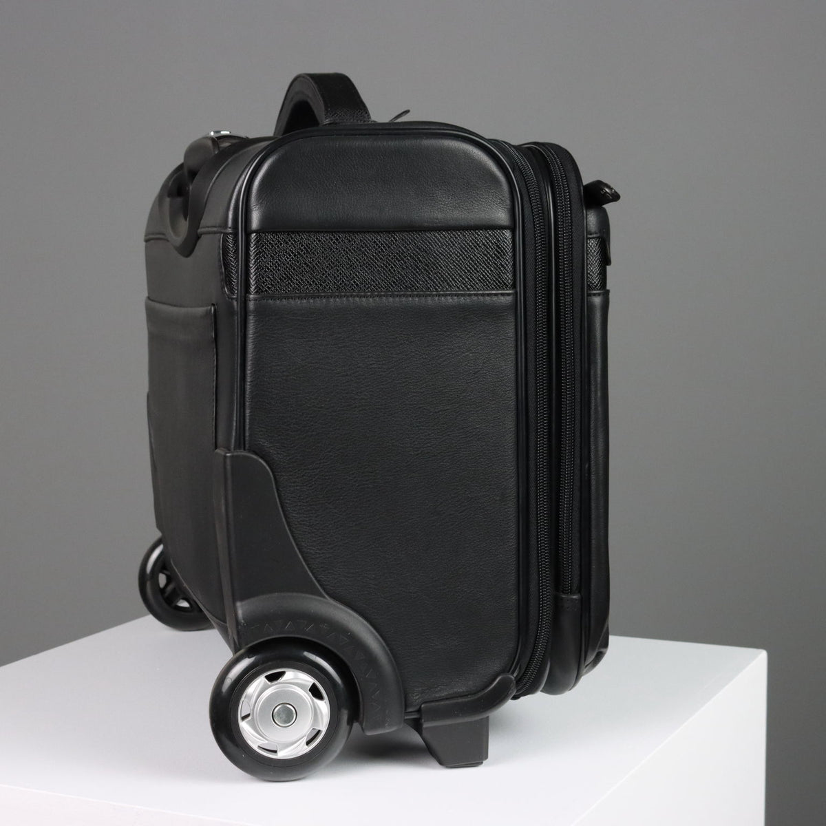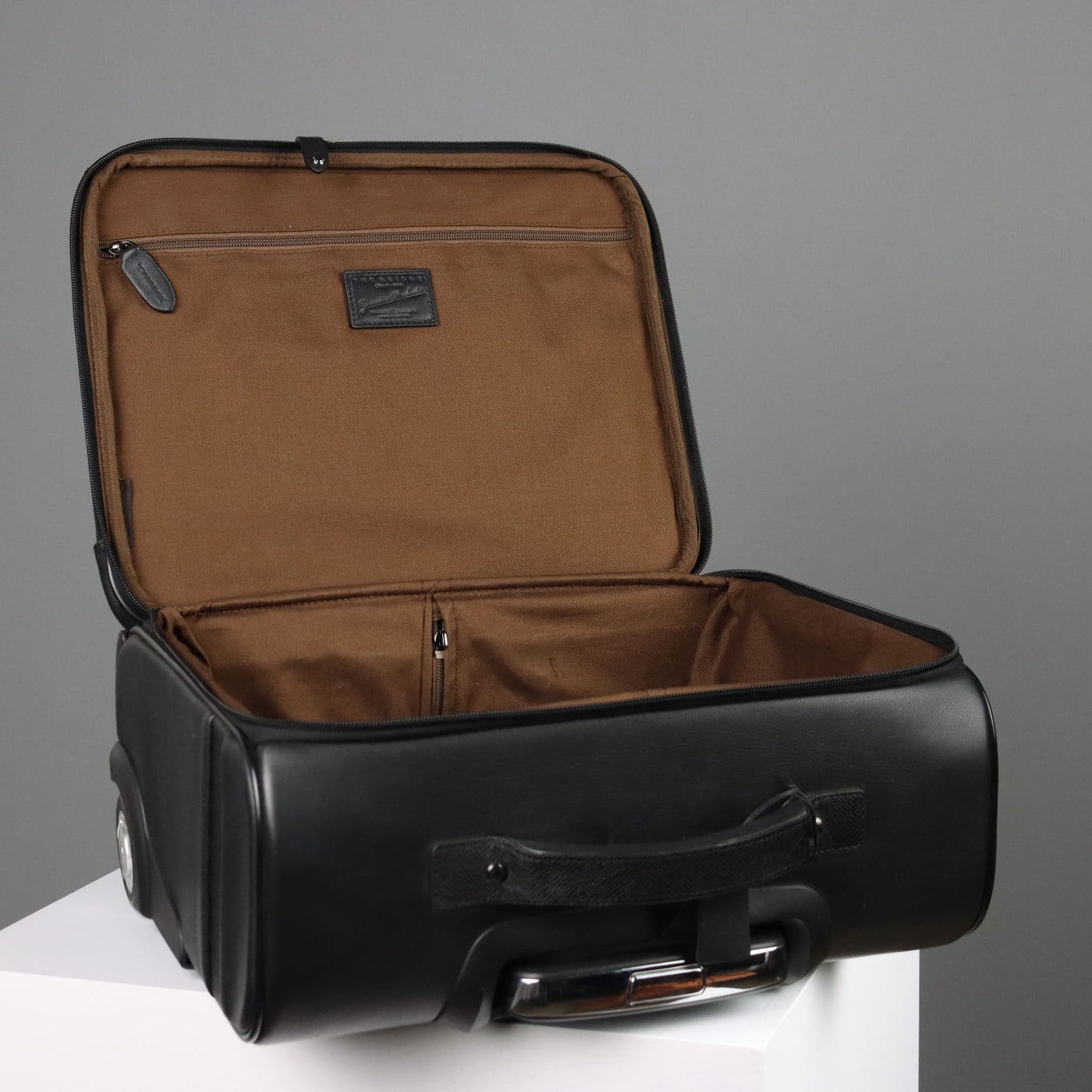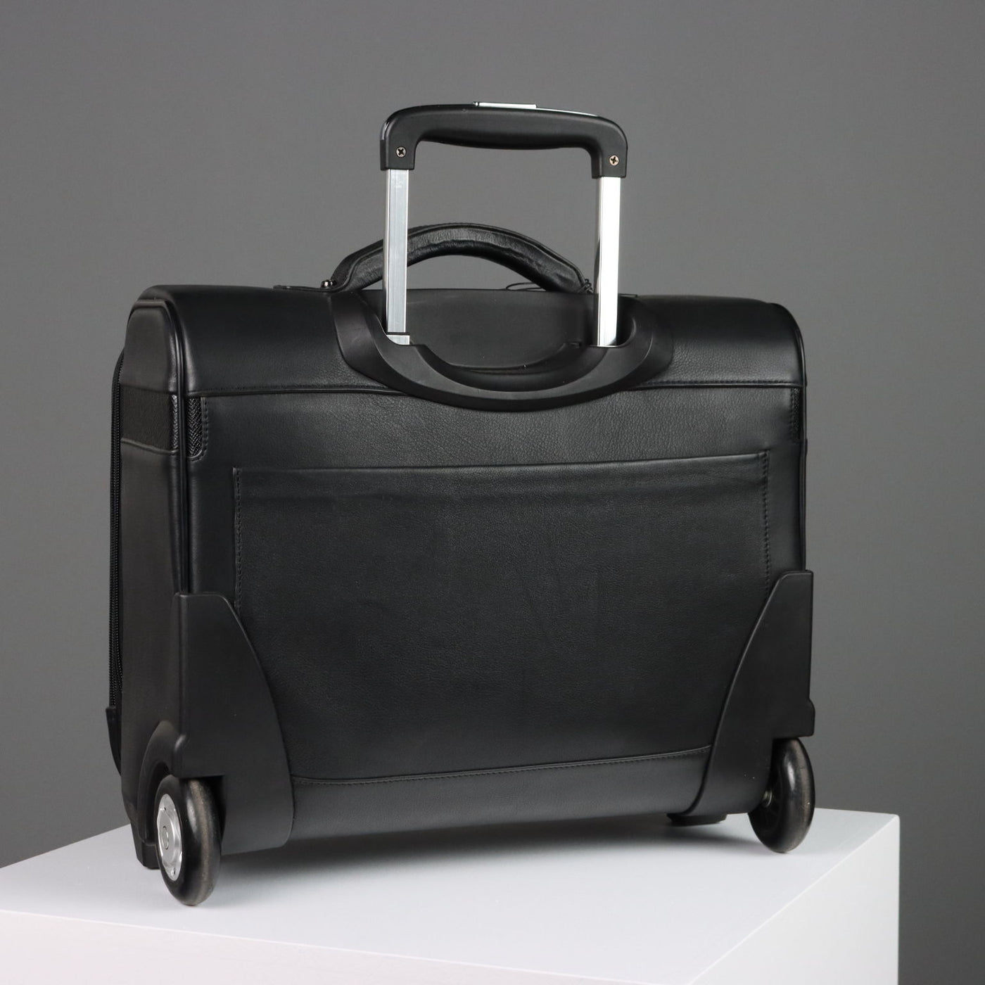 Soft black leather trolley, well organized in various compartments and pockets. The main compartment is roomy, equipped with a strap and a large zip pocket, inside there is also a combination lock, in its original packaging. On the front side there are additional compartments and pockets, as shown in the photo. Equipped with a sturdy leather handle and an extendable handle. The item seems to have never been used, the leather is in excellent condition, we only point out that two sliders are missing the leather strap. Second-hand, , vintage men's clothes, vintage lady's clothing, vintage scraves, 1950s trousers, 1950s skirts, 1960s skirts, second-hand, vintage trousers, 1980s skirts, used men's coat, used women's coats, used bags, second-hand bags, used clothes, vintage clothes, vintage shoes, clothing, 1990s shoes, 1980s shoes, 1970s shoes, 1960s shoes, 1950s shoes.