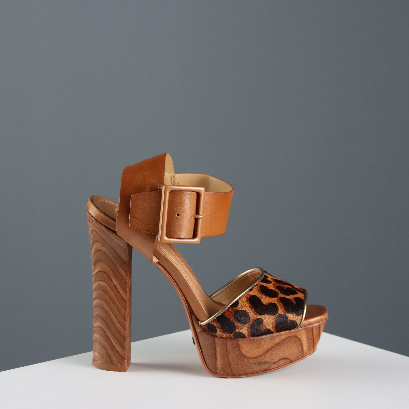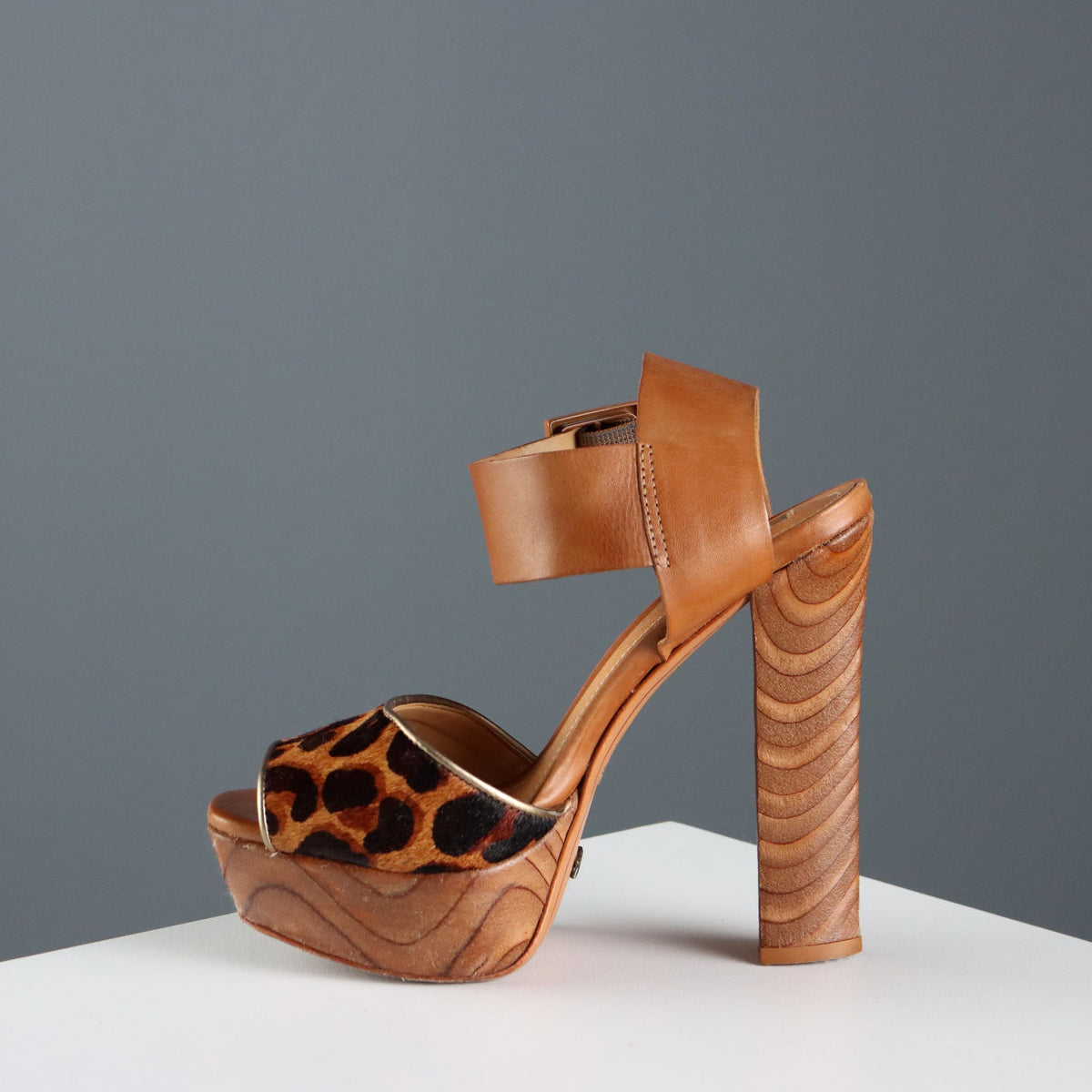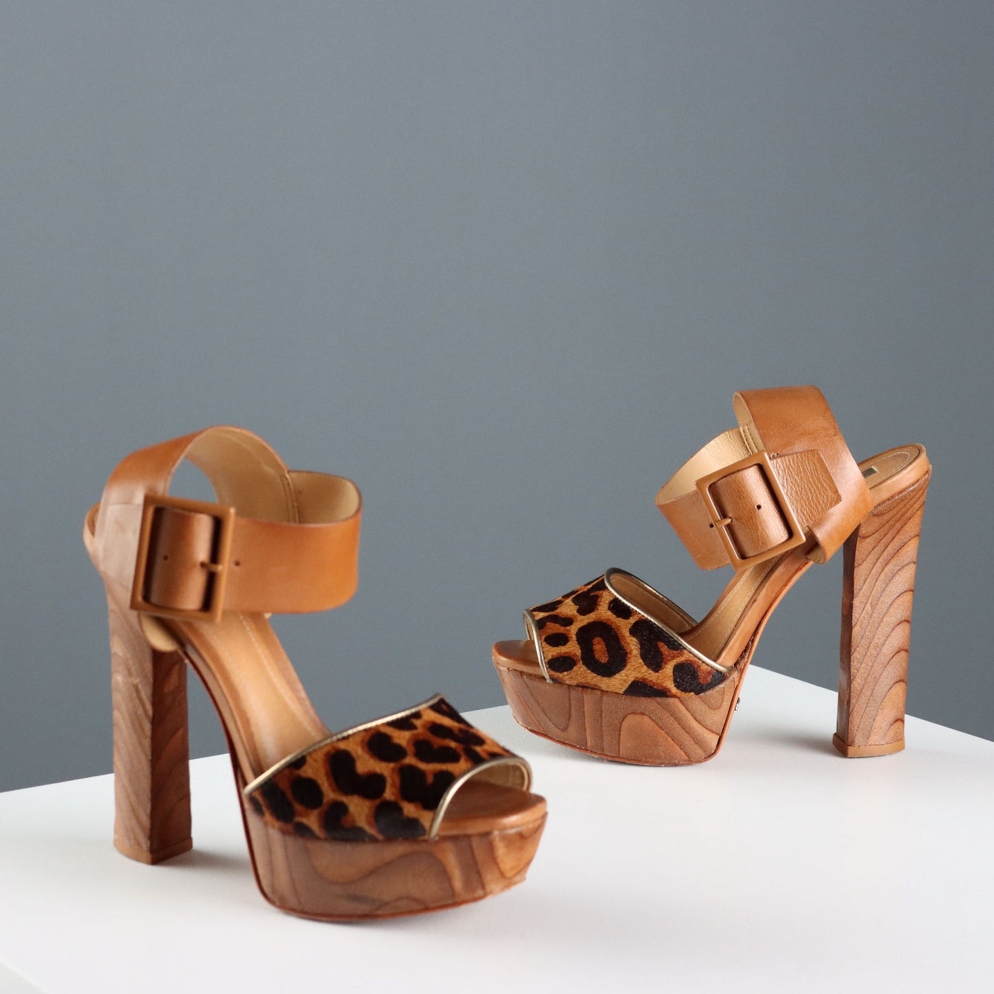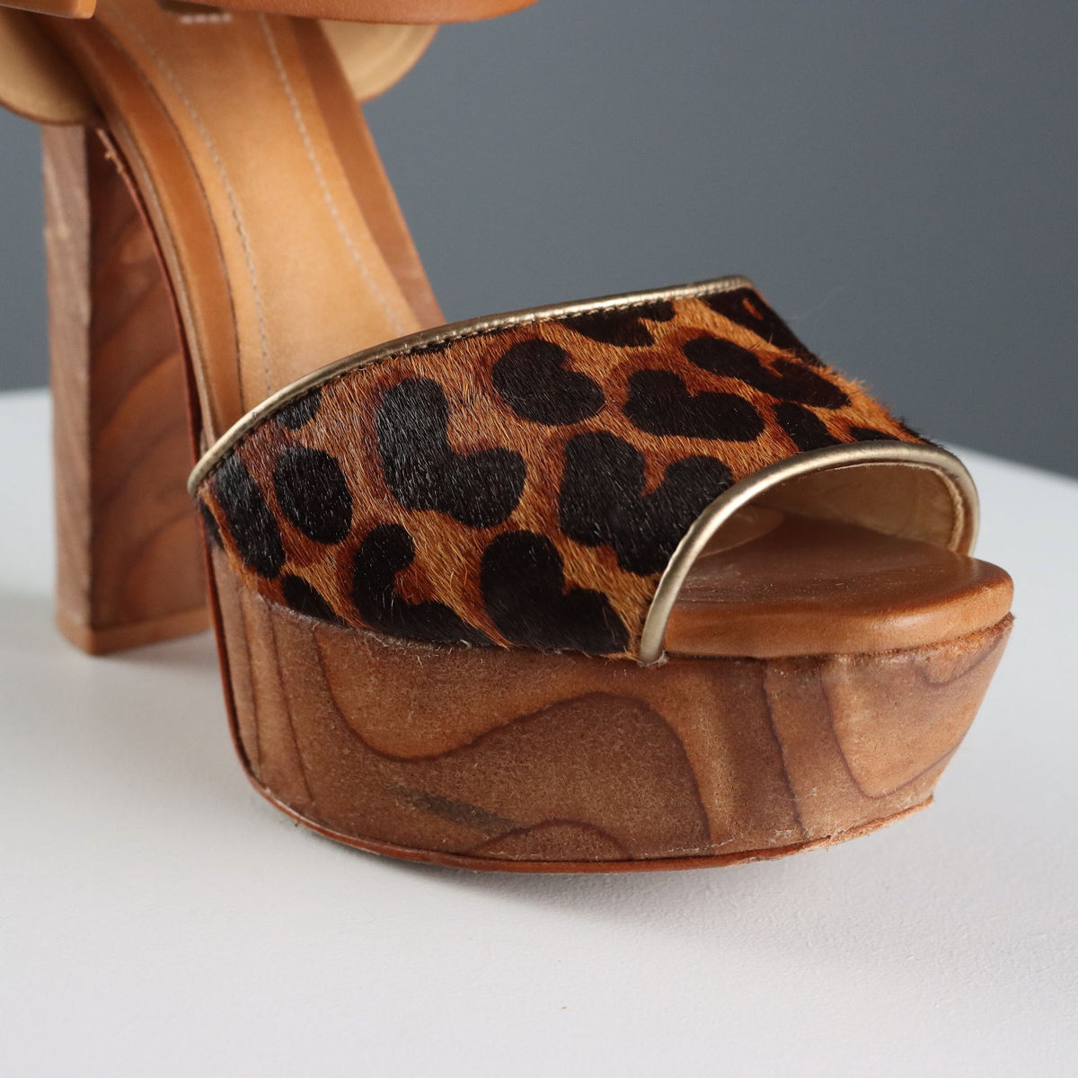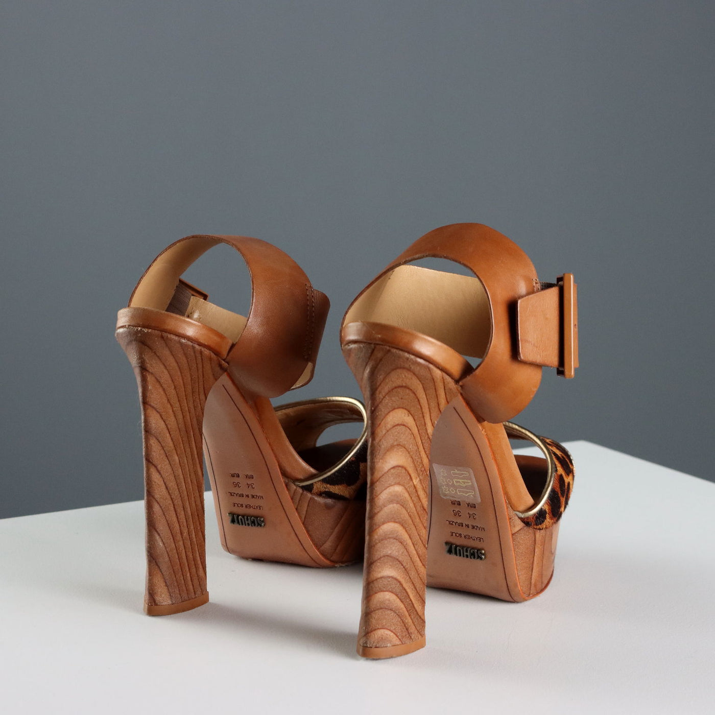 Sandals with wood-effect heel, in tan leather, with animal print pony skin band. Heel height: 13 cm. Platform height: 3 cm. Comes with dust bag. The item is in very good condition, with just a few signs of use. Second-hand, , vintage men's clothes, vintage lady's clothing, vintage scraves, 1950s trousers, 1950s skirts, 1960s skirts, second-hand, vintage trousers, 1980s skirts, used men's coat, used women's coats, used bags, second-hand bags, used clothes, vintage clothes, vintage shoes, 1960s scarf, 1950s scarf, 1940s scarf, vintage scarf, vintage men's hats, vintage women's hats, vintage bags, ancient hats.