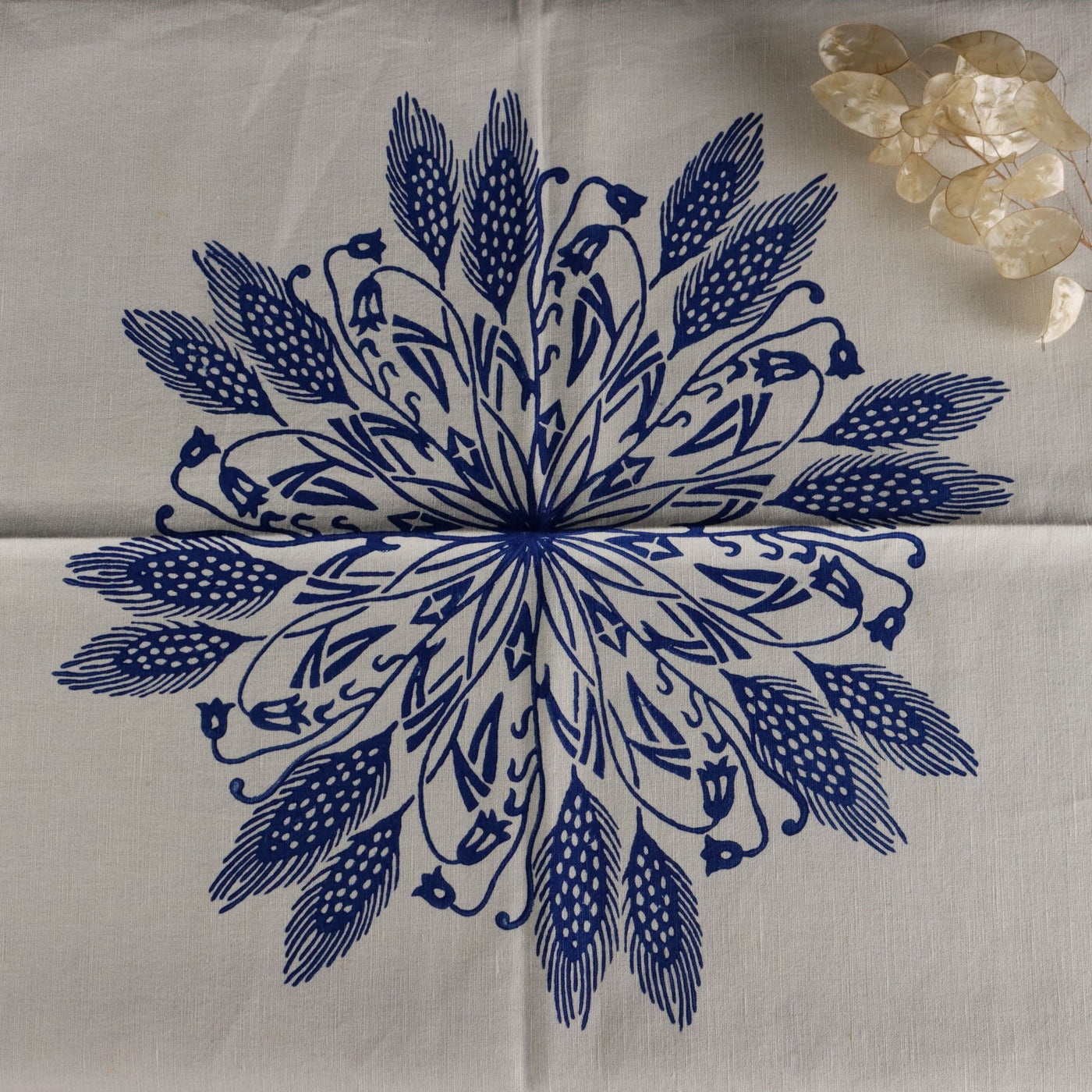Linen and cotton tablecloth with four napkins. Stamperia Brighettoni. Subject: ears of wheat. Tablecloth size: 124x120 cm Napkins size: 46x46 cm 1960s scarf, 1950s scarf, 1940s scarf, vintage scarf, vintage clothing, vintage clothes, ancient tablecloths, flax tablecloth, vintage bed sheets, handmade bed sheets, ancient bed sheets, silk dress, vintage clothes, 1800s clothing, 1700s clothing.