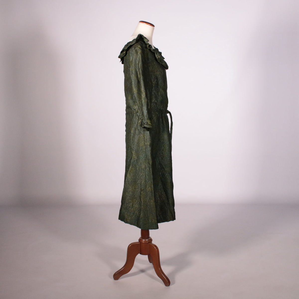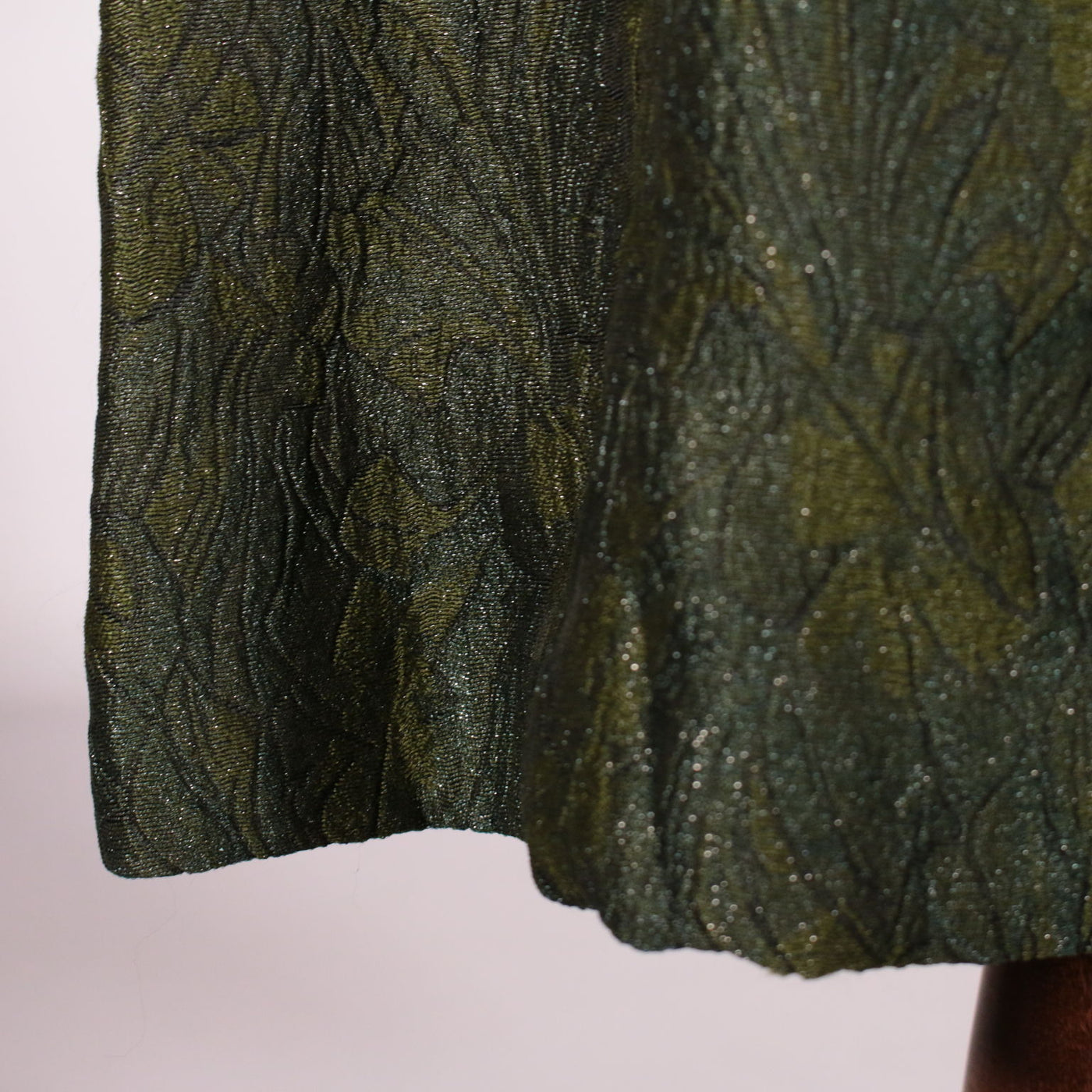 Vintage day dress, 1950s-1960s; jacquard iridescent fabric green and gold. Zipper on the back and waistbelt. Vintage, vintage scraves, vintage scarf, vintage ties, vintage men's hats, vintage women's hats, vintage 1970s clothes, vintage 1960s clothes, 1950s vintage clothes, 1940s vintage dresses, vintage women's clothing, vintage bags, vintage objects, vintage clothing, vintage clothes, vintage shoes, vintage handbag, vintage belt, vintage clothes, clothing, vintage elegant clothes, 1970s vintage clothes, 1960s vintage clothes, 1950s dresses, 1950s clothing, 1940s clothing, 1990s clothing, 1980s clothing, 1970s clothing, 1960s clothing, 2000s clothing.