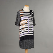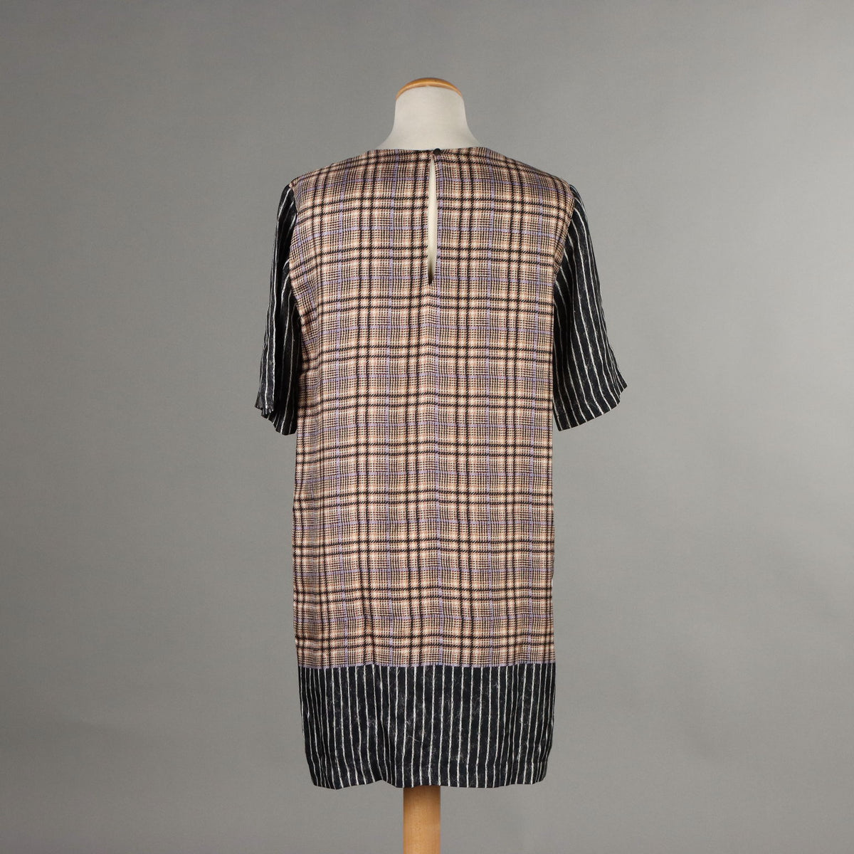 Tunic dress in pure patterned silk. The front side is characterized by a play of geometric prints, vertical and horizontal lines of various thicknesses, polka dots and diamonds; the back recalls the striped print of the front on the sleeves and bottom while, on the back, it features a Prince of Wales weave print. Second-hand, , vintage men's clothes, vintage lady's clothing, vintage scraves, 1950s trousers, 1950s skirts, 1960s skirts, second-hand, vintage trousers, 1980s skirts, used men's coat, used women's coats, used bags, second-hand bags, used clothes, vintage clothes, vintage shoes, 1960s scarf, 1950s scarf, 1940s scarf, vintage scarf, vintage men's hats, vintage women's hats, vintage bags, ancient hats.