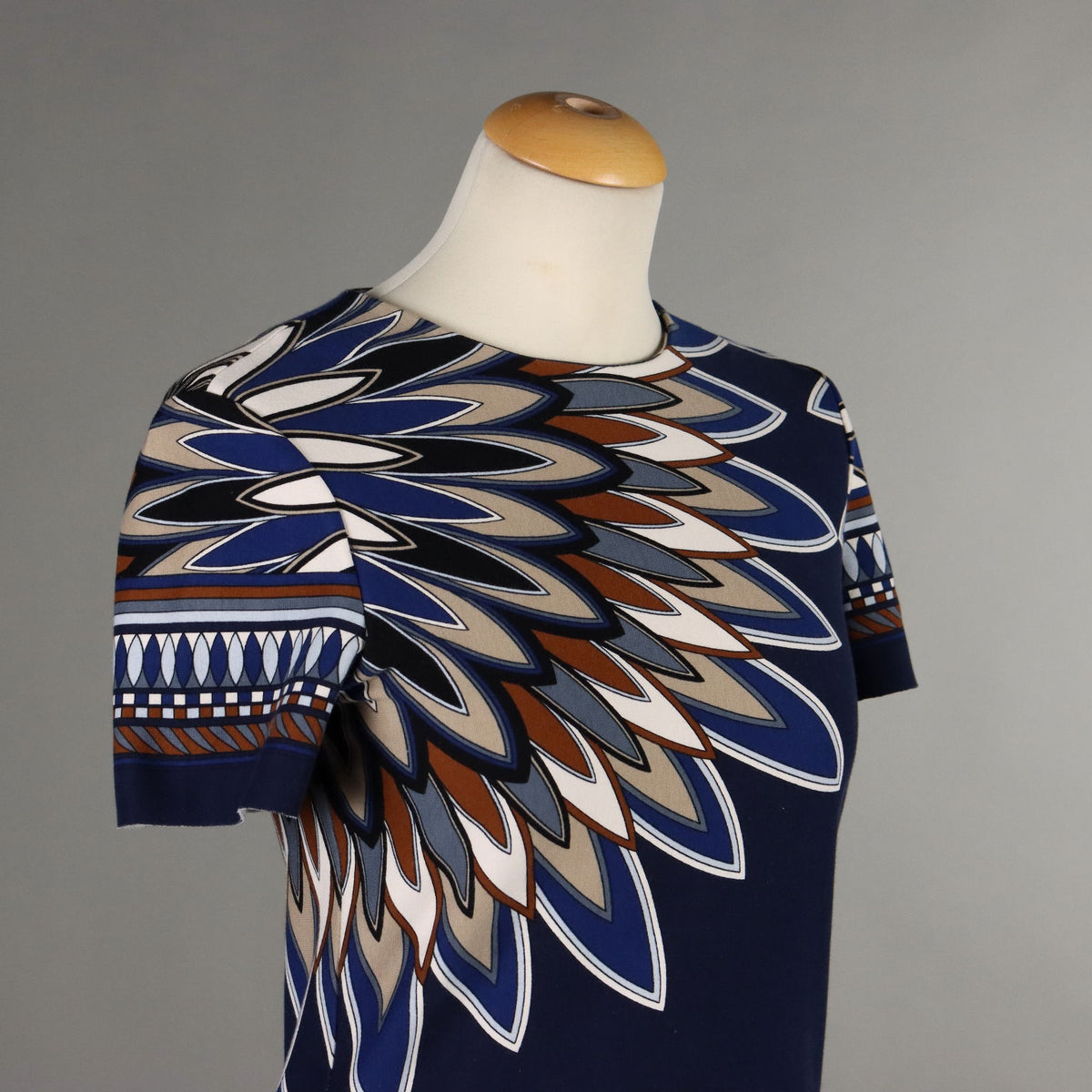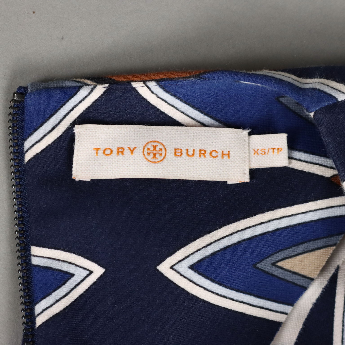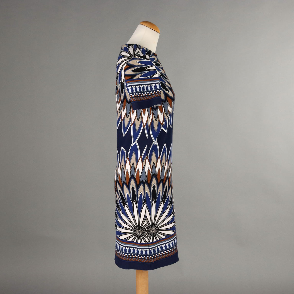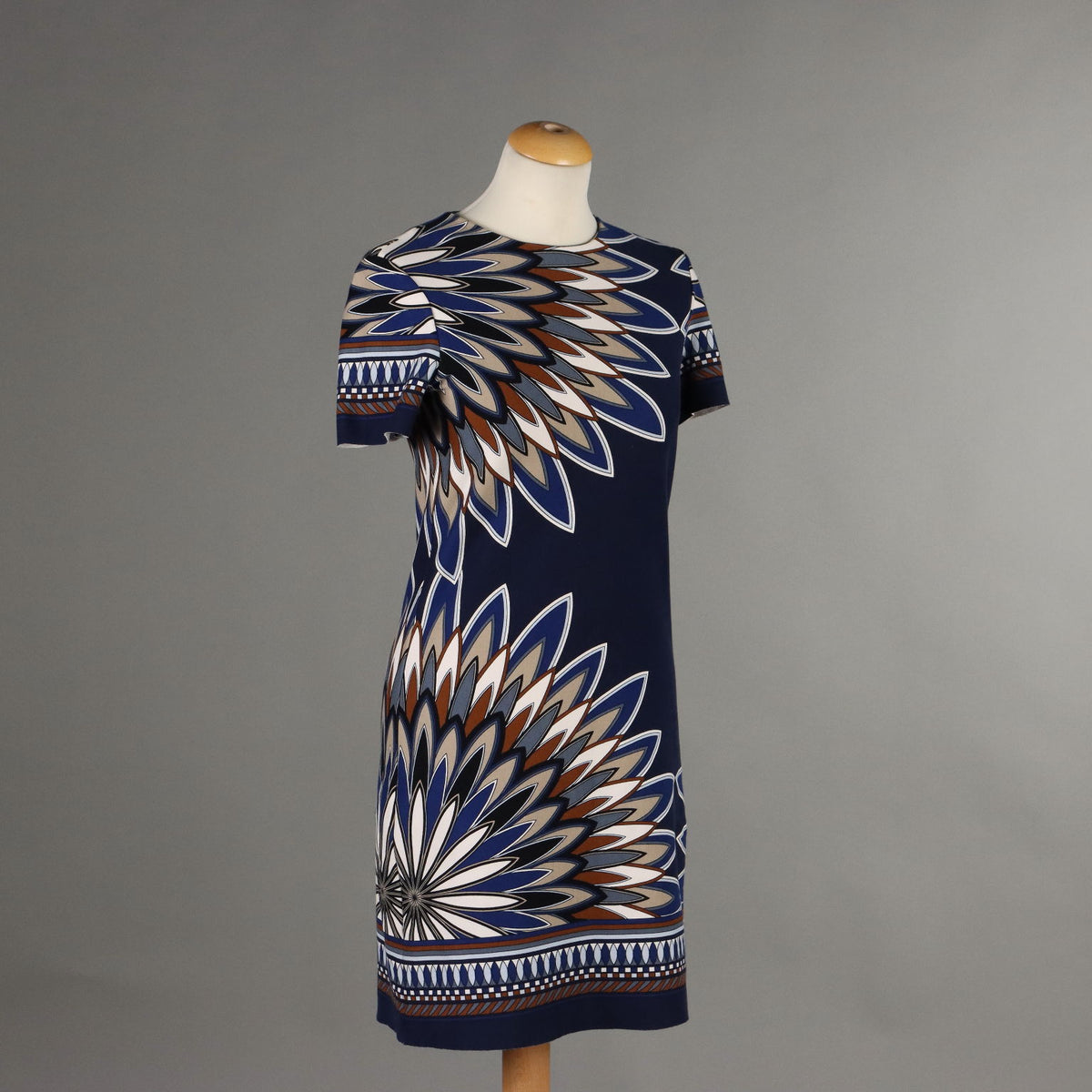 Short-sleeved dress, with a geometric print in shades of blue, white and brown. Crew-neck model, with zip on the back and raw cut. Tory Burch is an American designer and entrepreneur, who has had rapid success since launching her business in 2004, and has been awarded several times, most recently in 2023 as 'designer of the year'. Second-hand, , vintage men's clothes, vintage lady's clothing, vintage scraves, 1950s trousers, 1950s skirts, 1960s skirts, second-hand, vintage trousers, 1980s skirts, used men's coat, used women's coats, used bags, second-hand bags, used clothes, vintage clothes, vintage shoes, earrings with pendants, vintage earring, vintage men's hats, vintage women's hats, vintage objects, 1980s objects, 1970s objects, ancient hats.