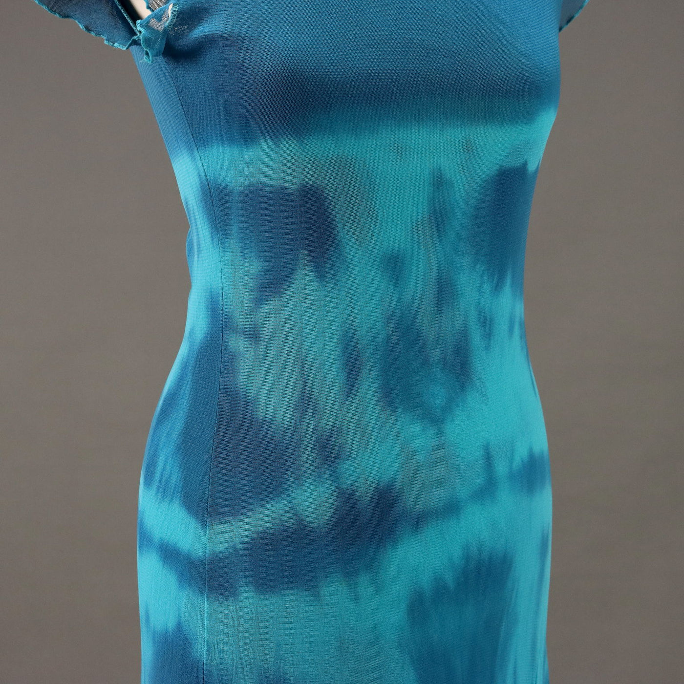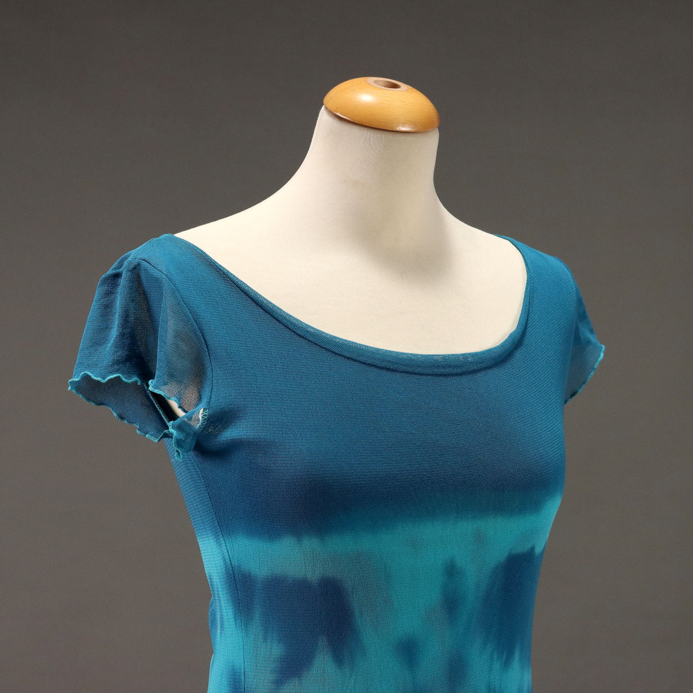 Original long dress in nylon mesh, with tie dye print in shades of turquoise blue. Second-hand, , vintage men's clothes, vintage lady's clothing, vintage scraves, 1950s trousers, 1950s skirts, 1960s skirts, second-hand, vintage trousers, 1980s skirts, used men's coat, used women's coats, used bags, second-hand bags, used clothes, vintage clothes, vintage shoes, 1960s scarf, 1950s scarf, 1940s scarf, vintage scarf, vintage men's hats, vintage women's hats, vintage bags, ancient hats.
