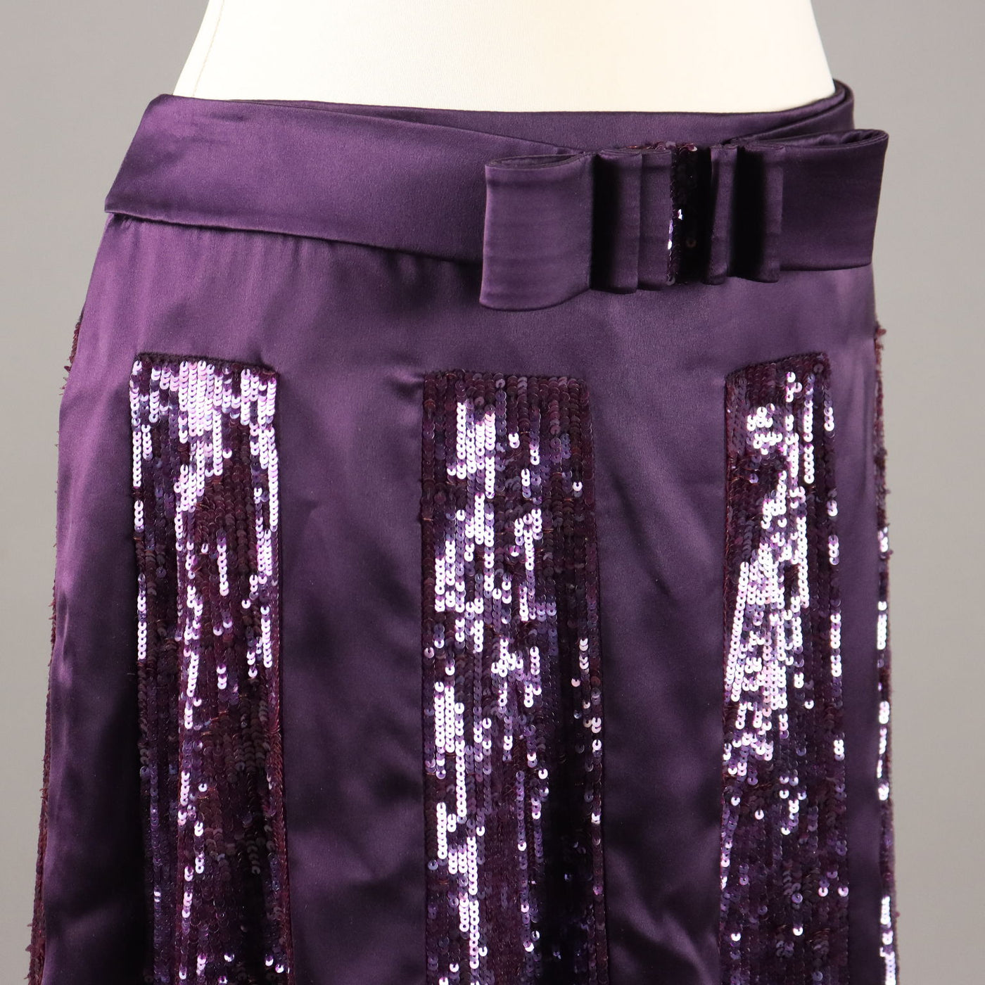 Elegant purple pure silk skirt with sequined bands. Waistband with bow. Zip on the side. Lined. The size indicated on the label is an American 8, which corresponds to an Italian 44. Waistline: 77 cm. Length: 54 cm. Second-hand, , vintage men's clothes, vintage lady's clothing, vintage scraves, 1950s trousers, 1950s skirts, 1960s skirts, second-hand, vintage trousers, 1980s skirts, used men's coat, used women's coats, used bags, second-hand bags, used clothes, vintage clothes, vintage shoes, 1960s scarf, 1950s scarf, 1940s scarf, vintage scarf, vintage men's hats, vintage women's hats, vintage bags, ancient hats.
