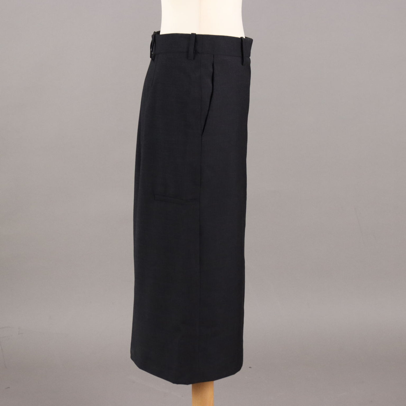 Elegant midi skirt in pure wool lined. Belt with belt loops, two inset pockets and a fake pocket on the right leg. Zip on the side and wide slit. Second-hand, , vintage men's clothes, vintage lady's clothing, vintage scraves, 1950s trousers, 1950s skirts, 1960s skirts, second-hand, vintage trousers, 1980s skirts, used men's coat, used women's coats, used bags, second-hand bags, used clothes, vintage clothes, vintage shoes, 1960s scarf, 1950s scarf, 1940s scarf, vintage scarf, vintage men's hats, vintage women's hats, vintage bags, ancient hats.