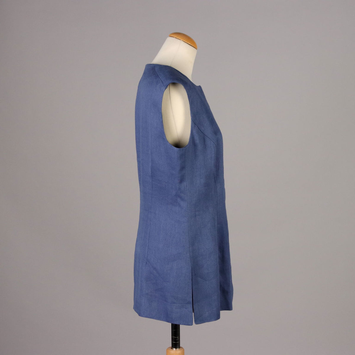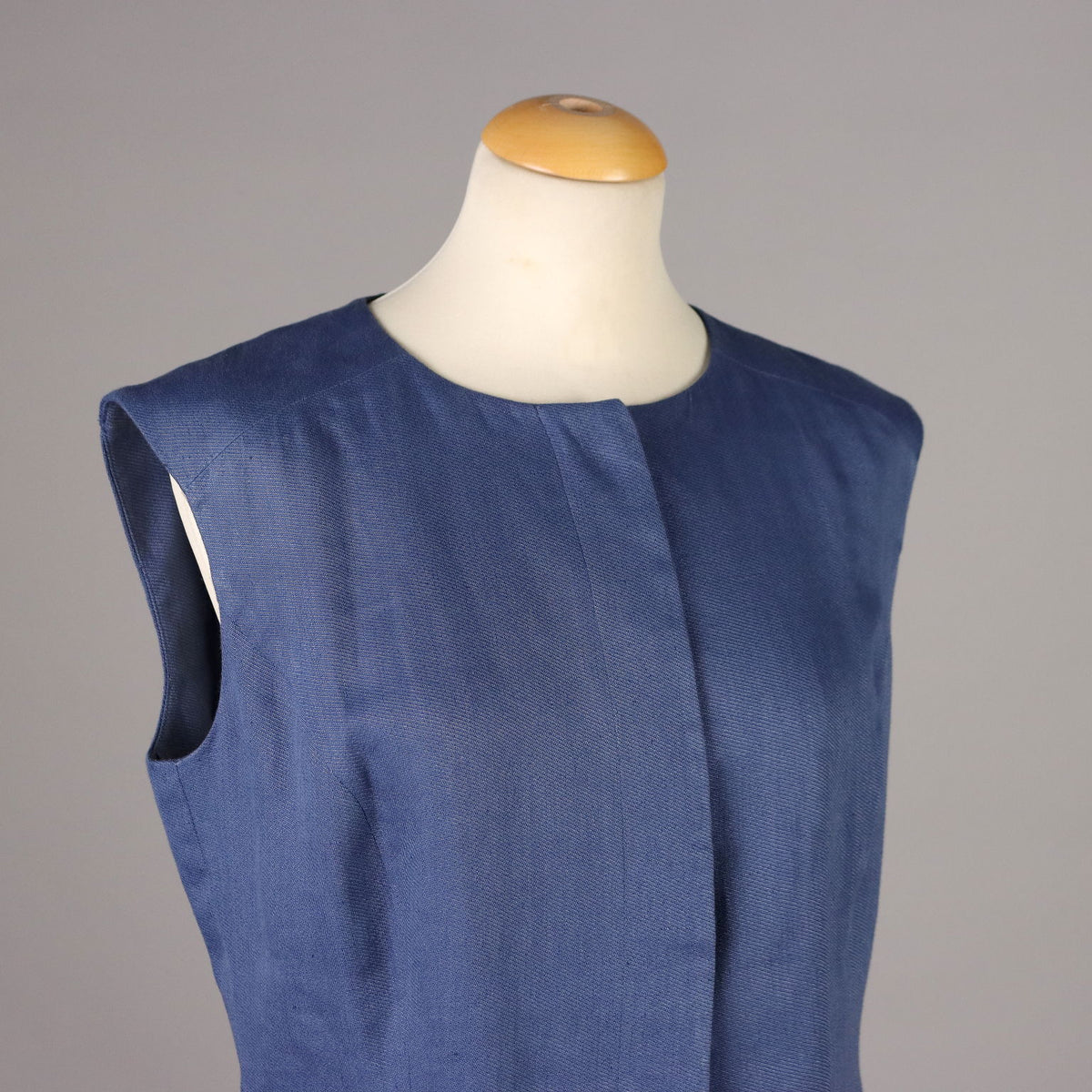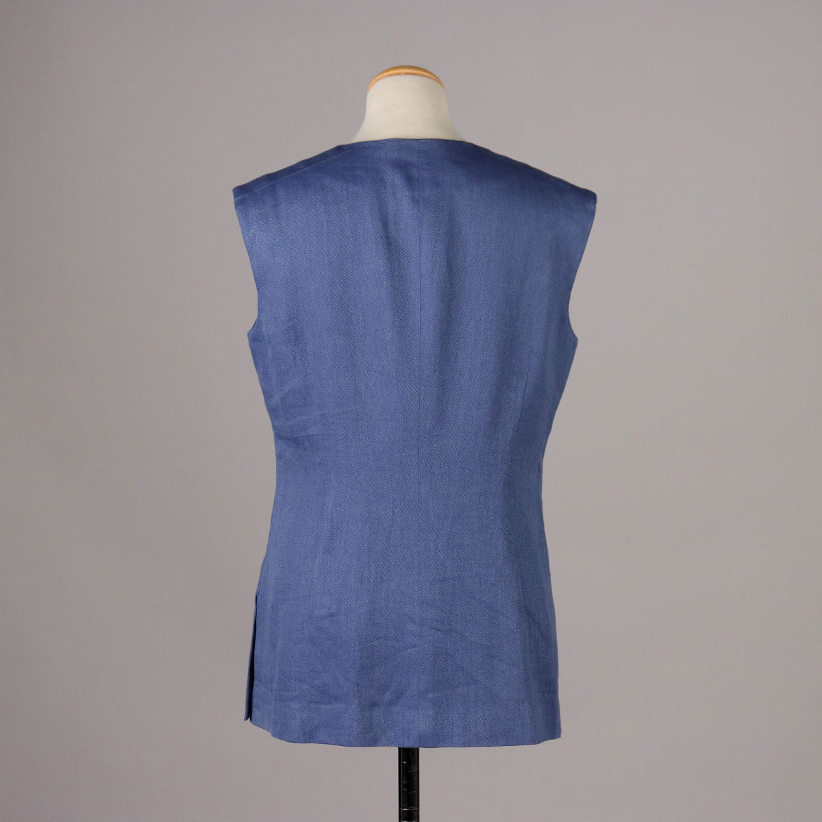 Waistcoat in a linen and cotton blend, in a beautiful shade of classic blue. The central buttoning remains hidden by the placket. Silk lined. Second-hand, , vintage men's clothes, vintage lady's clothing, vintage scraves, 1950s trousers, 1950s skirts, 1960s skirts, second-hand, vintage trousers, 1980s skirts, used men's coat, used women's coats, used bags, second-hand bags, used clothes, vintage clothes, vintage shoes, clothing, 1990s shoes, 1980s shoes, 1970s shoes, 1960s shoes, 1950s shoes.
