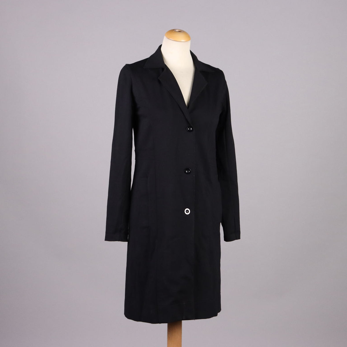 Overcoat in viscose blend, with a simple line but with an excellent fit, it is in fact slightly elasticised. It features a single-breasted button placket, two pockets and exposed overlock stitching details. Perfect garment for spring or autumn outfits. Second-hand, , vintage men's clothes, vintage lady's clothing, vintage scraves, 1950s trousers, 1950s skirts, 1960s skirts, second-hand, vintage trousers, 1980s skirts, used men's coat, used women's coats, used bags, second-hand bags, used clothes, vintage clothes, vintage shoes, clothing, 1990s shoes, 1980s shoes, 1970s shoes, 1960s shoes, 1950s shoes.