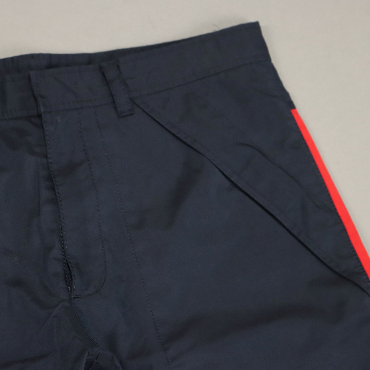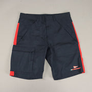 Men's Bermuda shorts from the Prada Luna Rossa line, created in 1997, on the occasion of the Luna Rossa team's participation in the 30th edition of the America's Cup. The item is made of midnight blue technical fabric, with red inserts and has two front pockets and one side. The interior is lined in mesh fabric. Equipped with belt loops. Second-hand, , vintage men's clothes, vintage lady's clothing, vintage scraves, 1950s trousers, 1950s skirts, 1960s skirts, second-hand, vintage trousers, 1980s skirts, used men's coat, used women's coats, used bags, second-hand bags, used clothes, vintage clothes, vintage shoes, 1960s scarf, 1950s scarf, 1940s scarf, vintage scarf, vintage men's hats, vintage women's hats, vintage bags, ancient hats.