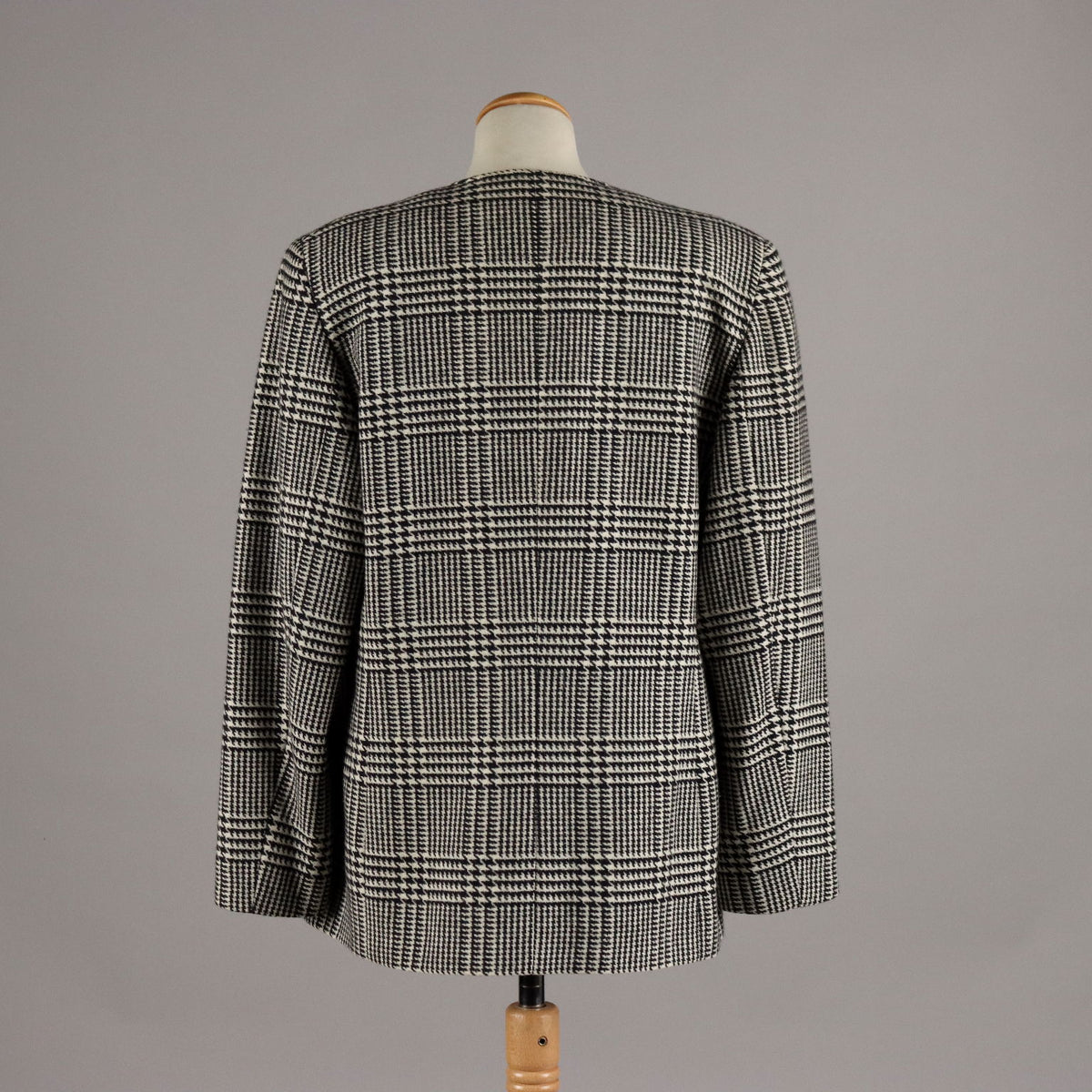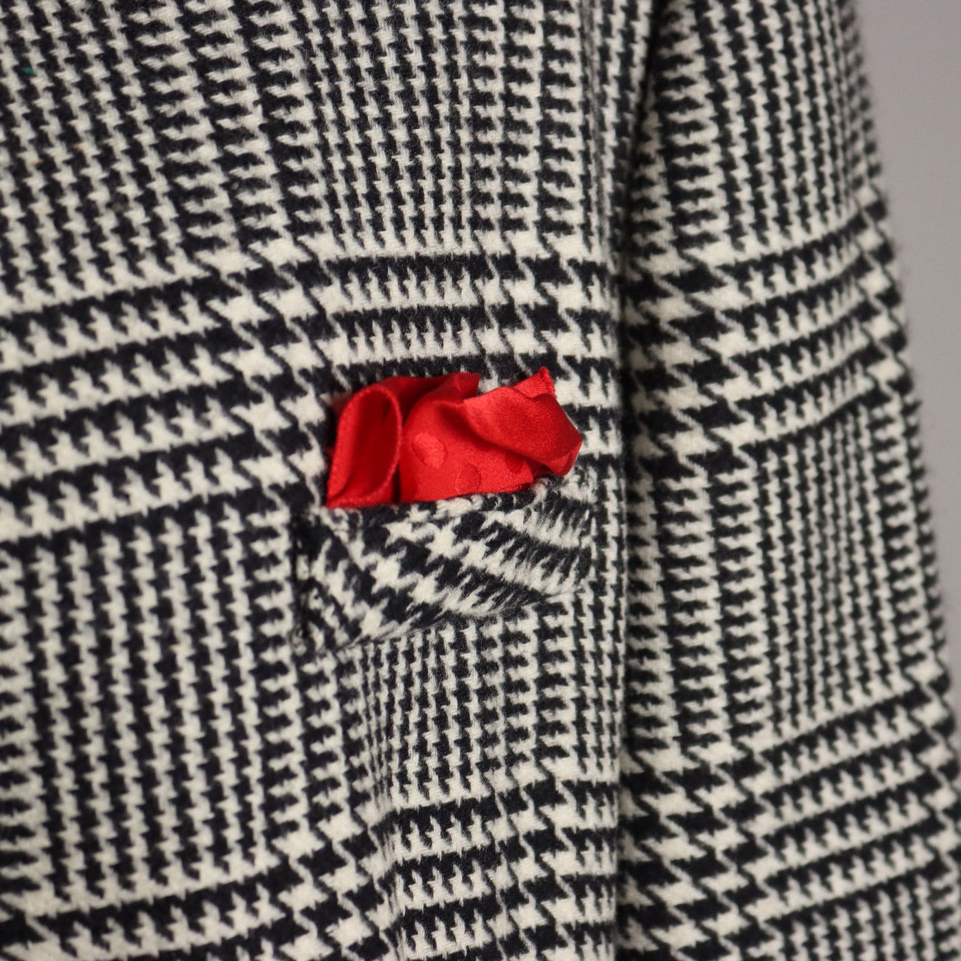 Jacket in pure wool with black and white houndstooth checks. The line is typically 80s, with wide shoulders and four button closure. Fits today's Italian size 50/52 (length 72 cm, shoulders 46 cm, waistline 99 cm, sleeves 62 cm). Vintage, vintage scraves, vintage scarf, vintage ties, vintage men's hats, vintage women's hats, vintage 1970s clothes, vintage 1960s clothes, 1950s vintage clothes, 1940s vintage dresses, vintage women's clothing, vintage bags, vintage objects, vintage clothing, vintage clothes, vintage shoes, vintage handbag, vintage belt, vintage clothes, clothing, vintage elegant clothes, 1970s vintage clothes, 1960s vintage clothes, 1950s dresses, 1950s clothing, 1940s clothing, 1990s clothing, 1980s clothing, 1970s clothing, 1960s clothing, 2000s clothing.