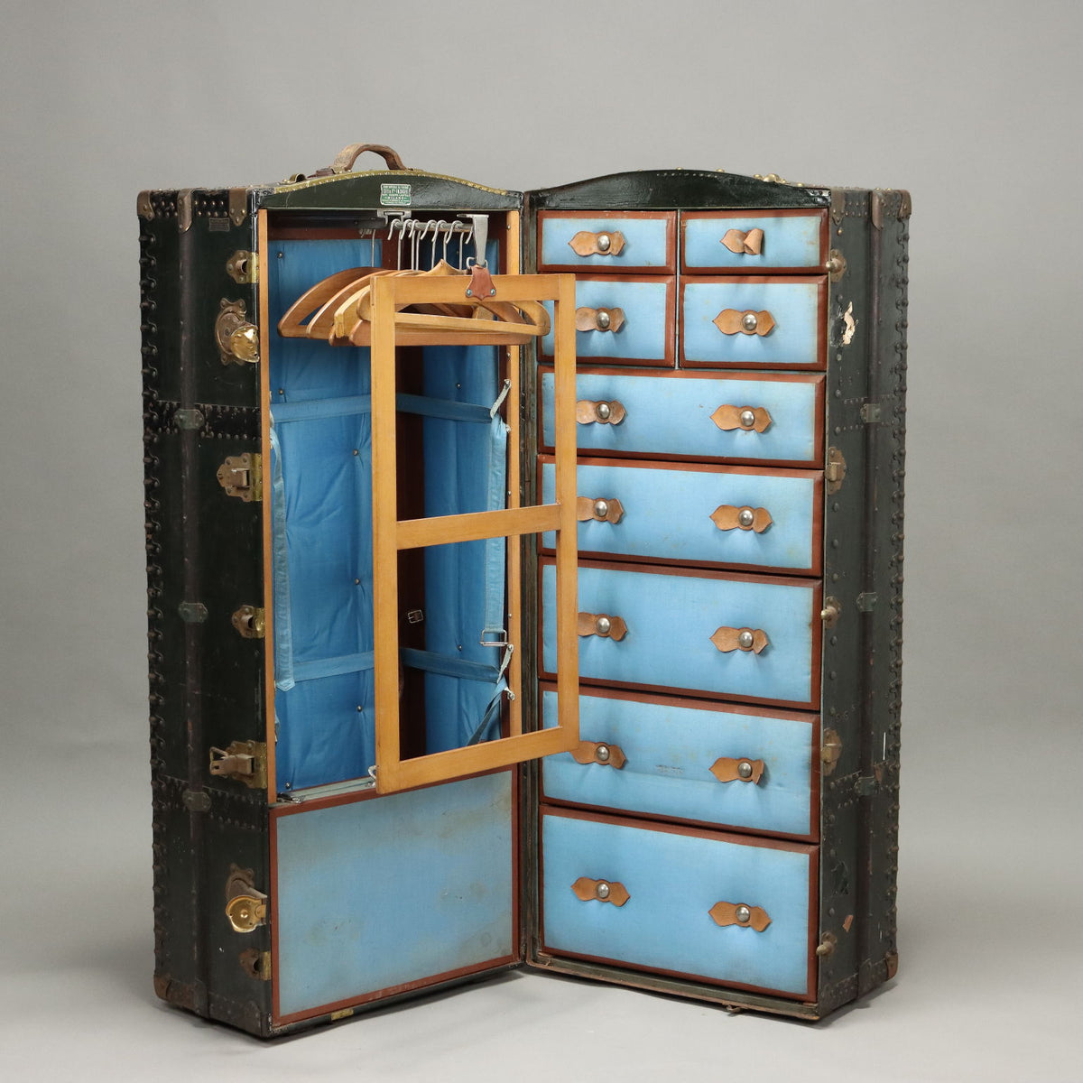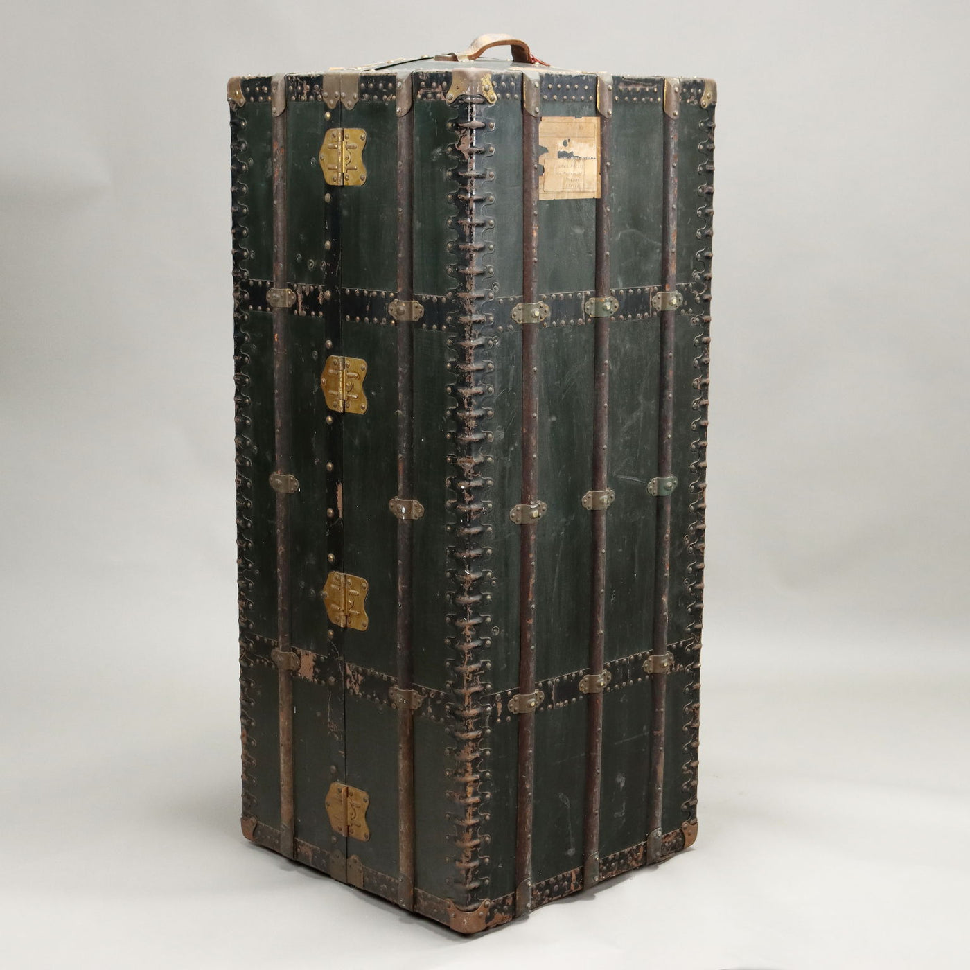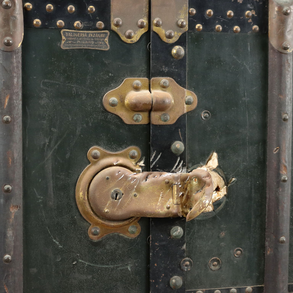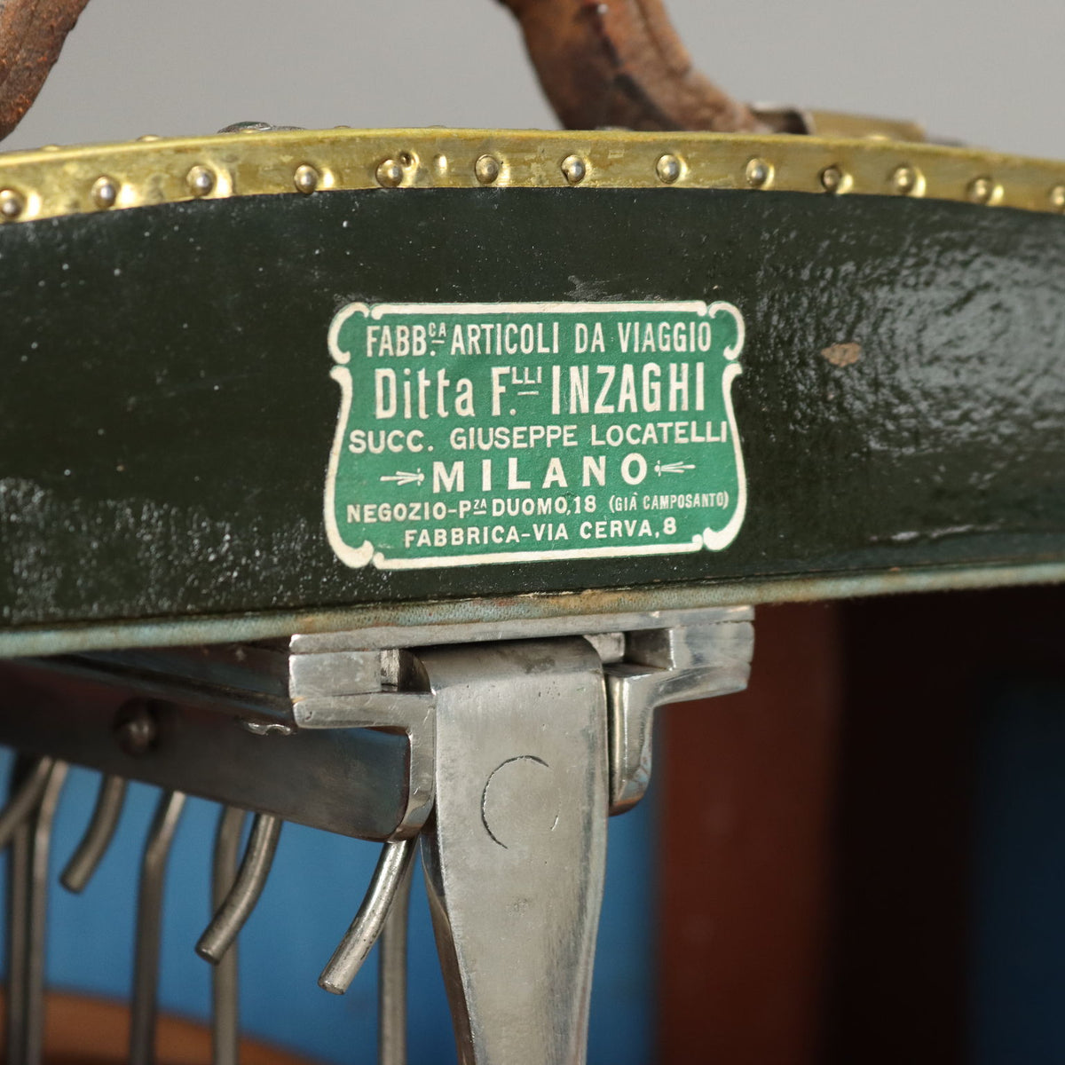 Wardrobe trunk Valigeria Inzaghi Milano, contains all its accessories, drawers, shoe racks, coat hangers, all covered in blue fabric. On the outside, green faux leather covering with metal corners with reinforcing studs. A label inside says 'Fabb.ca articoli da viaggio, Ditta F.lli Inzaghi, succ. Giuseppe Locatelli, Milan, shop p-zza Duomo 18 (formerly camposanto), factory via cerva 8' external label "Valigeria Inzaghi, Fabbrica articoli da viaggio, Milan, piazza Camposanto, via arcivescovado. Vintage, vintage scraves, vintage scarf, vintage ties, vintage men's hats, vintage women's hats, vintage 1970s clothes, vintage 1960s clothes, 1950s vintage clothes, 1940s vintage dresses, vintage women's clothing, vintage bags, vintage objects, vintage clothing, vintage clothes, vintage shoes, vintage handbag, vintage belt, vintage clothes, suitcases, , used bags, second-hand bags, 1980s objects, 1970s objects, vintage dress, trunk.