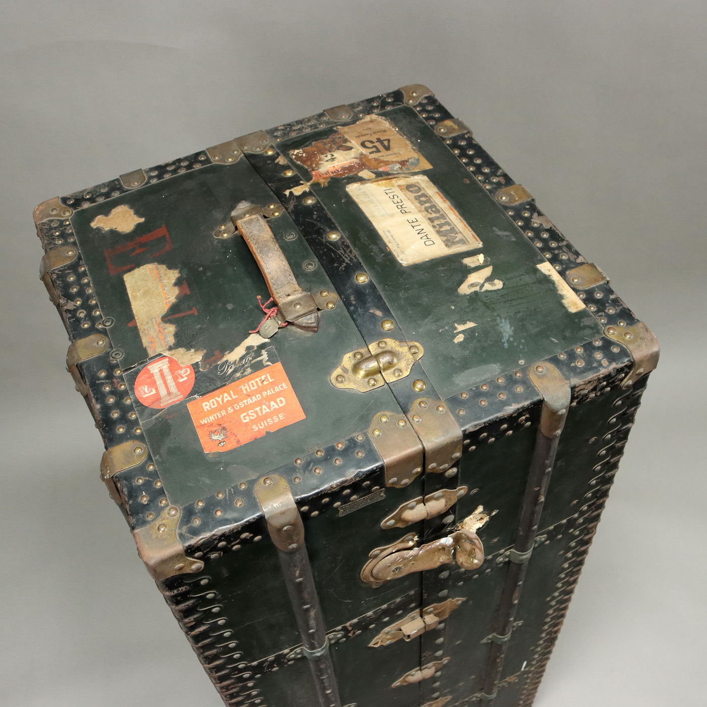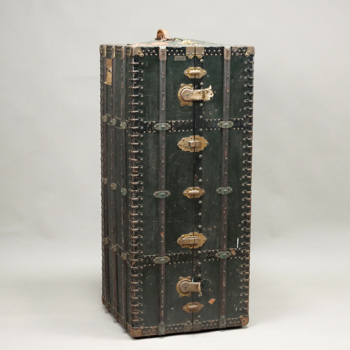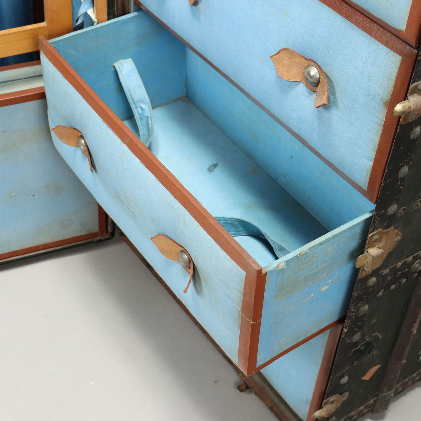 Wardrobe trunk Valigeria Inzaghi Milano, contains all its accessories, drawers, shoe racks, coat hangers, all covered in blue fabric. On the outside, green faux leather covering with metal corners with reinforcing studs. A label inside says 'Fabb.ca articoli da viaggio, Ditta F.lli Inzaghi, succ. Giuseppe Locatelli, Milan, shop p-zza Duomo 18 (formerly camposanto), factory via cerva 8' external label "Valigeria Inzaghi, Fabbrica articoli da viaggio, Milan, piazza Camposanto, via arcivescovado. Vintage, vintage scraves, vintage scarf, vintage ties, vintage men's hats, vintage women's hats, vintage 1970s clothes, vintage 1960s clothes, 1950s vintage clothes, 1940s vintage dresses, vintage women's clothing, vintage bags, vintage objects, vintage clothing, vintage clothes, vintage shoes, vintage handbag, vintage belt, vintage clothes, suitcases, , used bags, second-hand bags, 1980s objects, 1970s objects, vintage dress, trunk.