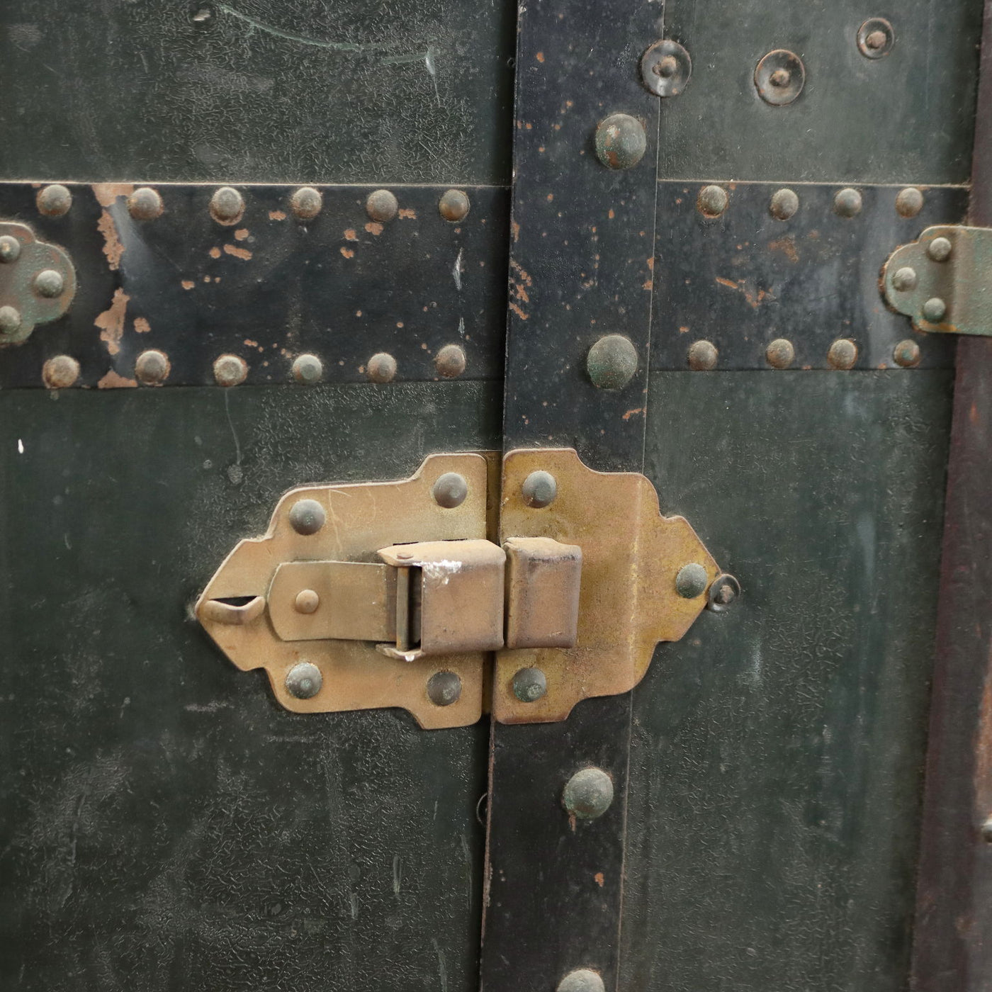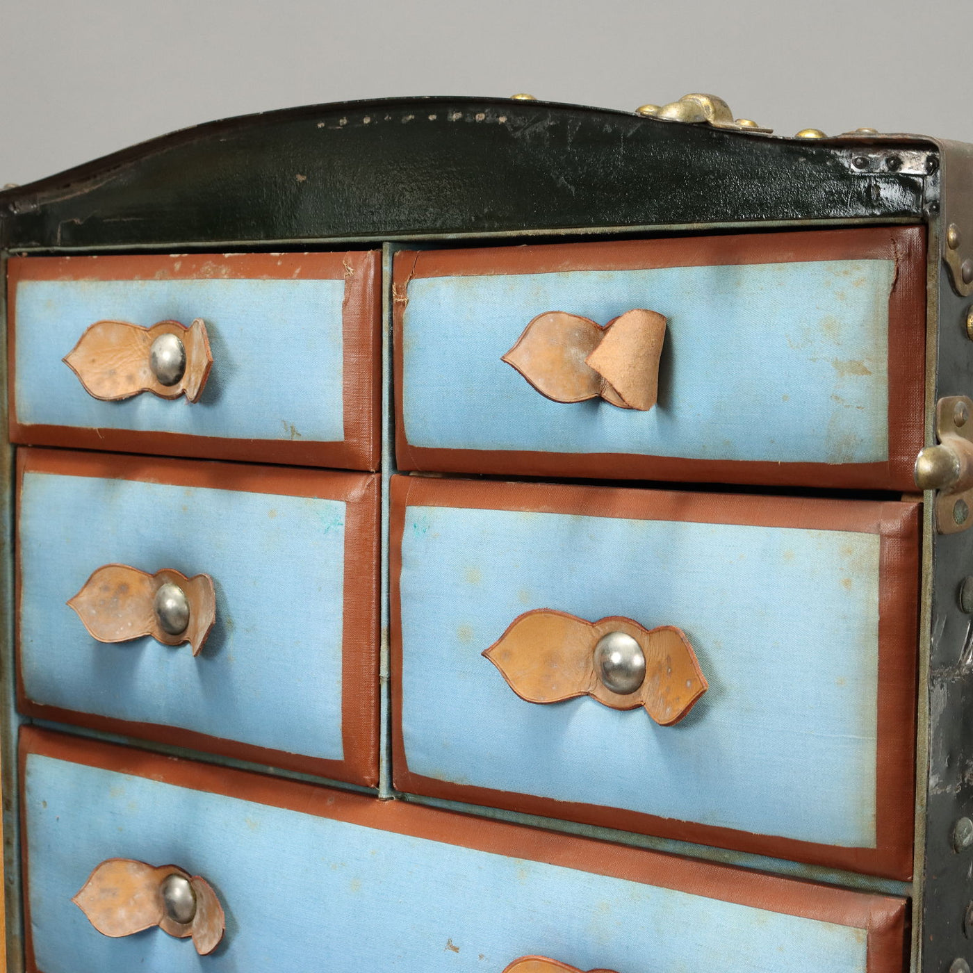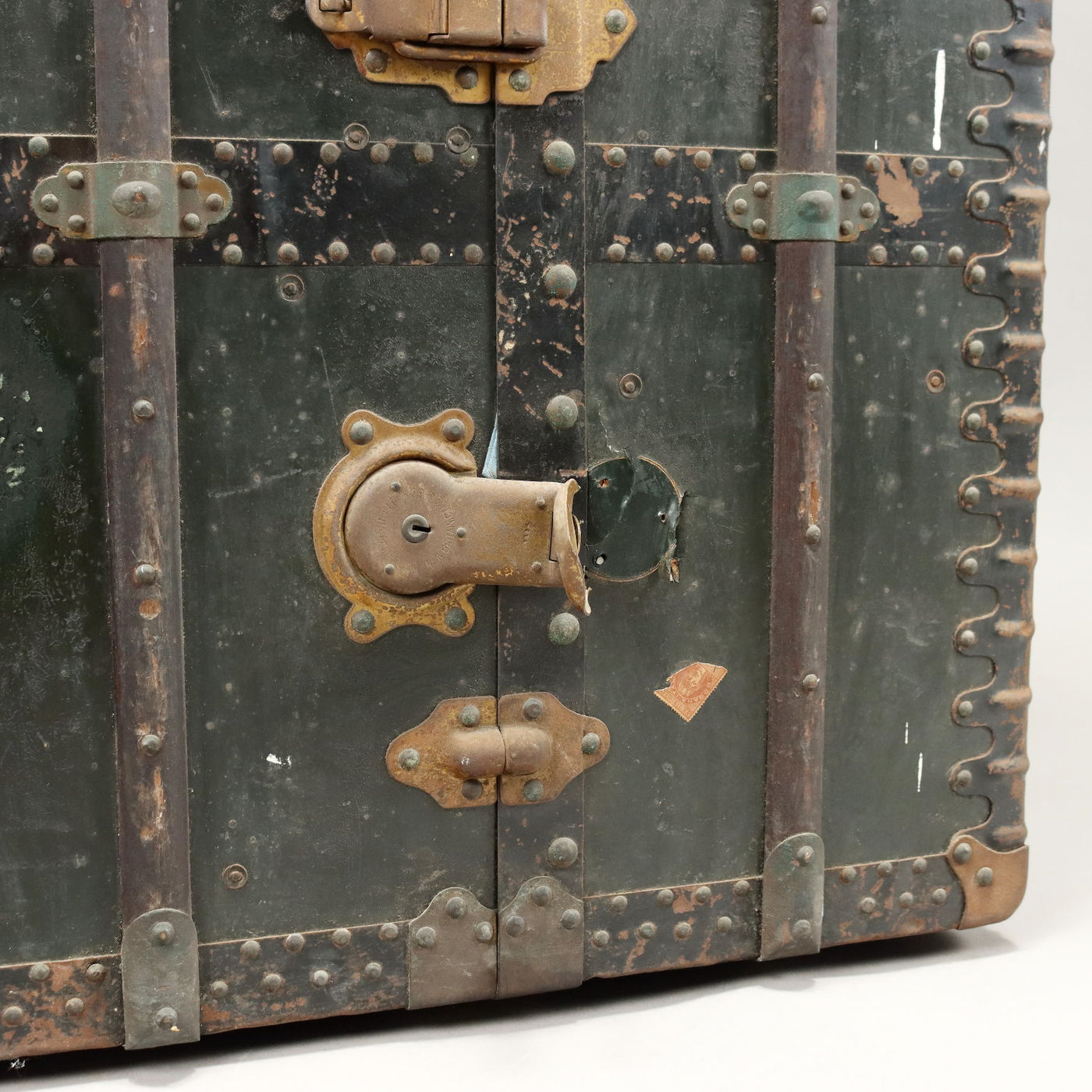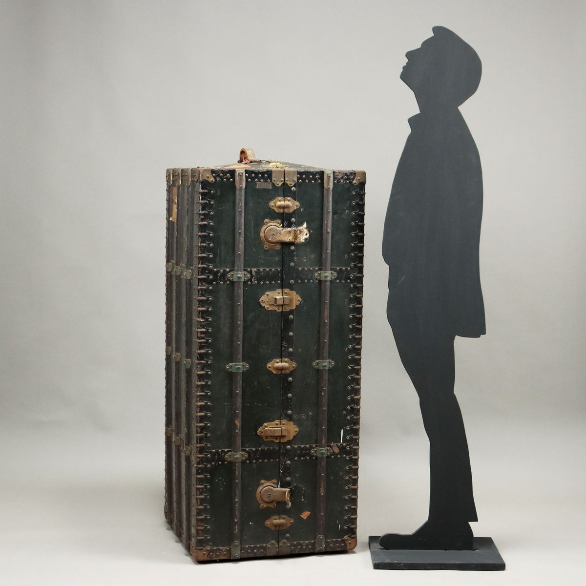 Wardrobe trunk Valigeria Inzaghi Milano, contains all its accessories, drawers, shoe racks, coat hangers, all covered in blue fabric. On the outside, green faux leather covering with metal corners with reinforcing studs. A label inside says 'Fabb.ca articoli da viaggio, Ditta F.lli Inzaghi, succ. Giuseppe Locatelli, Milan, shop p-zza Duomo 18 (formerly camposanto), factory via cerva 8' external label "Valigeria Inzaghi, Fabbrica articoli da viaggio, Milan, piazza Camposanto, via arcivescovado. Vintage, vintage scraves, vintage scarf, vintage ties, vintage men's hats, vintage women's hats, vintage 1970s clothes, vintage 1960s clothes, 1950s vintage clothes, 1940s vintage dresses, vintage women's clothing, vintage bags, vintage objects, vintage clothing, vintage clothes, vintage shoes, vintage handbag, vintage belt, vintage clothes, suitcases, , used bags, second-hand bags, 1980s objects, 1970s objects, vintage dress, trunk.