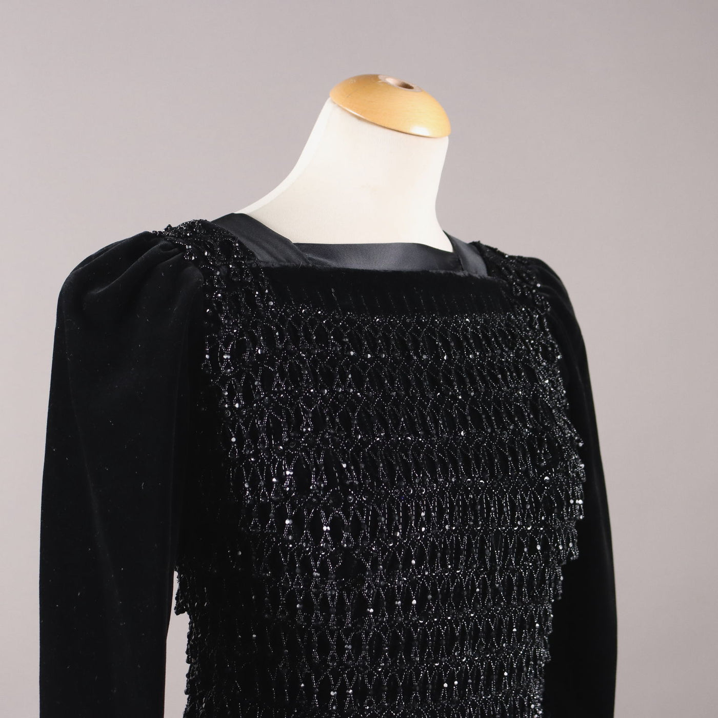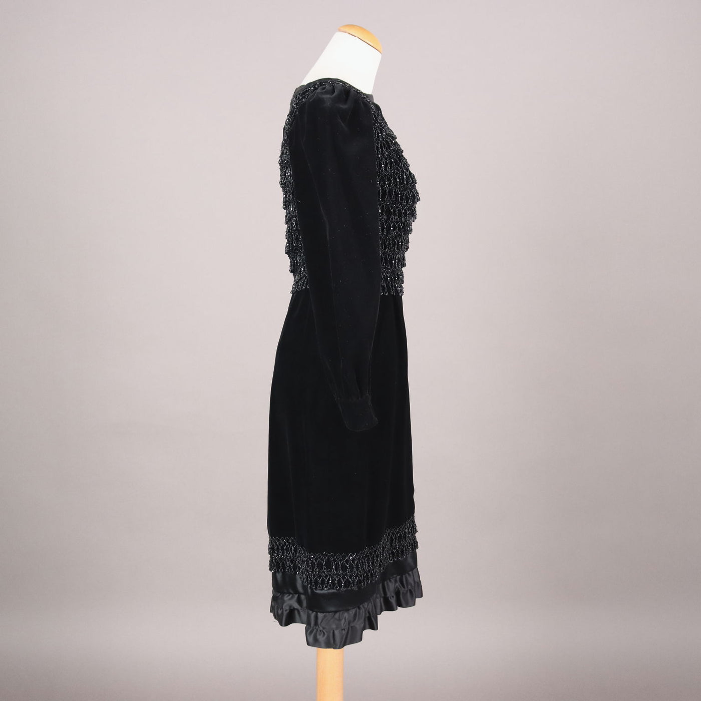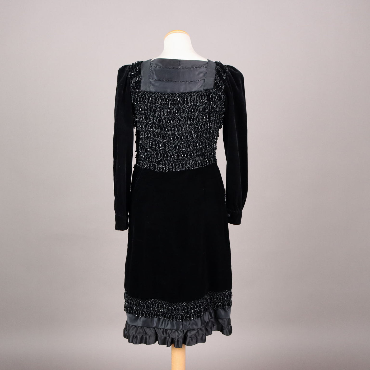 Tailored cocktail dress dating back to the 40s. It is in black velvet with a hand-embroidered bodice with beads, final satin flounce. Fits size small: length 104 cm, shoulders 44 cm, waist 80 cm. Vintage, vintage scraves, vintage scarf, vintage ties, vintage men's hats, vintage women's hats, vintage 1970s clothes, vintage 1960s clothes, 1950s vintage clothes, 1940s vintage dresses, vintage women's clothing, vintage bags, vintage objects, vintage clothing, vintage clothes, vintage shoes, vintage handbag, vintage belt, vintage clothes, accessories, earrings with pendants, vintage earring, 1960s scarf, 1950s scarf, 1940s scarf, 1980s objects, 1970s objects, vintage necklace.