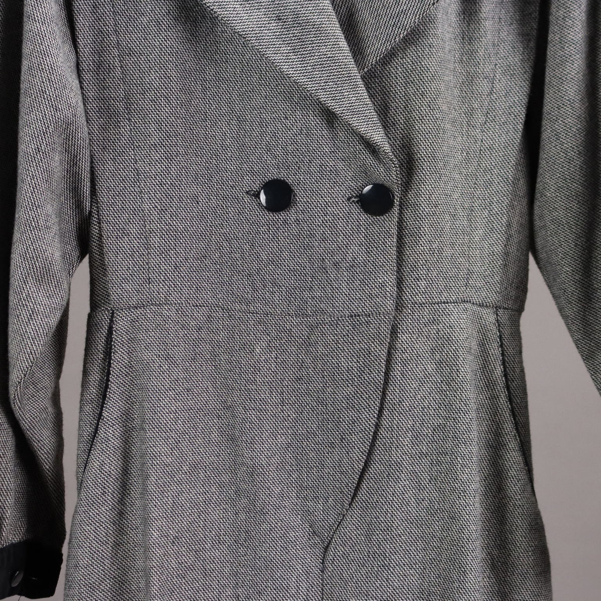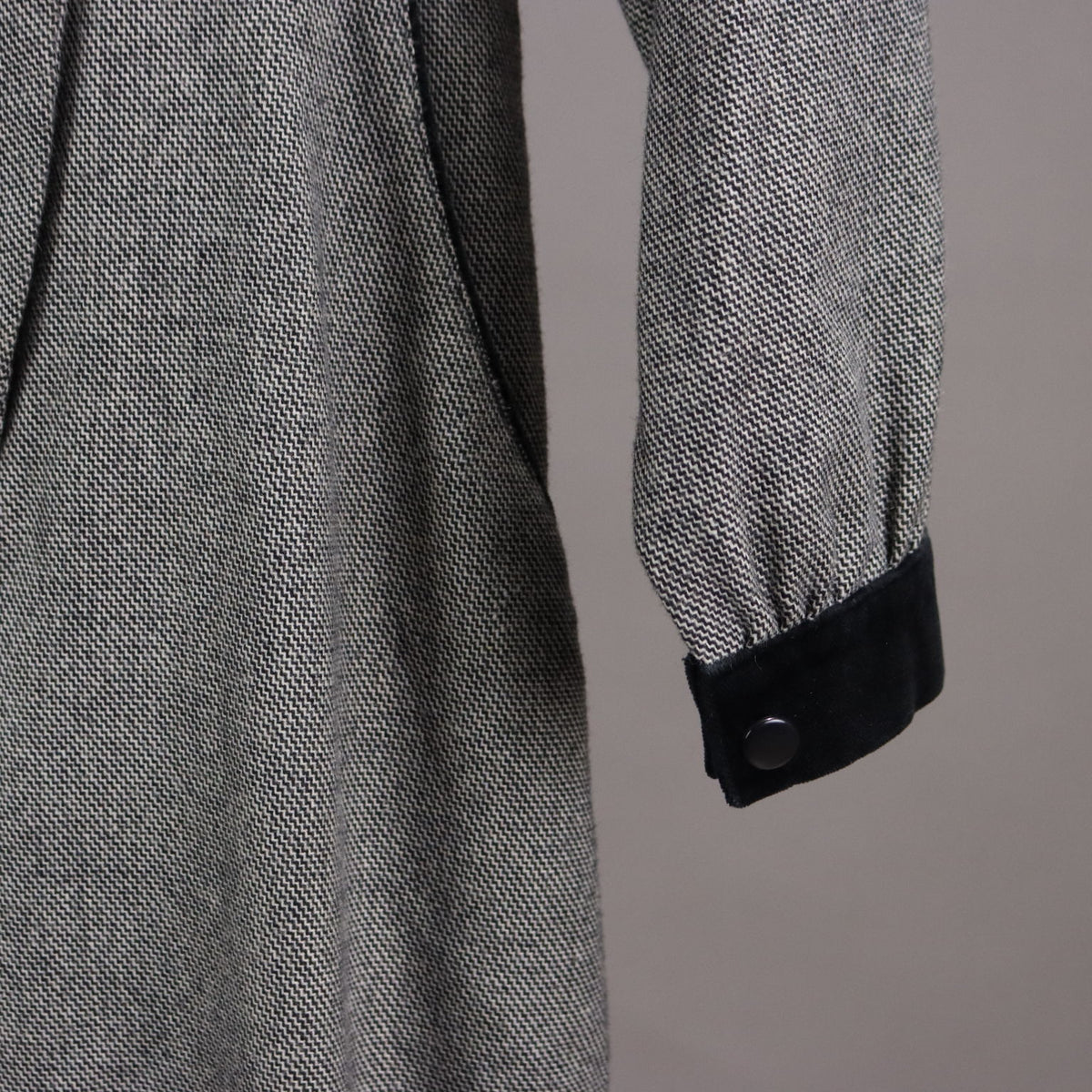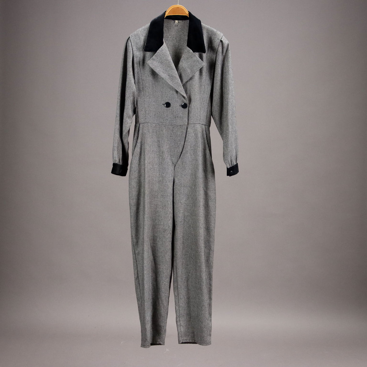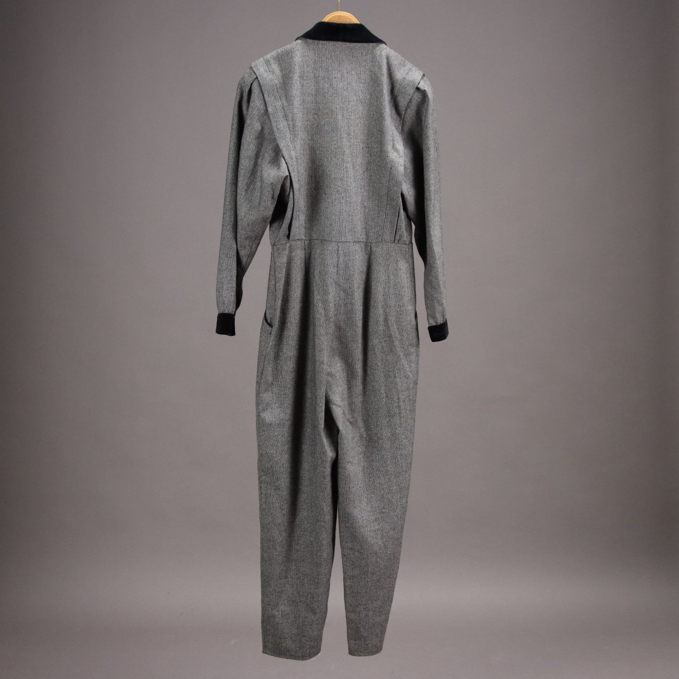 Tailored jumpsuit dating back to the 80s and 90s. It is in a wool blend worked with black and white thread, has a velvet collar and cuffs. It wears a size 44: length 145 cm, trouser length 98 cm, waist 77 cm. Vintage, vintage scraves, vintage scarf, vintage ties, vintage men's hats, vintage women's hats, vintage 1970s clothes, vintage 1960s clothes, 1950s vintage clothes, 1940s vintage dresses, vintage women's clothing, vintage bags, vintage objects, vintage clothing, vintage clothes, vintage shoes, vintage handbag, vintage belt, vintage clothes, accessories, earrings with pendants, vintage earring, 1960s scarf, 1950s scarf, 1940s scarf, 1980s objects, 1970s objects, vintage necklace.