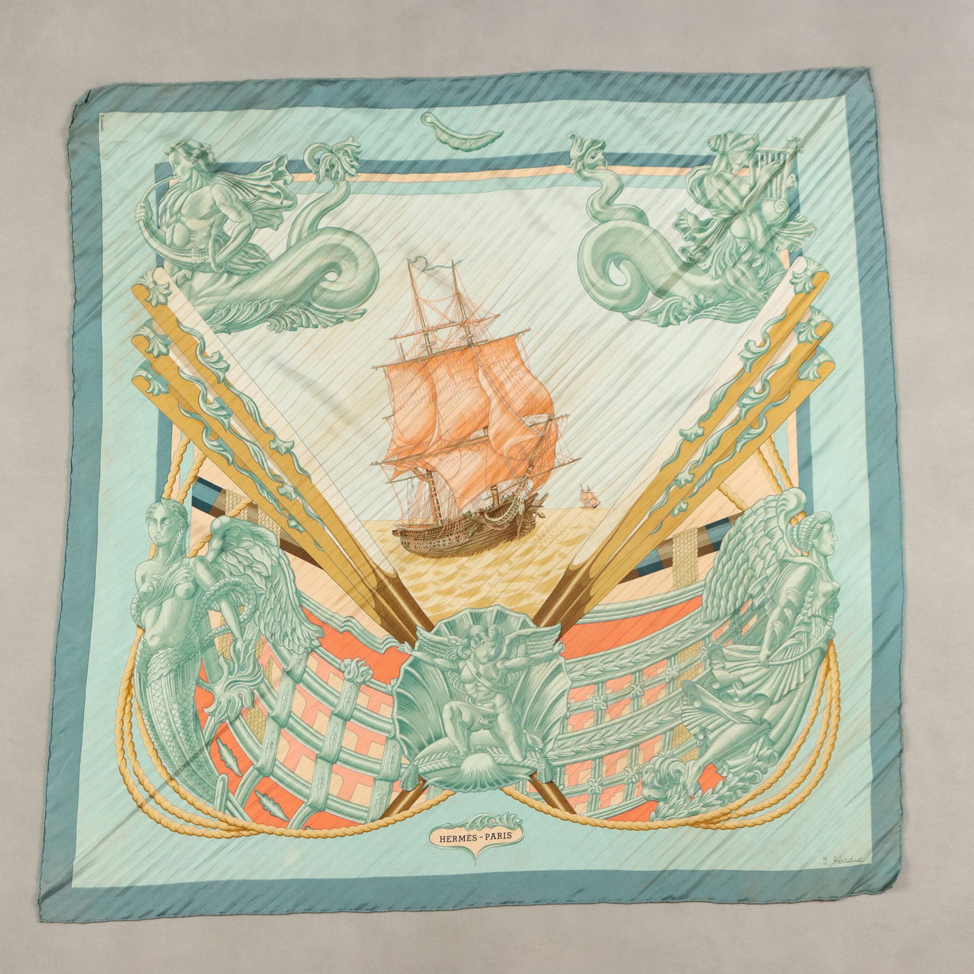 Hermès pure silk scarf with pleated detailing. Designed by Julie Abadie in shades of aquamarine and coral, with a nautical theme. It is in good condition, despite a small smudge in the center that does not preclude its use. Vintage, vintage scraves, vintage scarf, vintage ties, vintage men's hats, vintage women's hats, vintage 1970s clothes, vintage 1960s clothes, 1950s vintage clothes, 1940s vintage dresses, vintage women's clothing, vintage bags, vintage objects, vintage clothing, vintage clothes, vintage shoes, vintage handbag, vintage belt, vintage clothes, clothing, vintage elegant clothes, 1970s vintage clothes, 1960s vintage clothes, 1950s dresses, 1950s clothing, 1940s clothing, 1990s clothing, 1980s clothing, 1970s clothing, 1960s clothing, 2000s clothing.